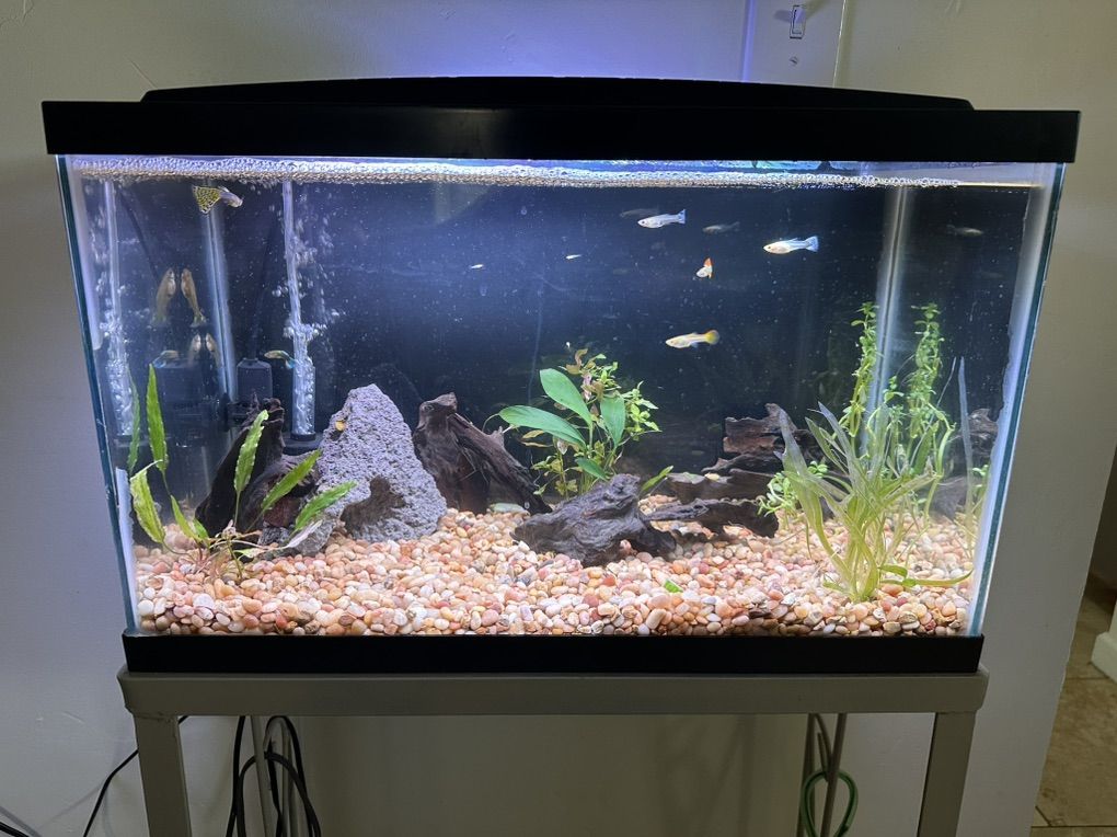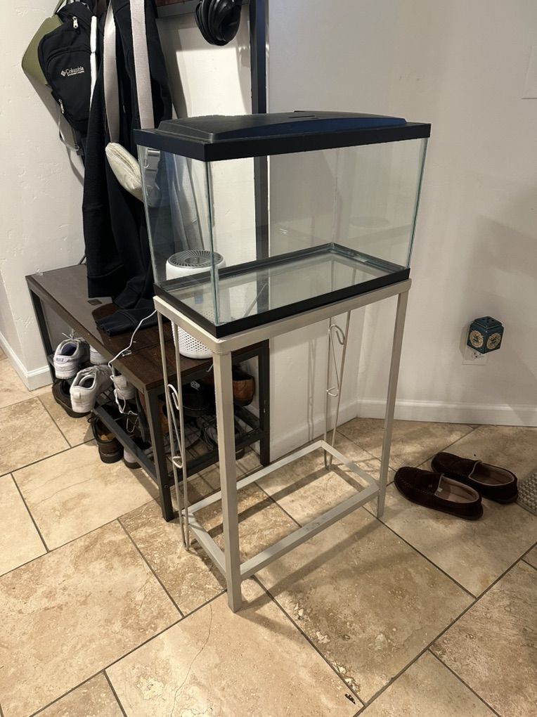 10 Gallon tank with stand. Fish and decor not included. I can add a couple of pieces of drift wood. Tank includes a lid as well.