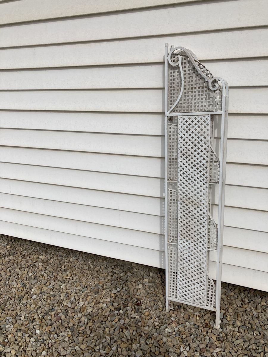 VenmoHeavy wrought iron foldable plant stand. Made to sit in a corner. Measures about 58” tall and each side is about 12”. Top shelf has some paint chipped off. Check last picture. Cash or Venmo only Cary