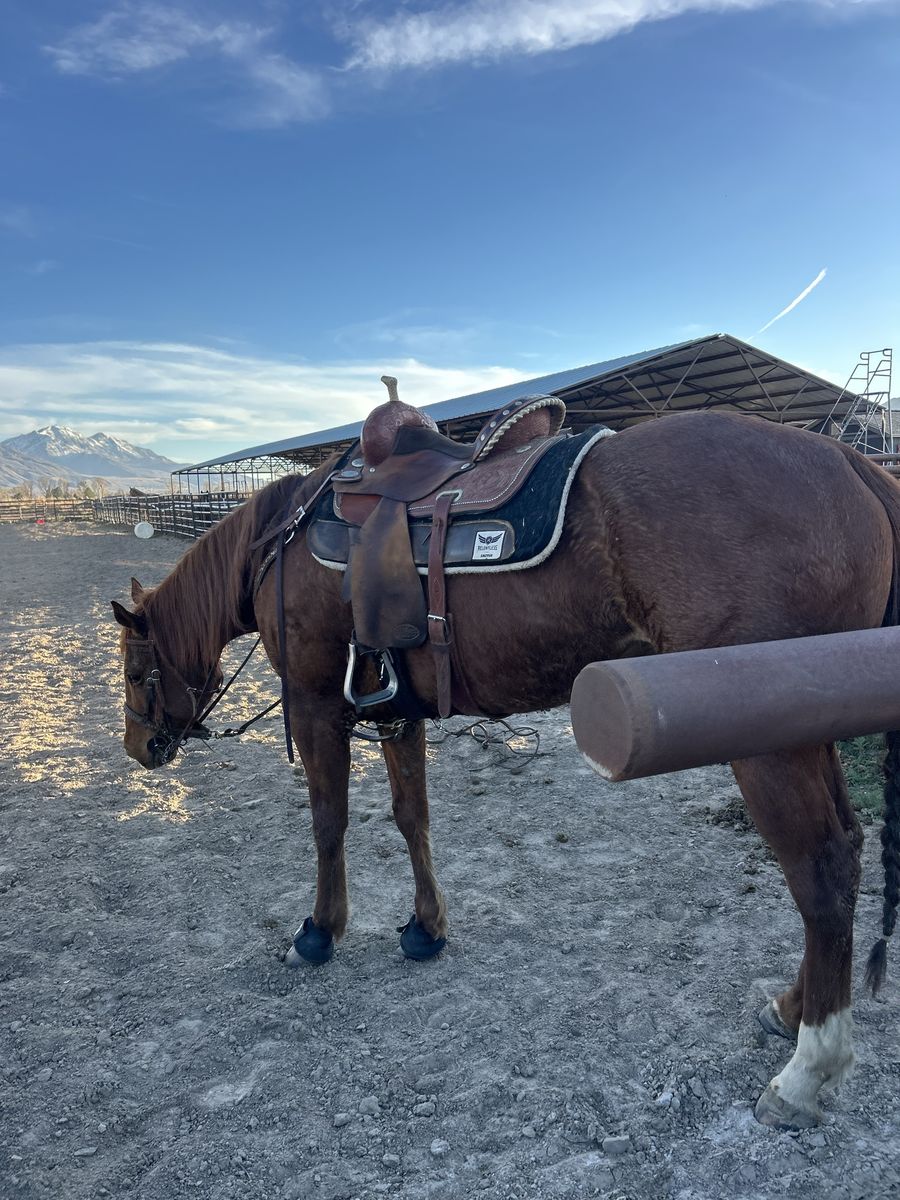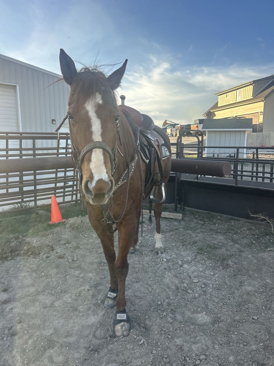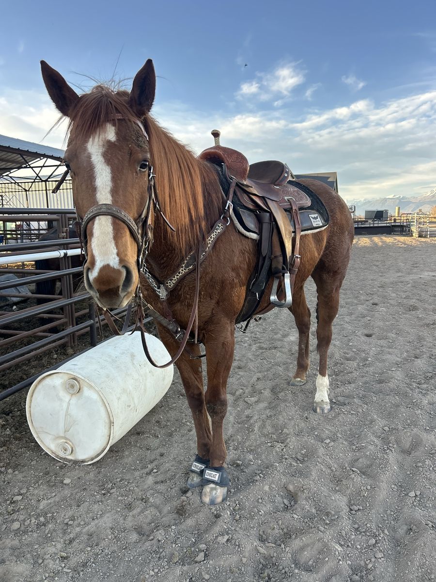 Reba is registered, started on barrels and poles, has been roped off a little bit and is very quiet. She stands about 16 hands, bathes good, trailers good and stands tied. Good on trails aswell.