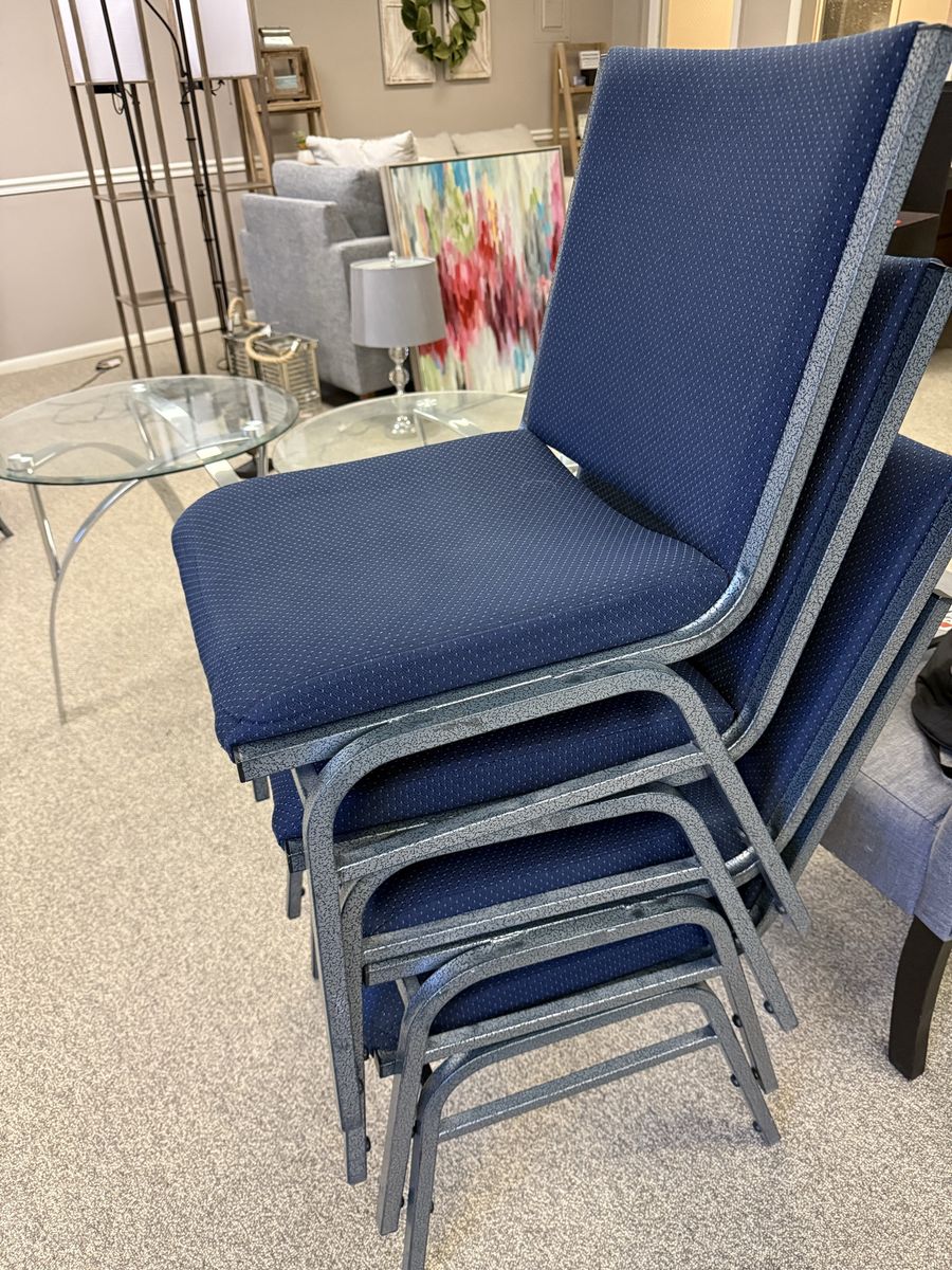 PayPalSturdy Metal, Blue Fabric ($30 ea) Looking for a massive deal on seating for your venue, event center, or church? We are selling a large lot of over 50 heavy-duty, stackable chairs. These chairs are built with a strong metal frame and feature cushioned seats and backs. This is a perfect budget-friendly solution for anyone who needs durable, large-scale seating. Key Features: • Stackable Design: These stack easily and densely, making them incredibly space-efficient for setup and teardown (see photos for example). • Heavy-Duty Construction: Solid, speckled metal frame (no wobbly chairs). These were built to last. • Comfort: Both seat and high backrest are padded, much more comfortable than basic folding chairs. • Style: Dark blue fabric with a small patterned texture.