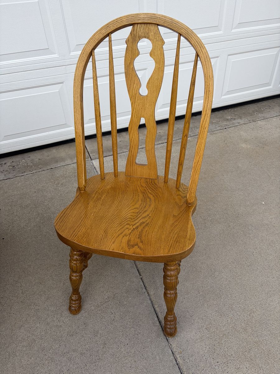 The set includes 8 Windsor double keyhole solid wood chairs. The chair dimensions are 18 inches wide, 16 inches deep and 36 inches high and all the chairs are rock solid without any loose slats or wobbles