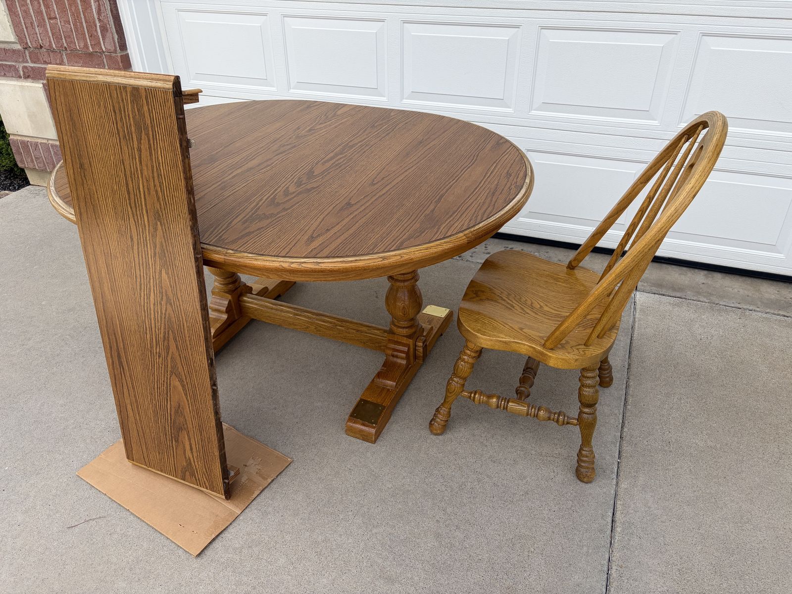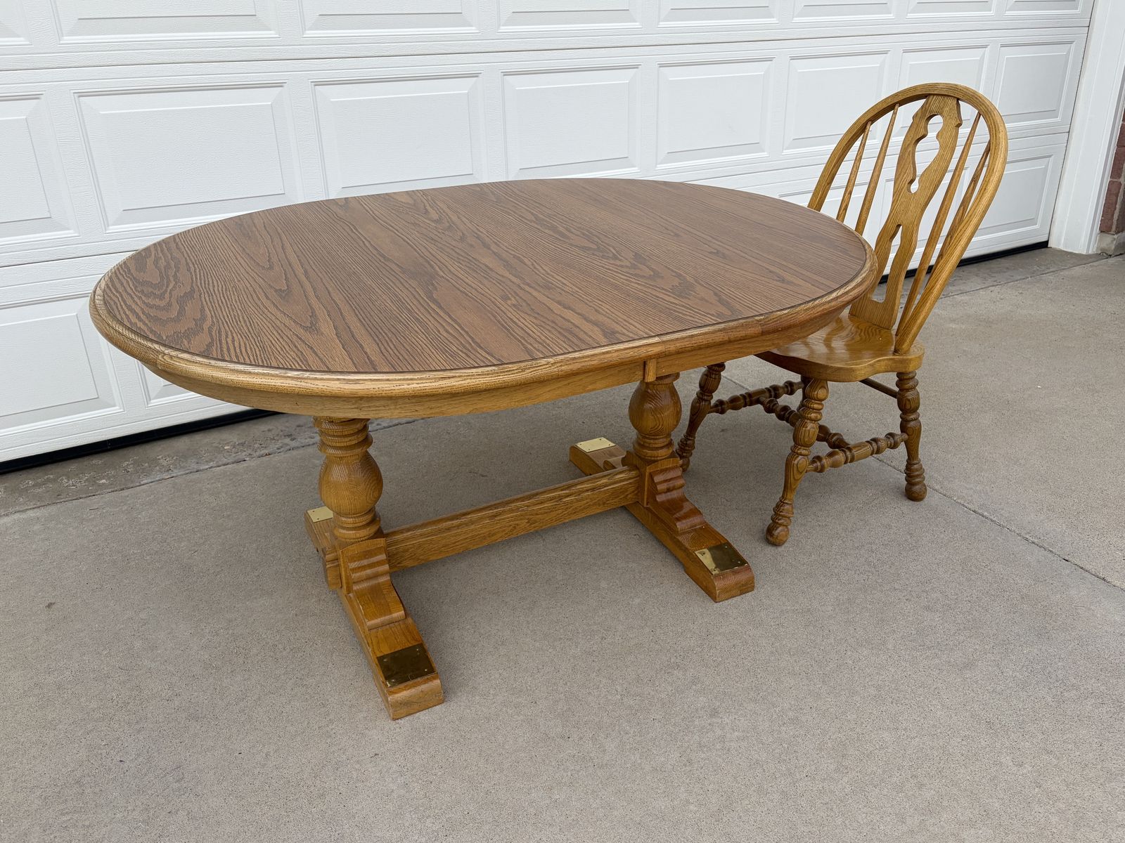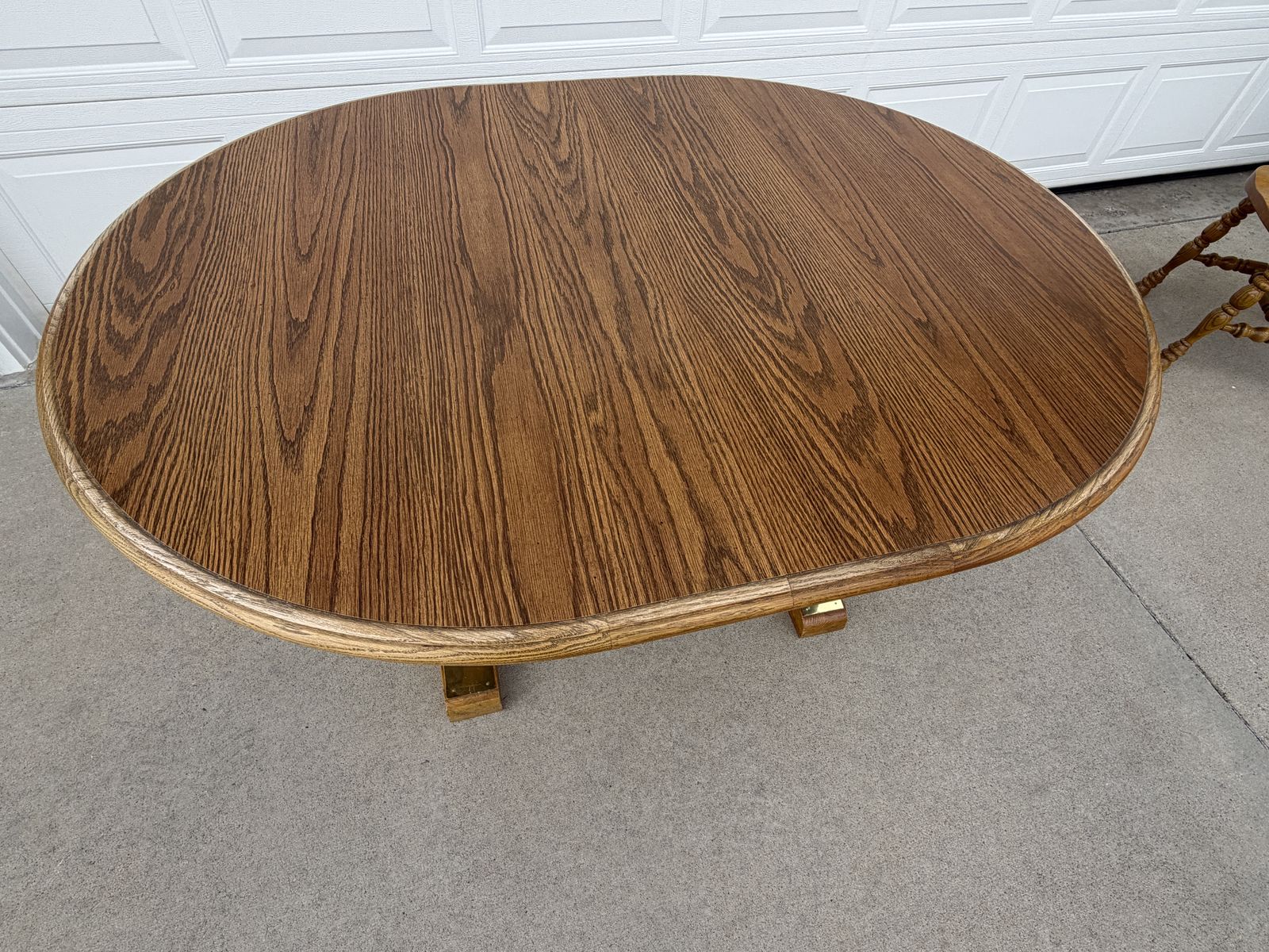 This Cochrane furniture is solid oak except for the table top which is a matching oak laminate. The set shows mild wear, as it was used by my family for many years.