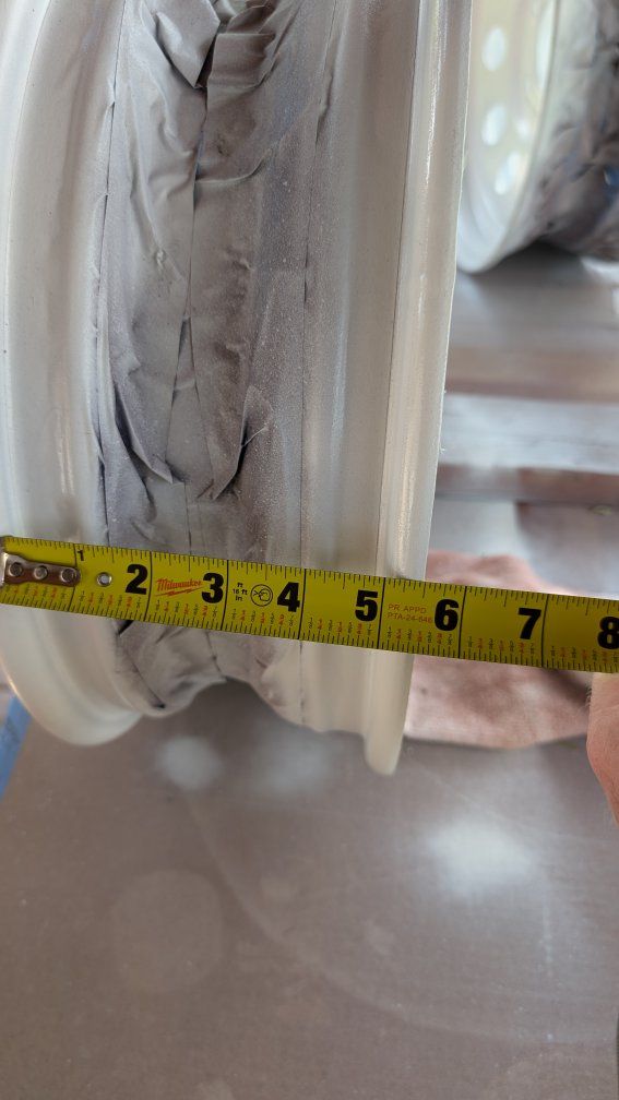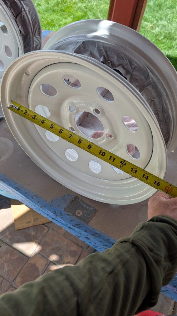 Refurbished trailer wheels. Stock off a 3 year old cargo trailer. Striped and repainted. Primer, Paint, clear coat. Bolt pattern is 5 by 4.5