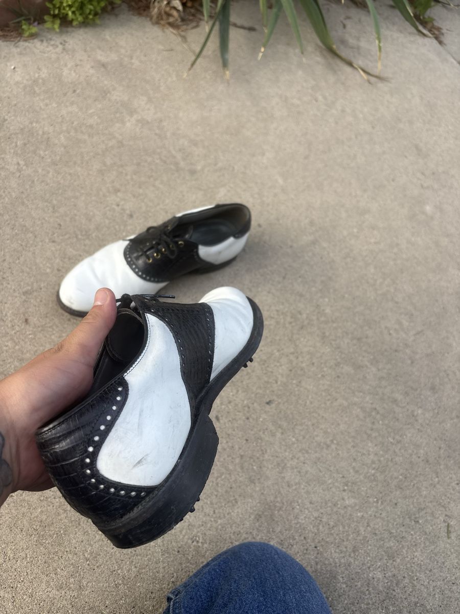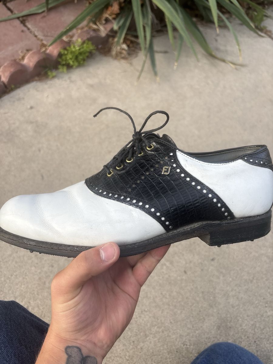 • Genuine leather upper • Classic black & white saddle style • Good condition with normal wear • Spiked soles for great grip