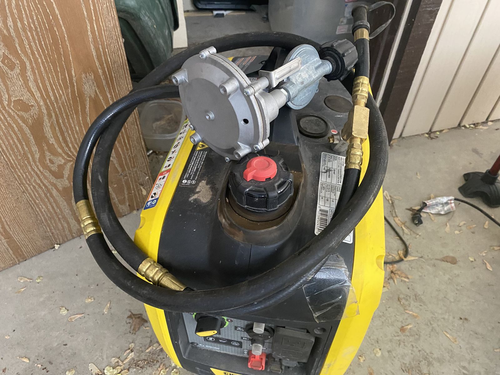 Champion 2400W generator runs on gasoline or propane. Unit is about 6 years old, but because it was too small for my needs, it has LESS THAN 70 HOURS TOTAL RUN TIME on it. However, it worked wonderfully for times when I needed less power.