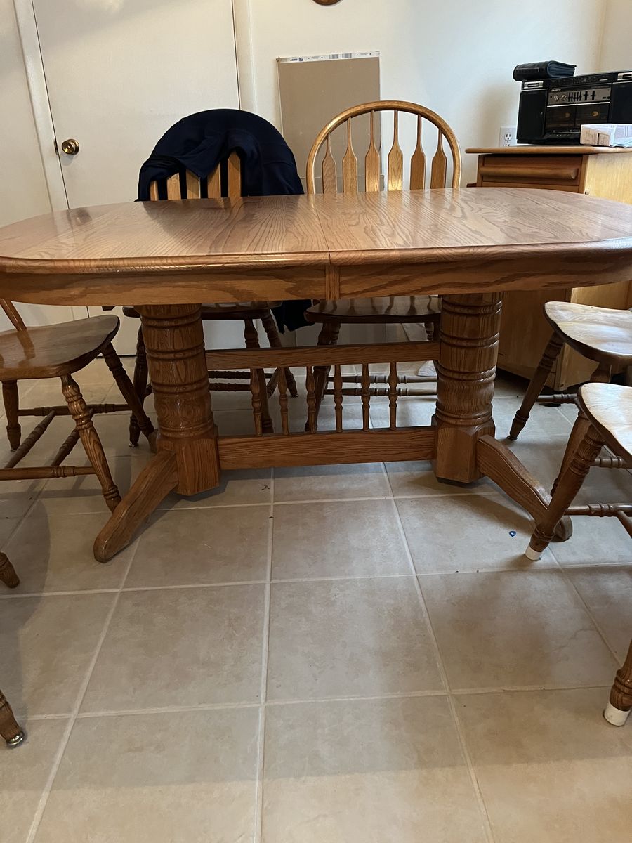 Great dining room table. Spent its entire life with the top covered and it is spotless. All 6 chairs and the leaf included.