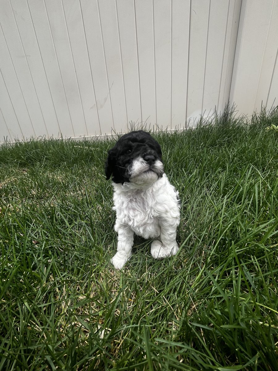 These pups come from a Cockadoo (golden doodle x cocker spaniel) Mom (18 lbs) and a Mini Poodle dad (11 lbs), and are expected to stay in the 12–20 lb range full grown, making them a perfect small/medium family companion. Both Parents have been genetically tested and Cleared.