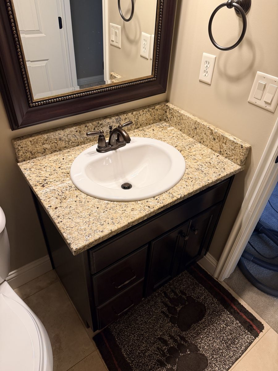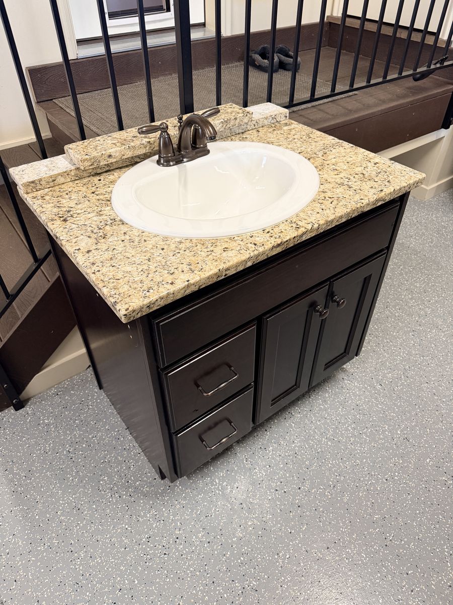 Complete bathroom vanity with granite countertop and backsplash, Moen faucet, and sink. Great condition. Must mount with wall on right and toilet on left. Cabinet measurements are 32” wide x 31 3/8” high without countertop / 32 1/2” with countertop x 22” deep. Countertop is 33 1/2” wide x 1 1/8” thick x 22 11/16” deep. Backsplash is 4 1/8” high.