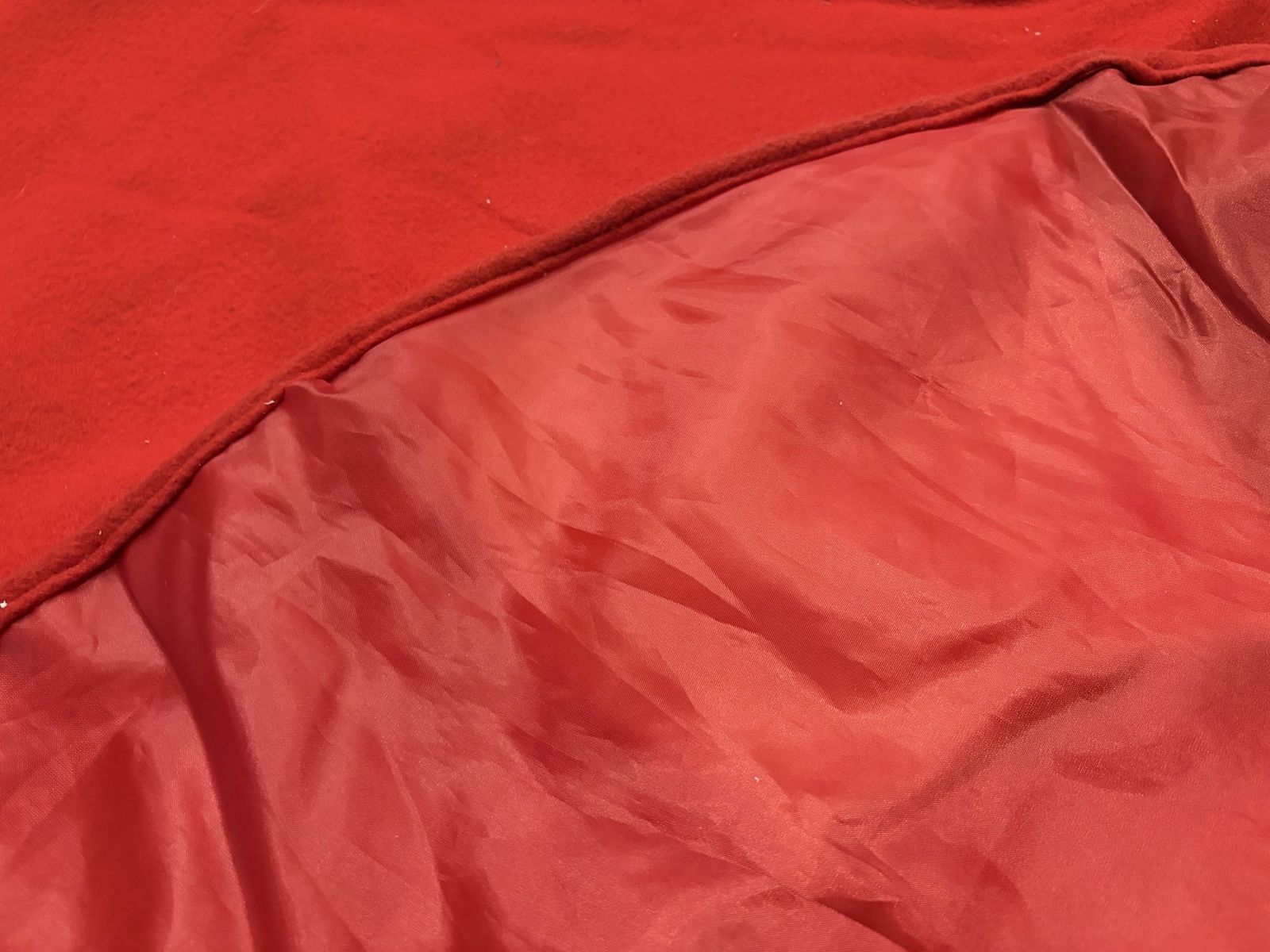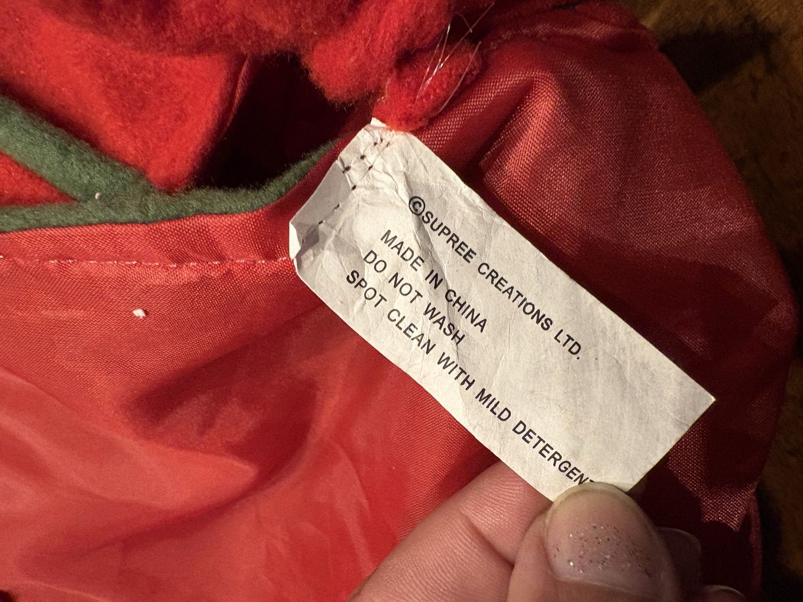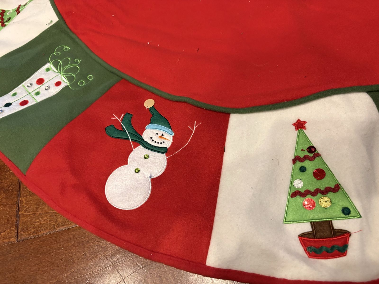 I have a felt Christmas tree skirt with some snowmen, Christmas trees and presents around the edge. The back is a red satin material. It is 4 feet across (48 inches). See my other ads for jewelry, artwork, home decor and more.