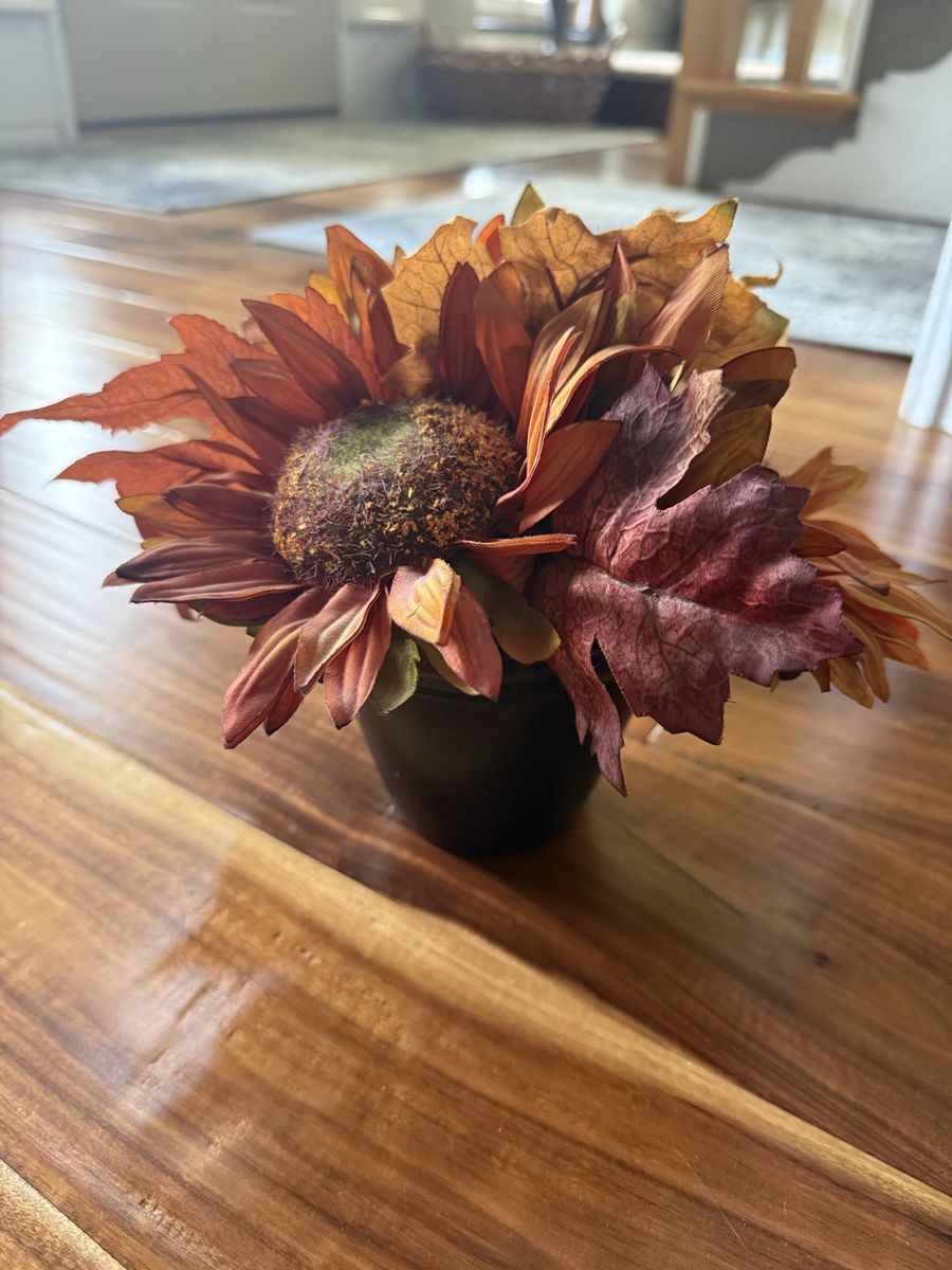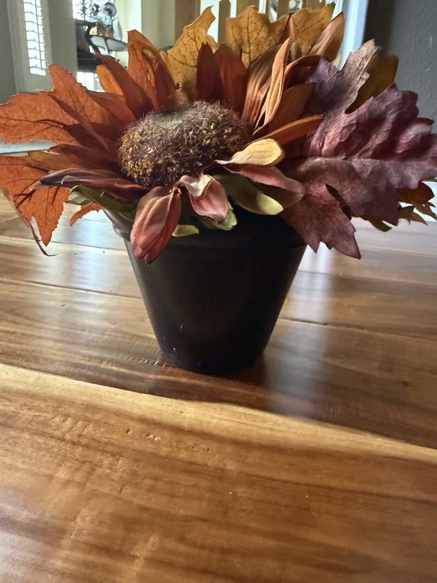 Venmo3 sunflowers with fall leaves great for any decoration 8 inches tall by 7 inches wide with the flowers. Black vase.
