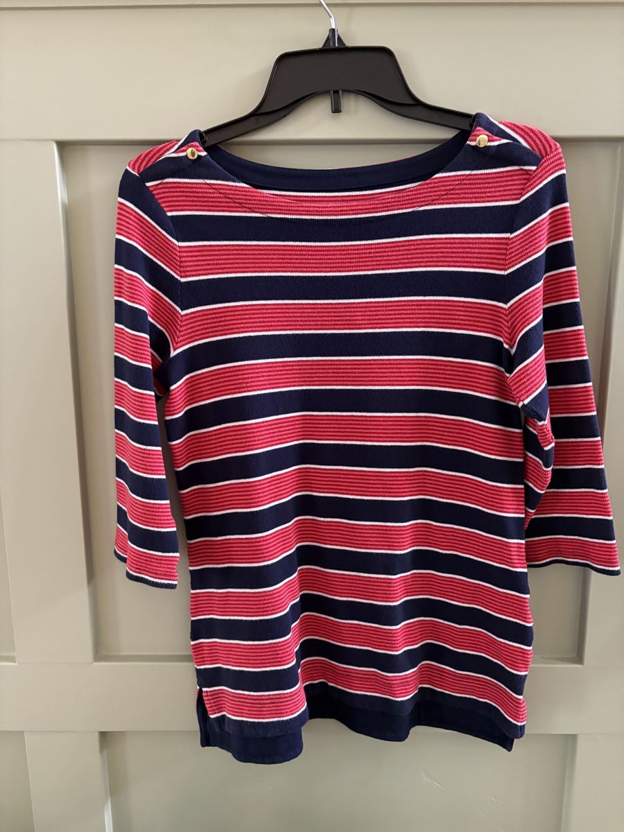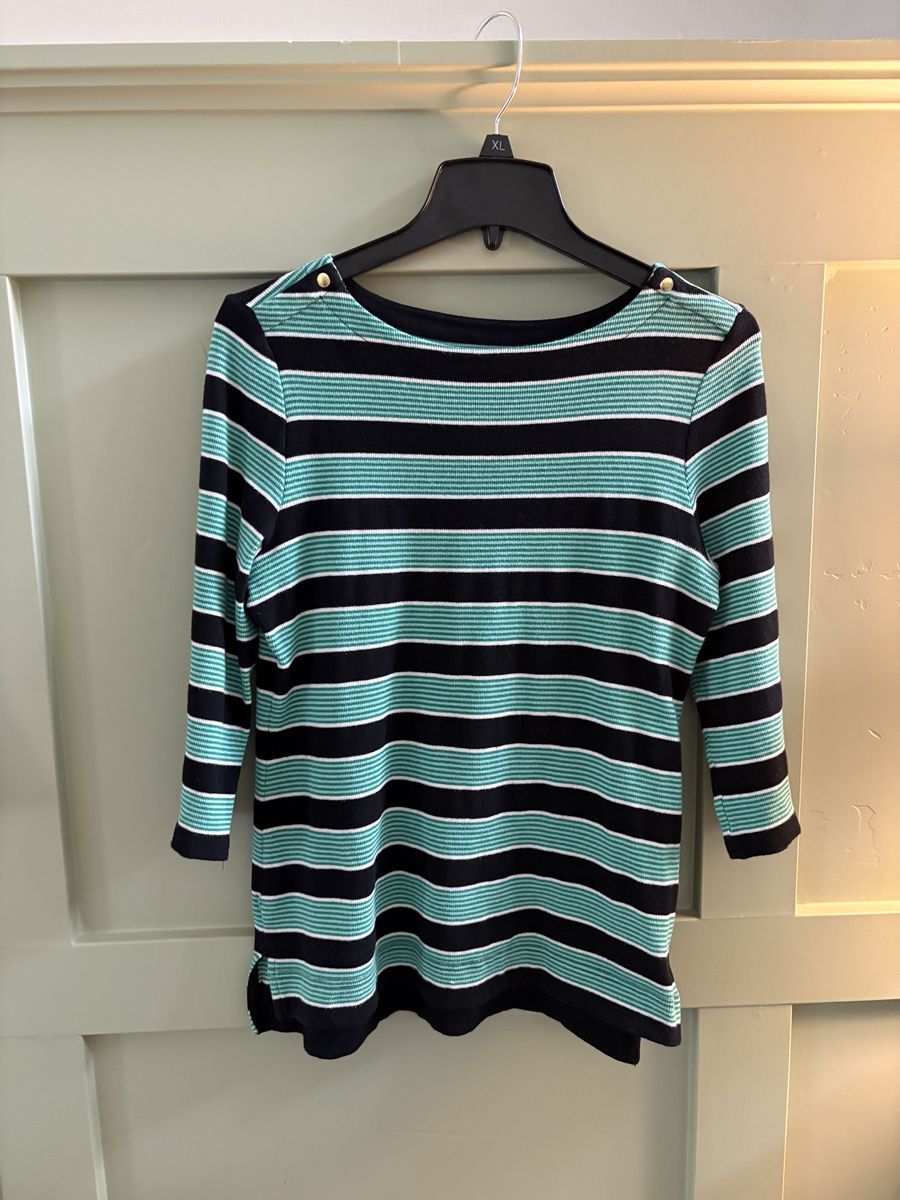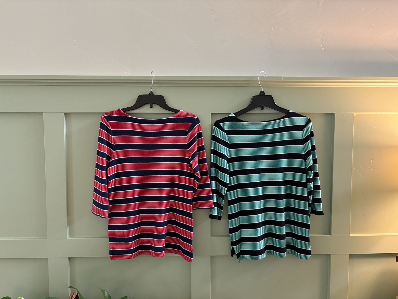 Misses Croft & Barrow Striped Tops in Small, one in Red/Navy Stripes and one in Green/Navy Stripes. See Photos for fabric content and Laundry instructions.