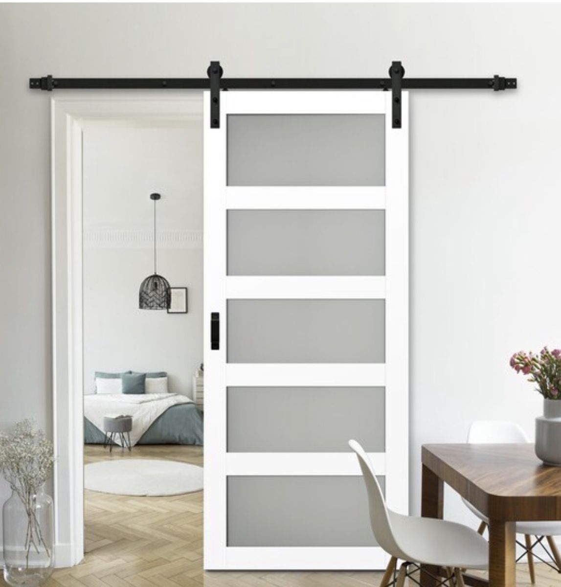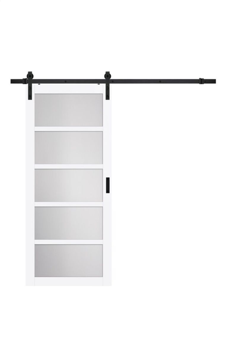 Brand new barn door that we bought for one of our basement doors and decidedy not to install it. It comes with all hardware. 36-in x 84-in Bright White Frosted glass MDF Solid core Single Barn Door we bought it for $188