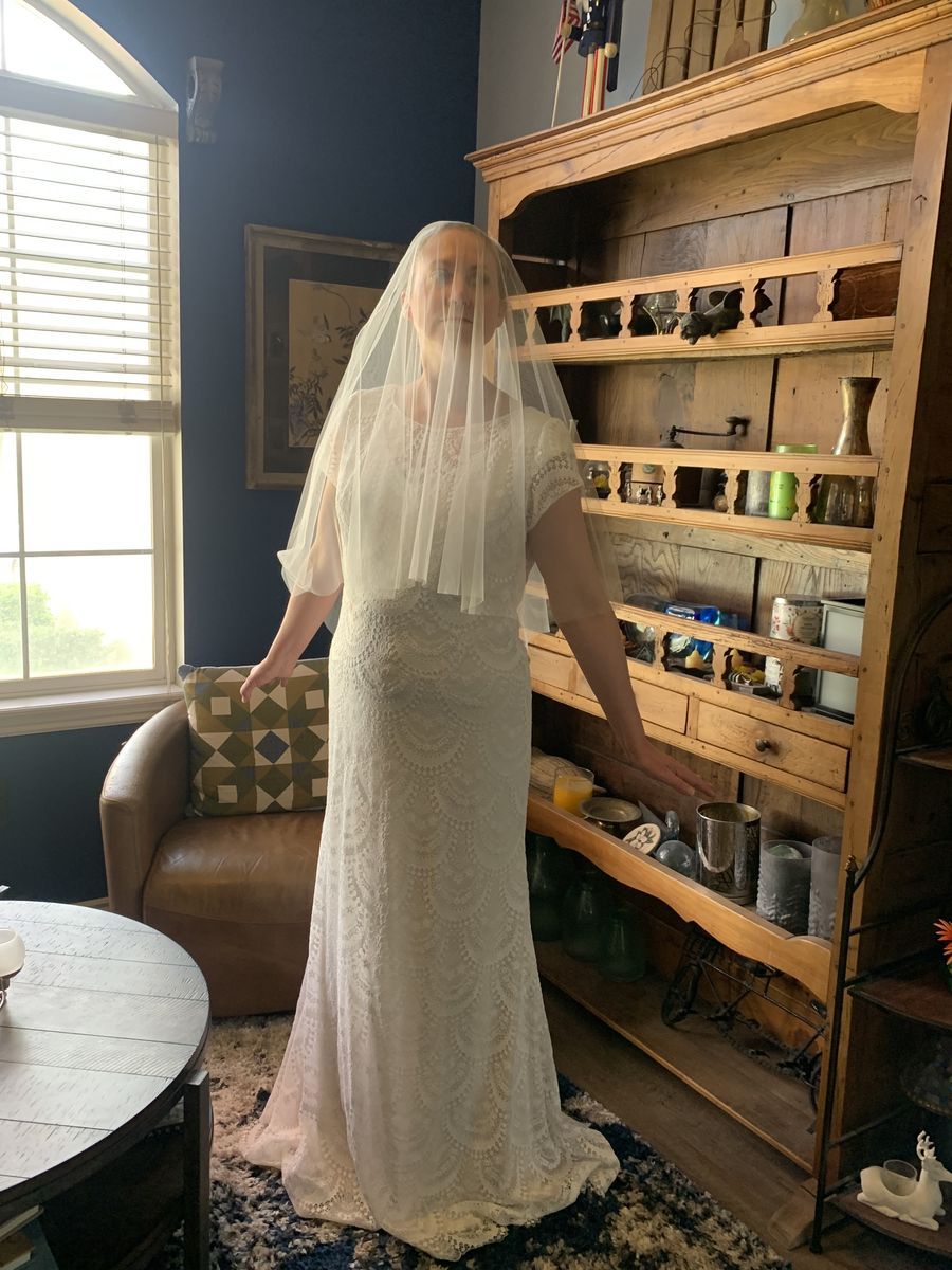 ApplePayNever been used, unaltered, discontinued style wedding gown with lace over-gown over beige satin sheath. Small buttons up the back. matching veil included. Size 12.