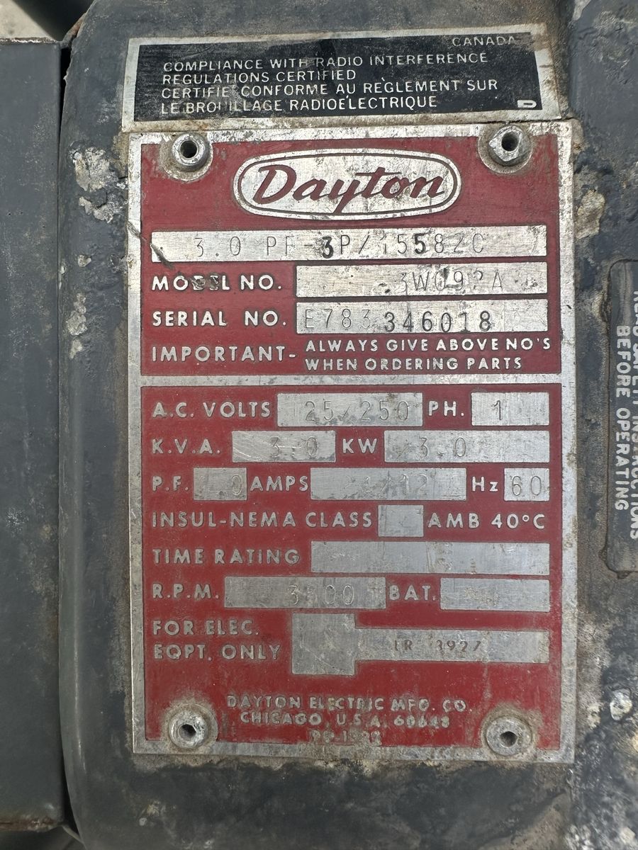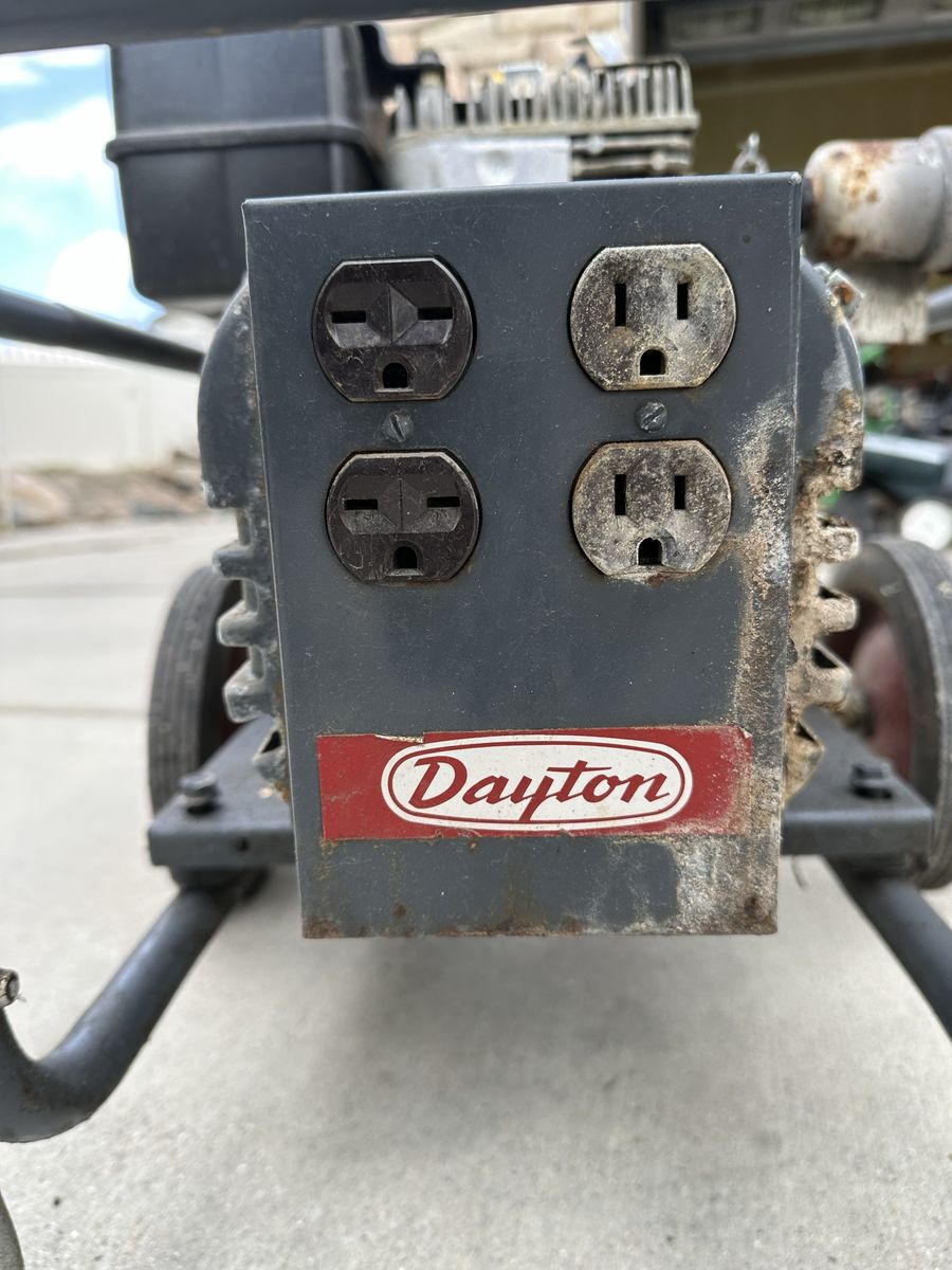 Dayton 3.0 kW portable generator powered by a Briggs & Stratton 8 HP engine. This unit fires right up every time and produces clean power. It has two 120V standard outlets and two 240V twist-lock outlets – perfect for job sites, backup power, or emergencies. Specs: • 3.0 kVA / 3.0 kW • 120/240V single phase • 60 Hz • 3800 RPM • Model: 3W092A • Serial: E783346018 Condition: Older but tough and dependable. Needs a new air filter (easy/cheap fix). Everything else works as it should – starts easy, runs strong