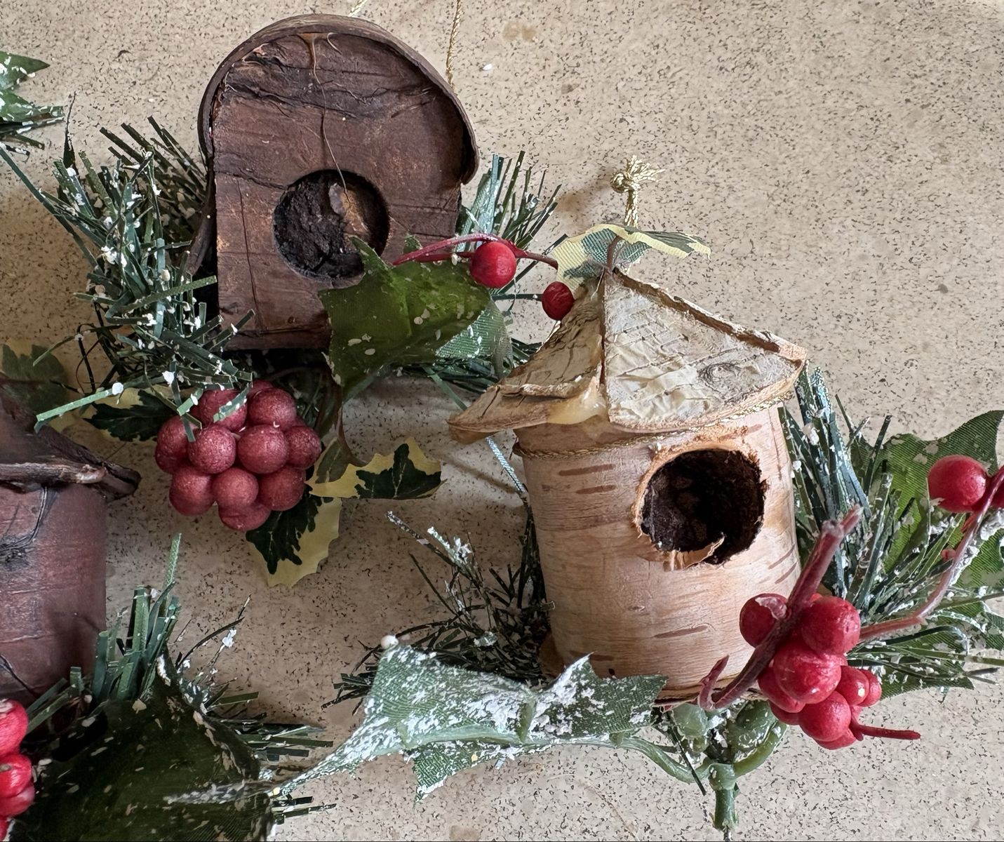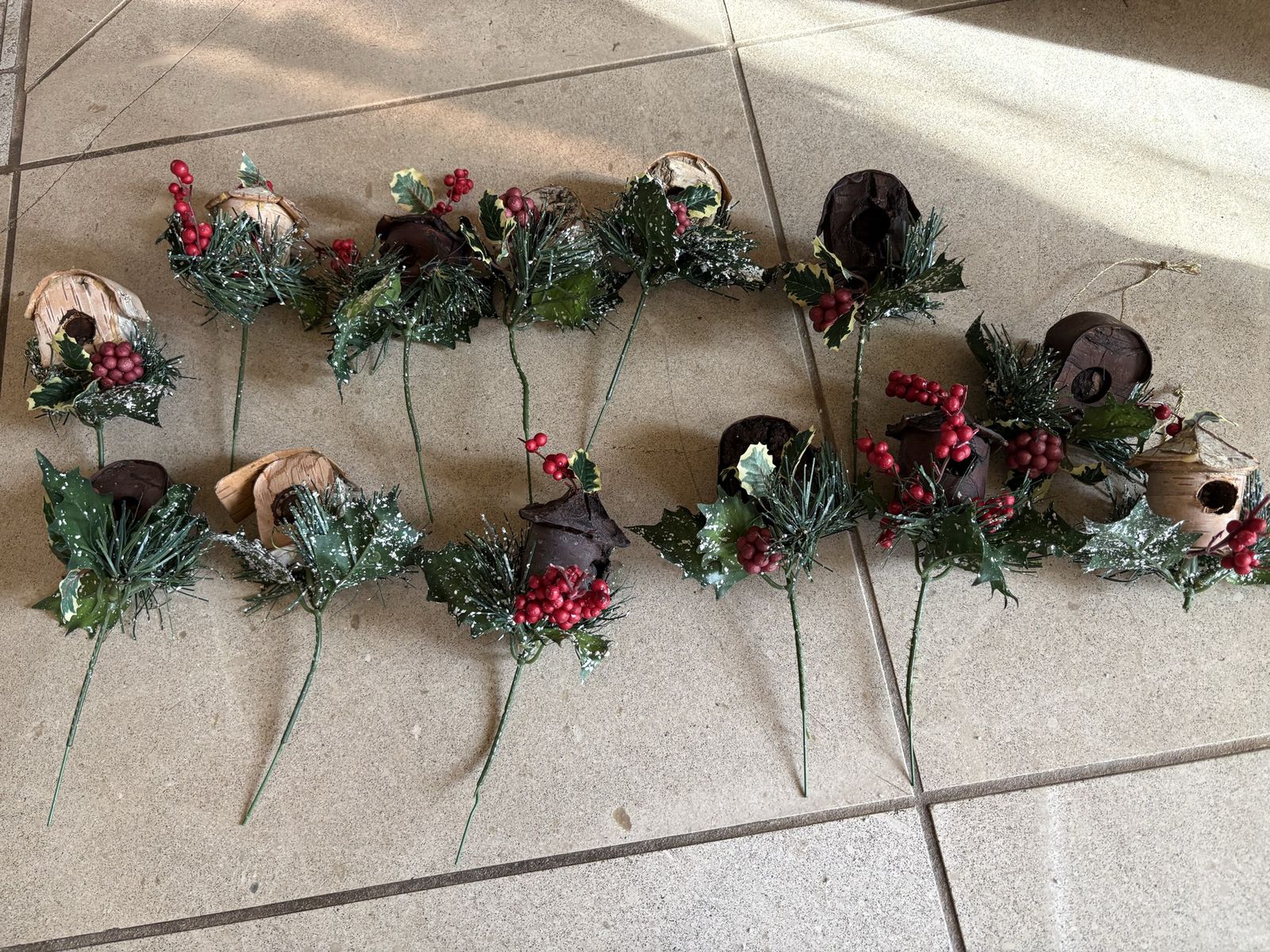 I have 11 sprigs of holly with birdhouses and 2 birdhouse holly hanging ornaments. There are a couple of different house styles in 2 different colors - light and dark. The sprigs are 7 1/2 inches tall and the hanging ornaments are 3 1/2 inches tall. The price is for all of them together. See my other ads for jewelry, artwork, home decor and more.