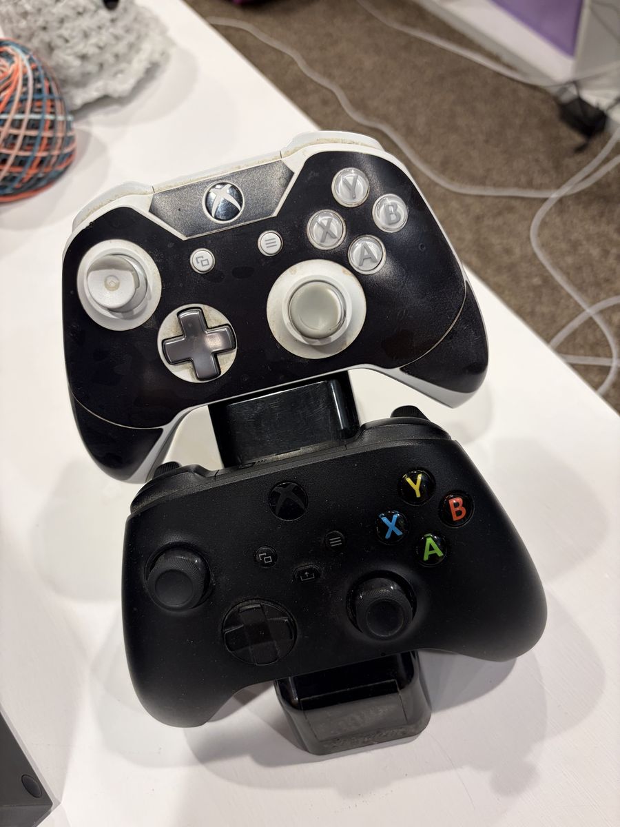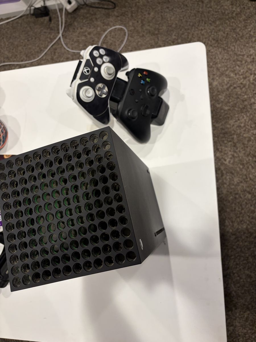 ZelleXbox series x with 2 controllers and a charging station for controllers.