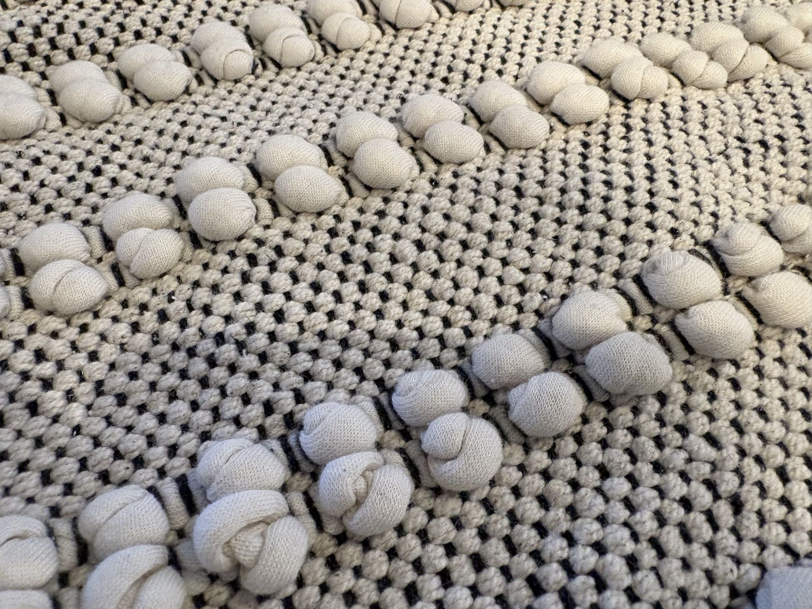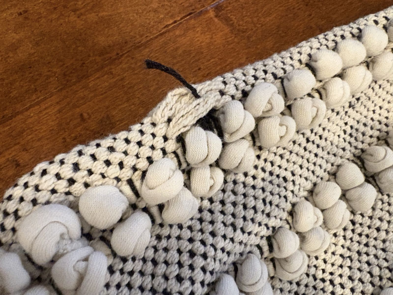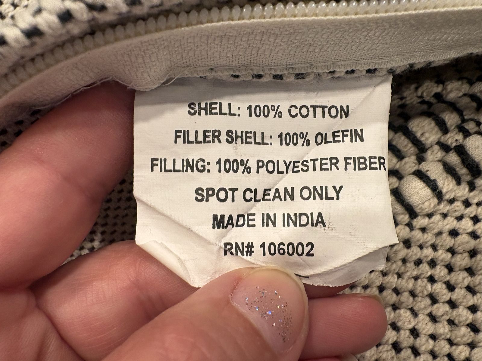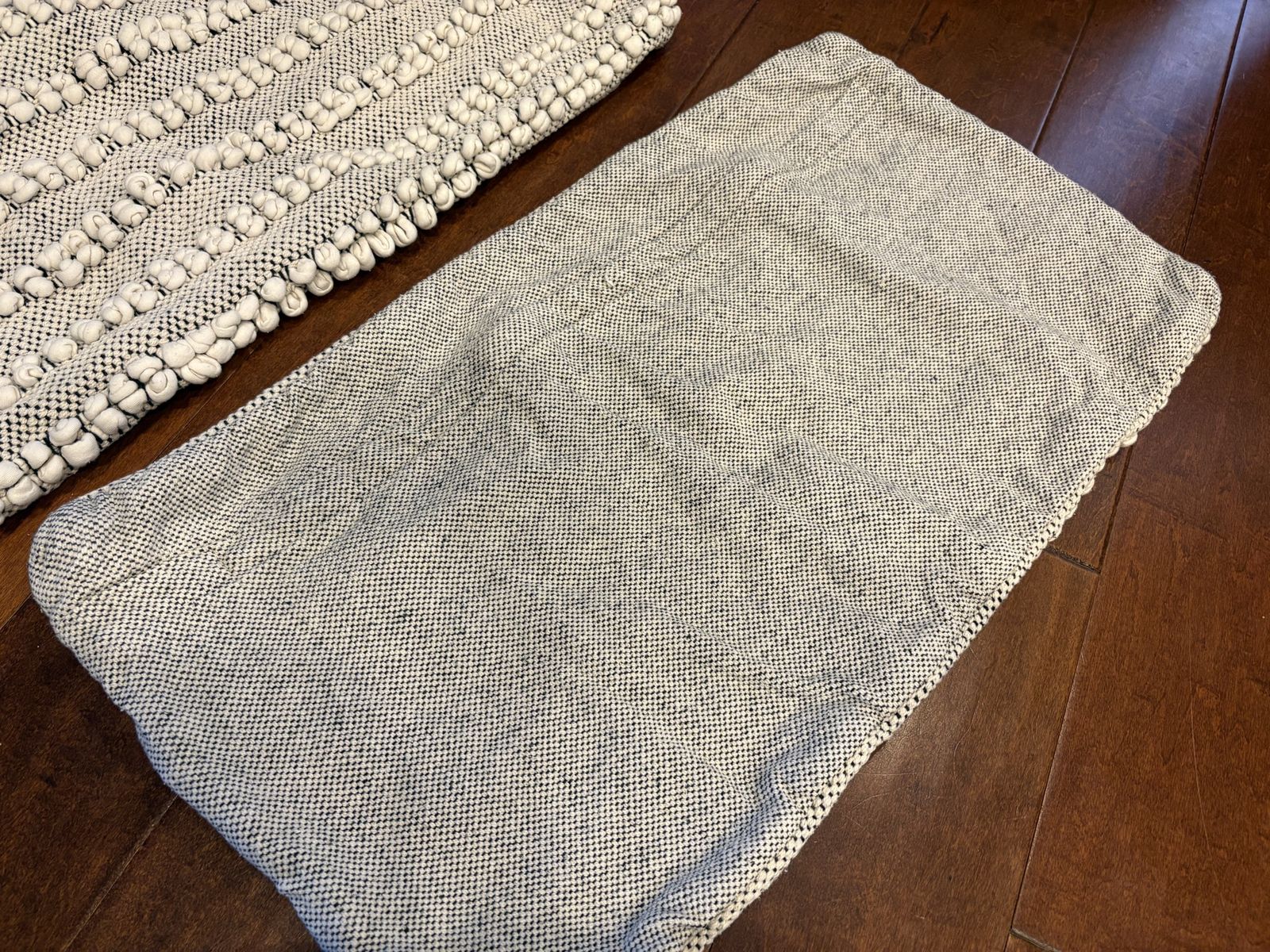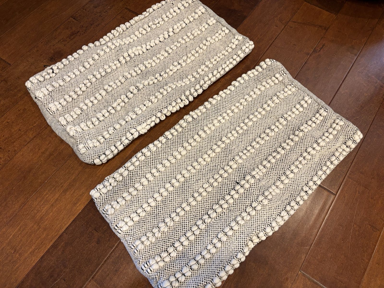 I have 2 matching woven textured throw pillow pillowcases. They are 24 inches long and 15 inches tall. They are black and white. There are a couple of spots where the black has come unwoven a bit (see the last picture for a close up). There are zippers on the back for putting inserts in. The price is for both of them together. See my other ads for jewelry, artwork, home decor and more.