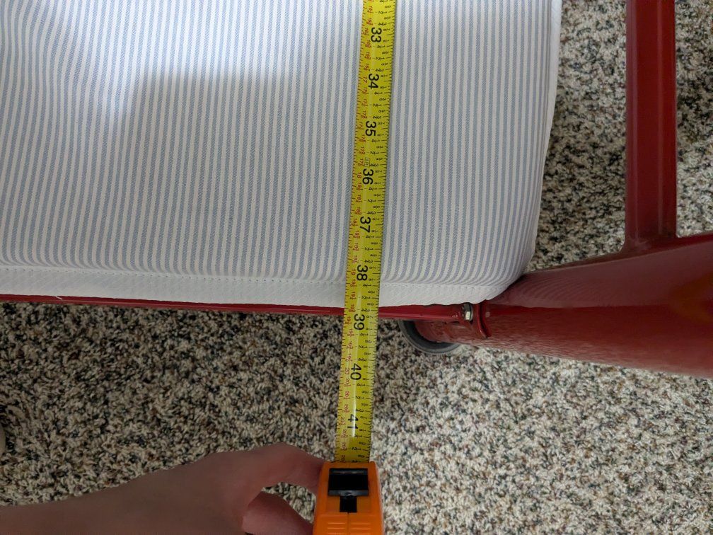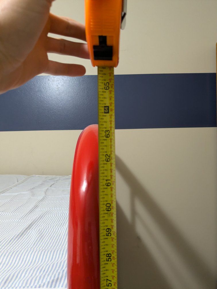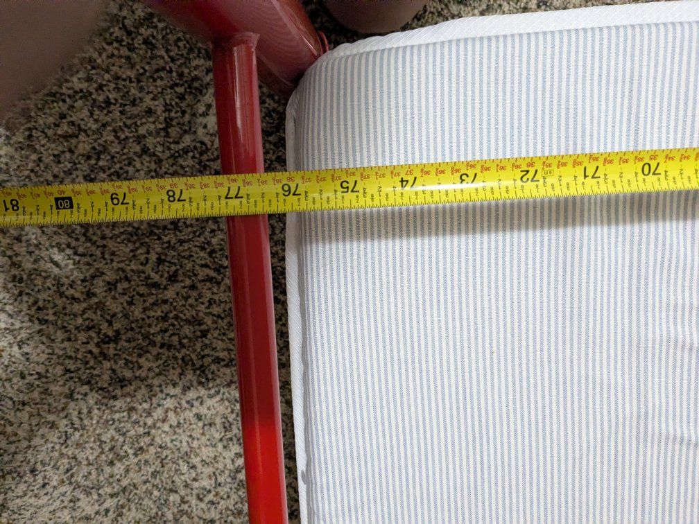 A set of red, metal frame, bunk beds. It stands at 63½ inches tall, 39 inches wide and 77 inches long and has a built in ladder on the side. The beds can be set up with both top and bottom frames or just the top bunk to leave space underneath. The frame connects with two bolts at each contact point and comes with four carpet pads for the bottom of each post. Two mattresses and mattress pads are included and in great shape. Asking $50 obo, cash or Venmo only.