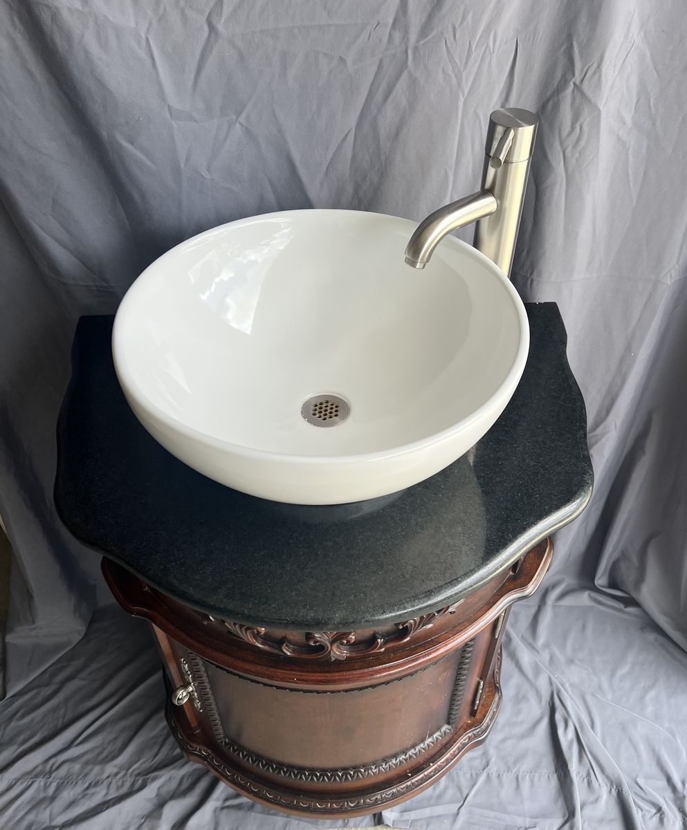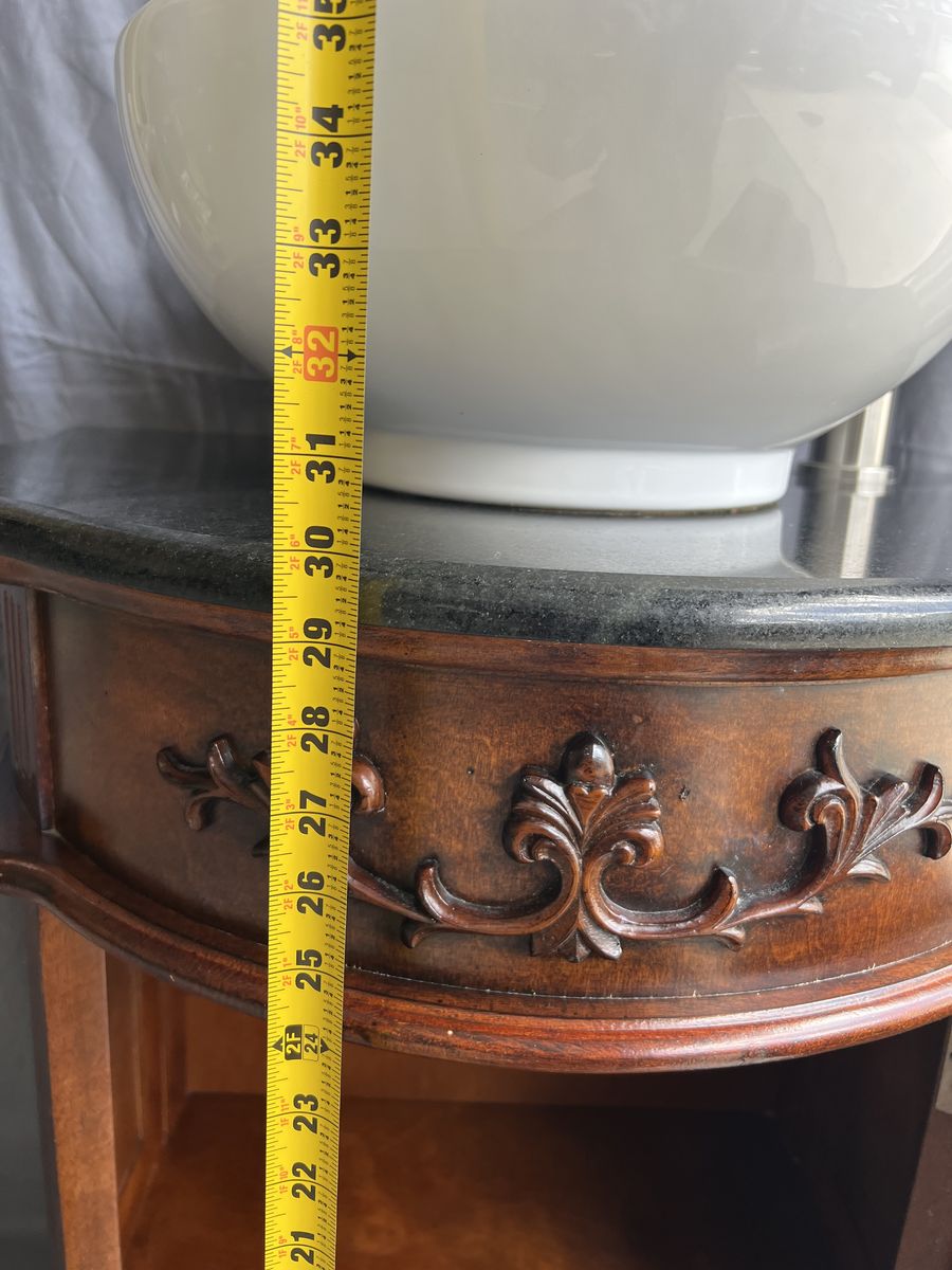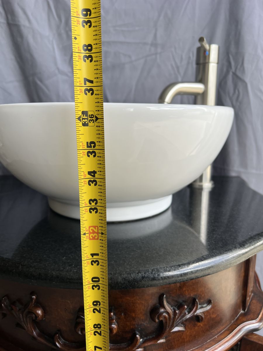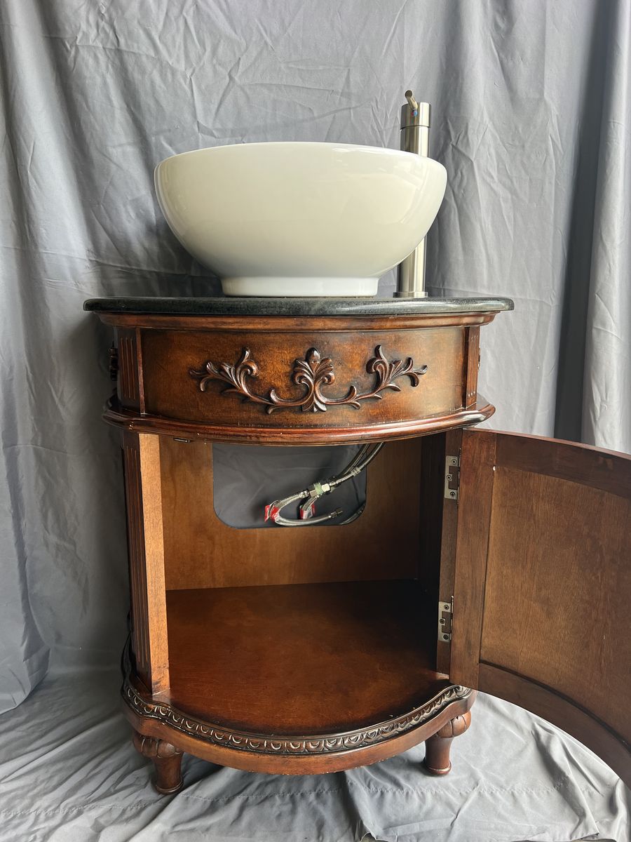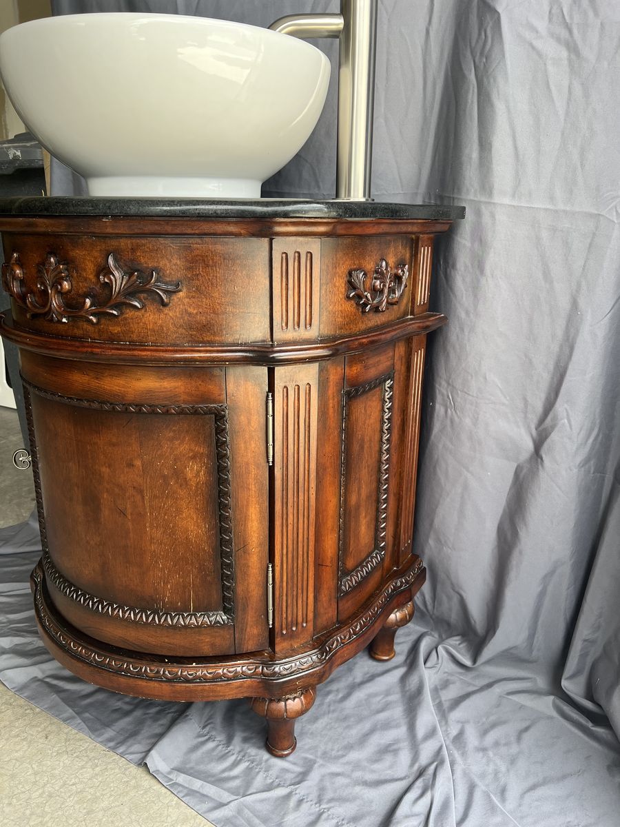 Beautiful furniture-style bathroom vanity in very good condition. This piece features a solid wood cabinet with detailed carved accents, a dark stone top, and a modern white vessel sink paired with a brushed nickel faucet.