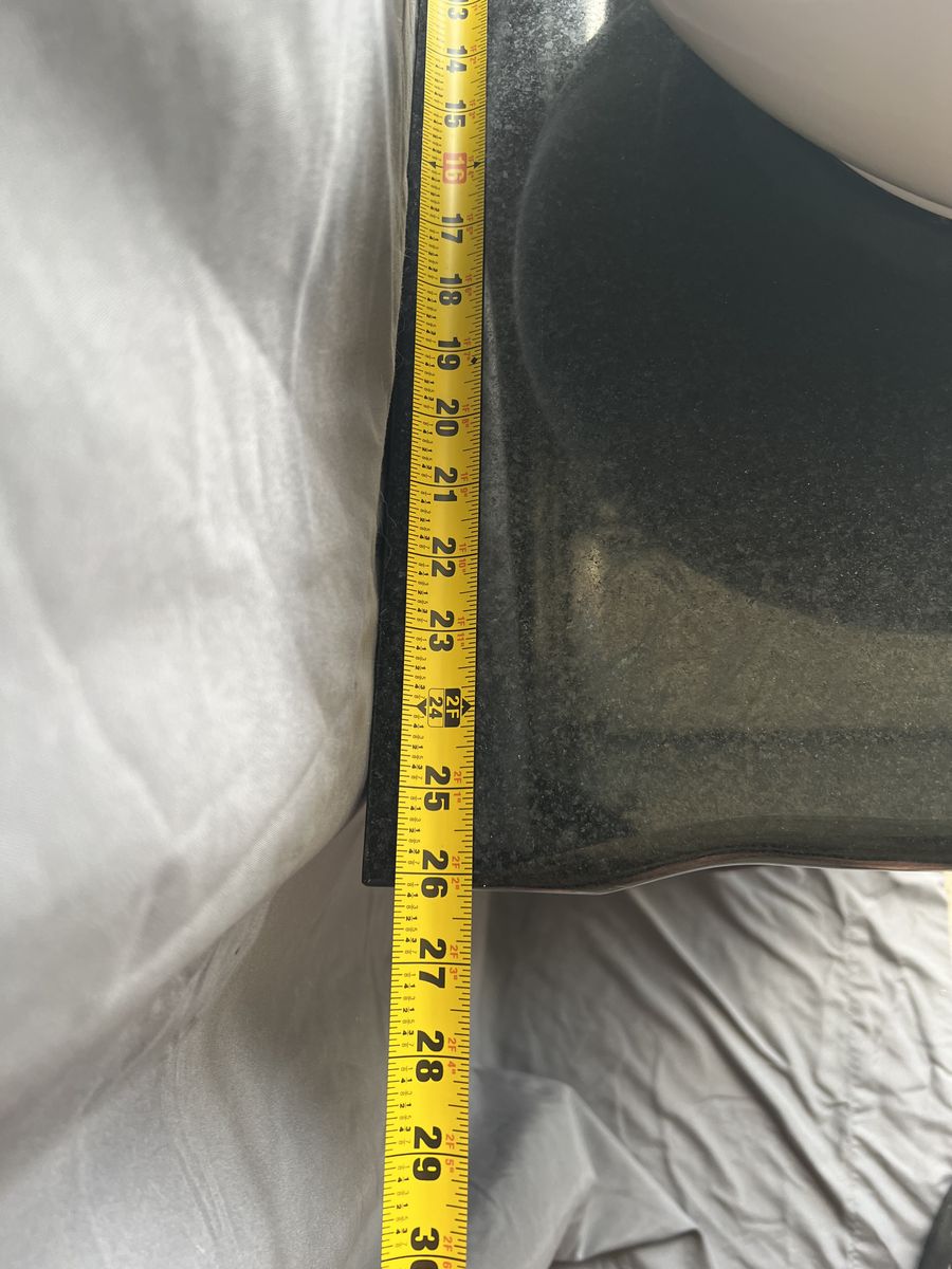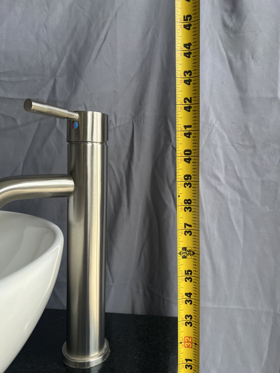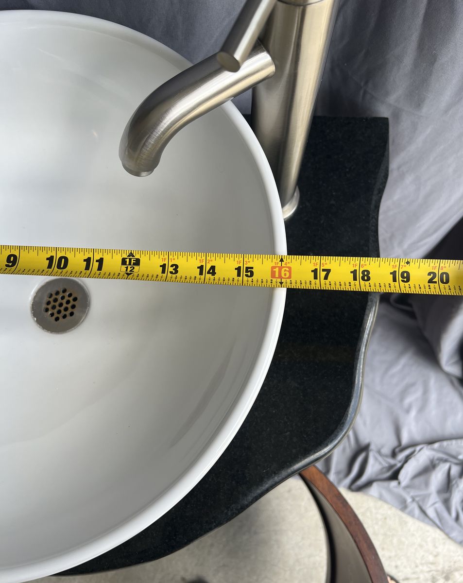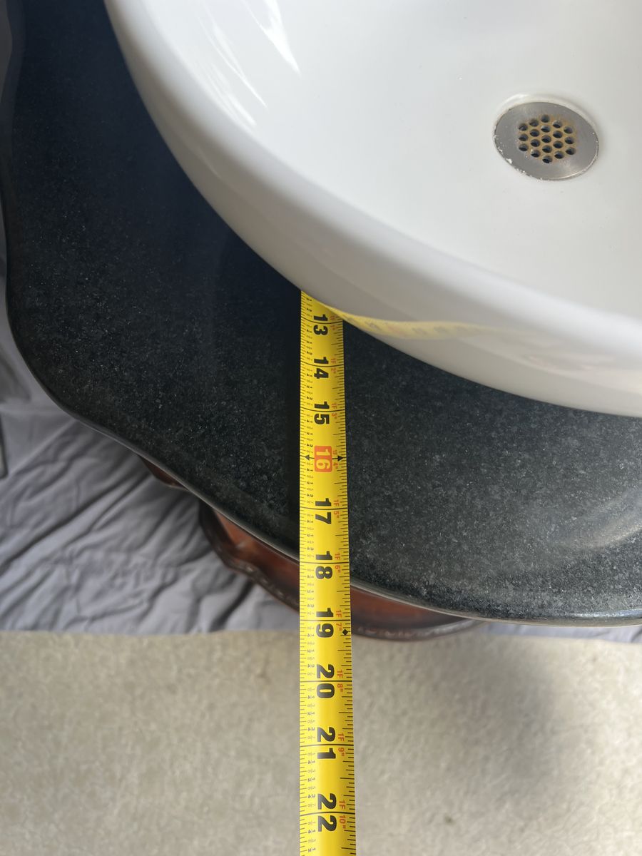 Beautiful furniture-style bathroom vanity in very good condition. This piece features a solid wood cabinet with detailed carved accents, a dark stone top, and a modern white vessel sink paired with a brushed nickel faucet.
