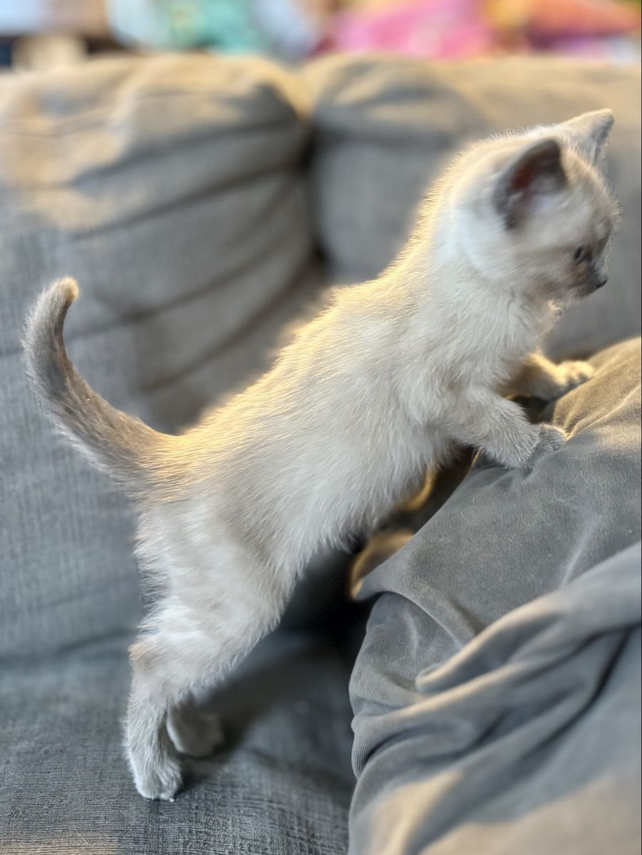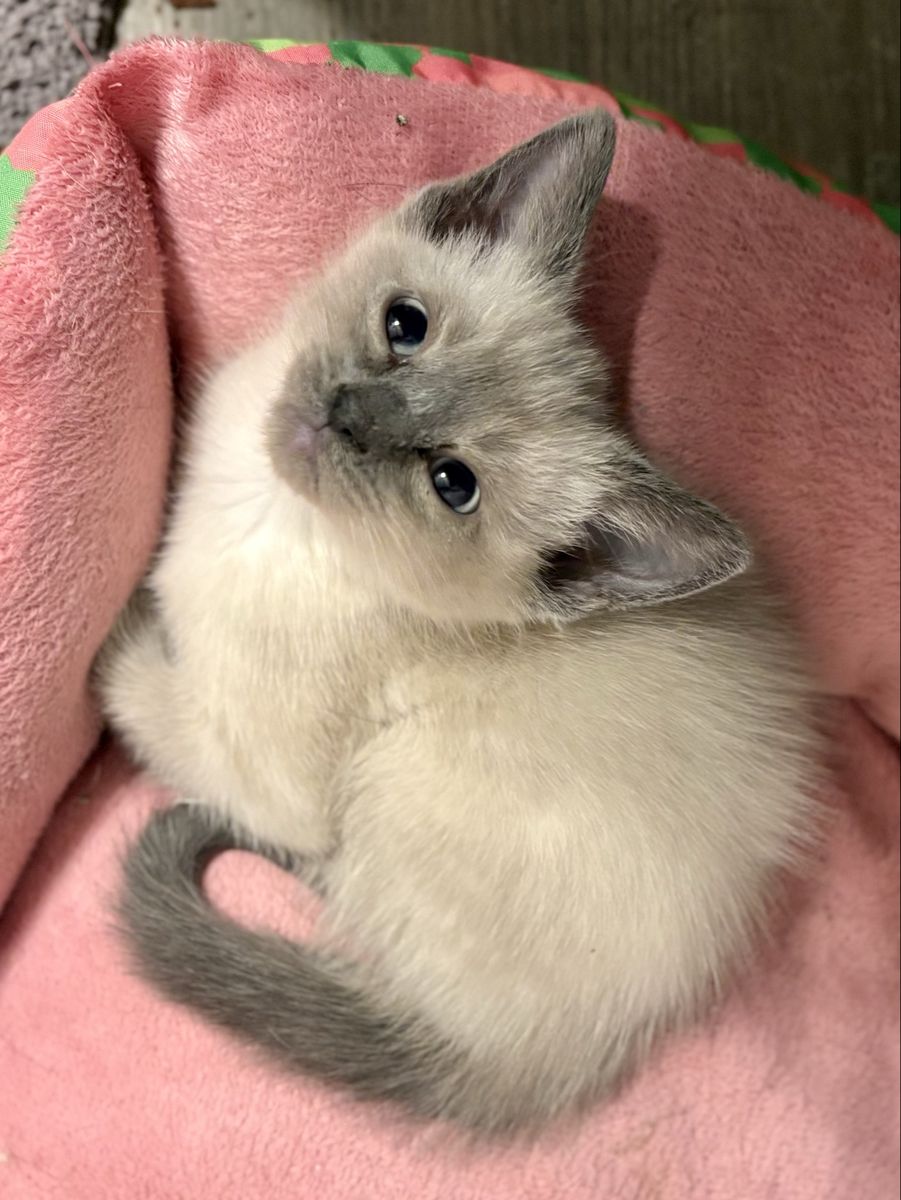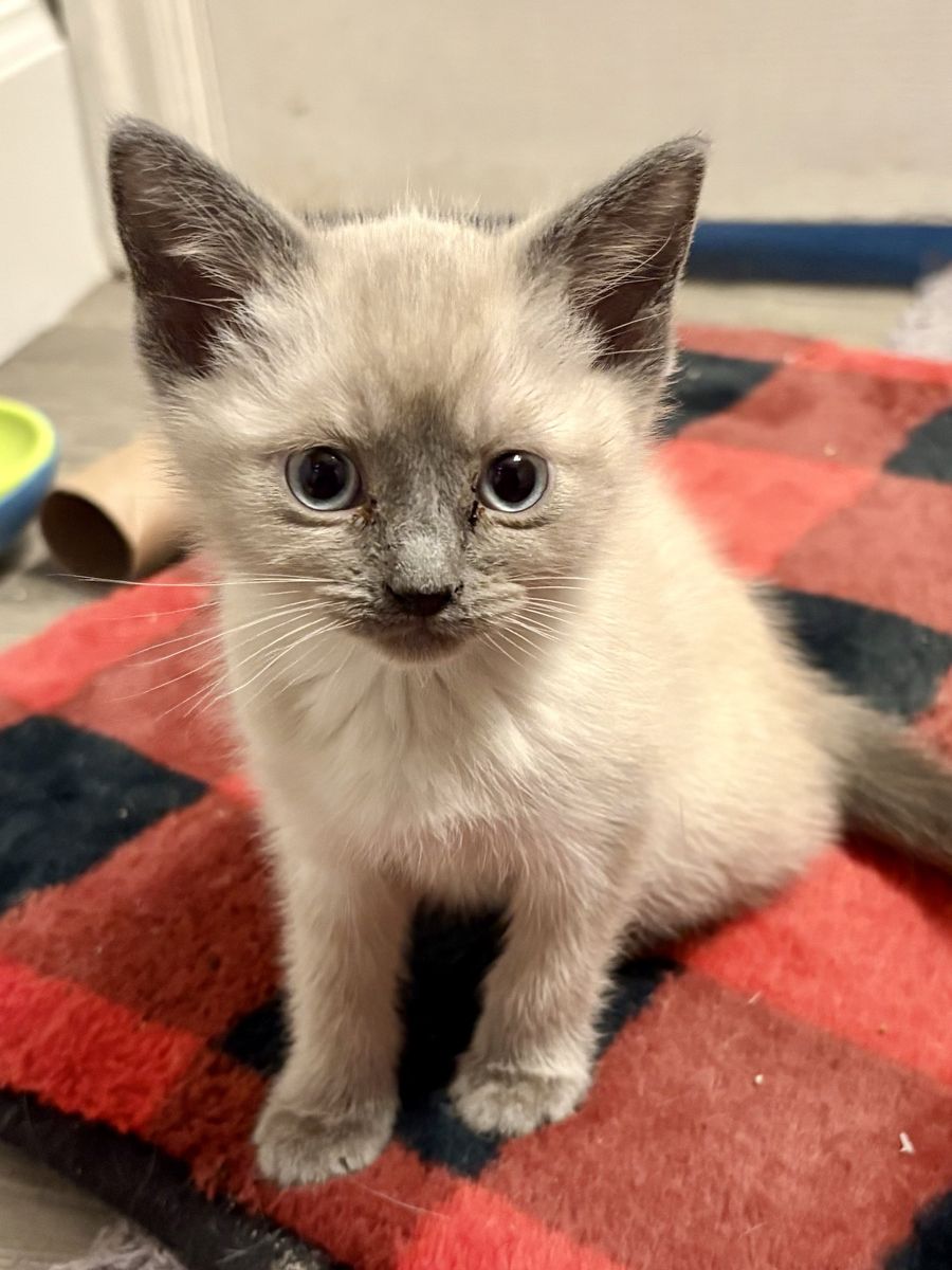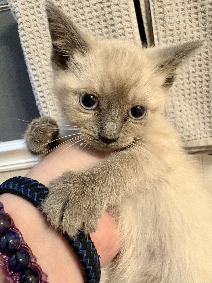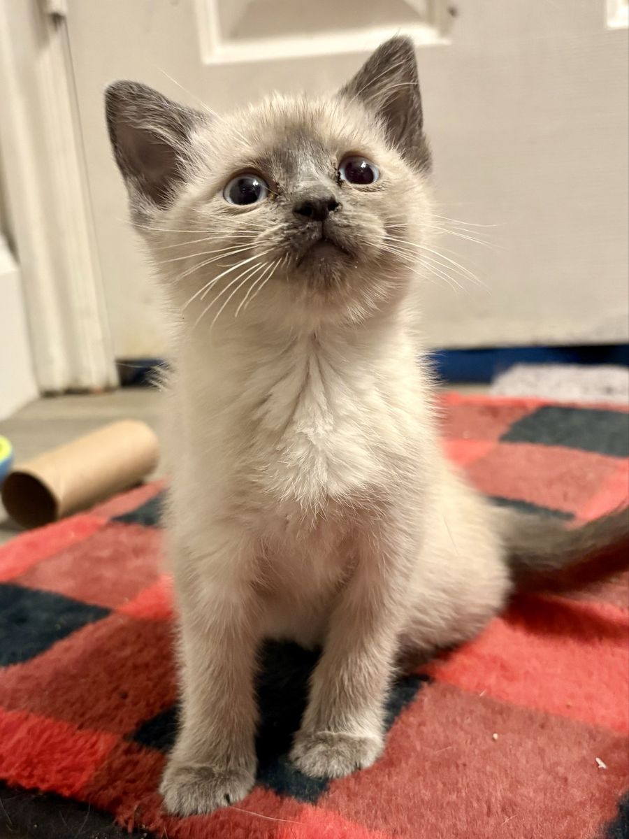 CashAppJuniper is just a darling! She is a blue point Siamese mix female kitten who was born on 2/18/25. Her mama is a seal point Siamese and we don’t know what the dad was.