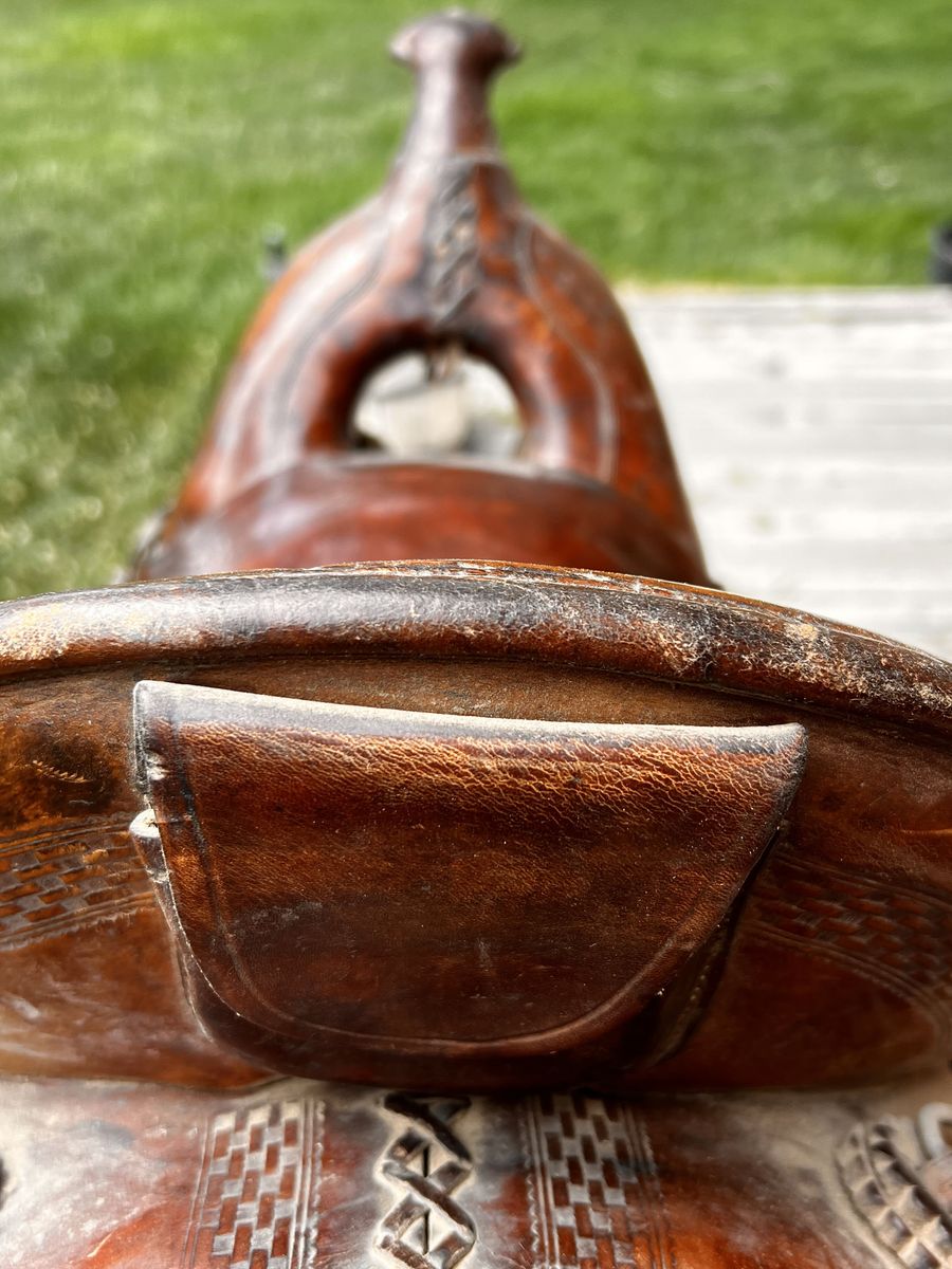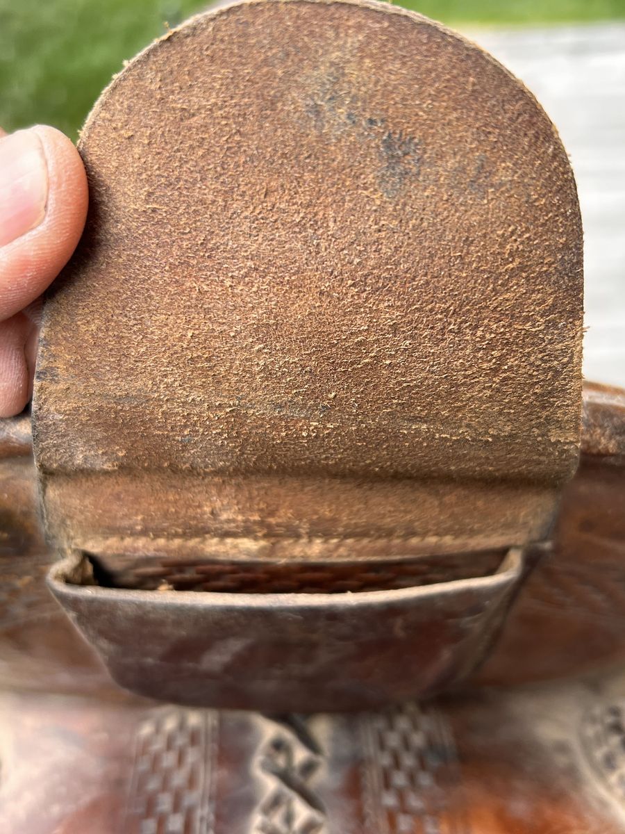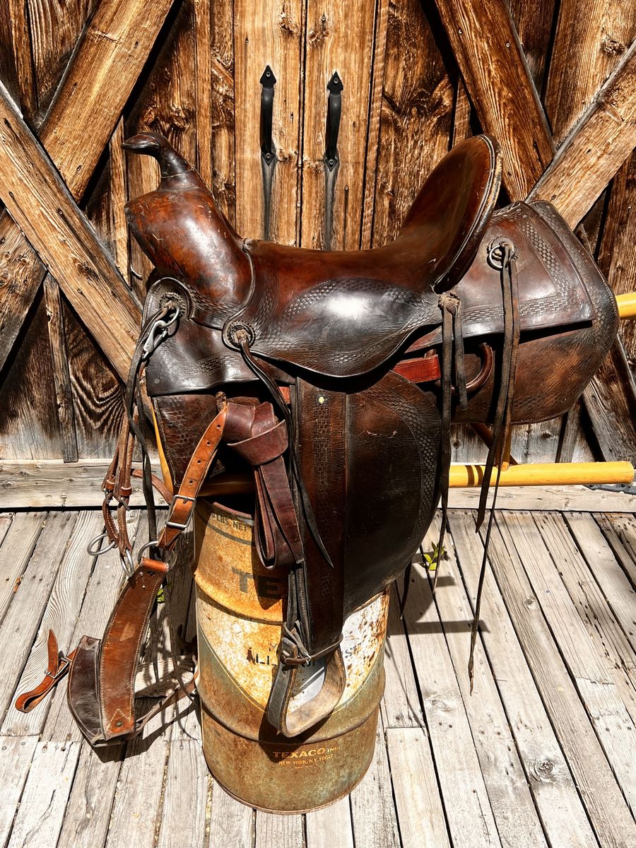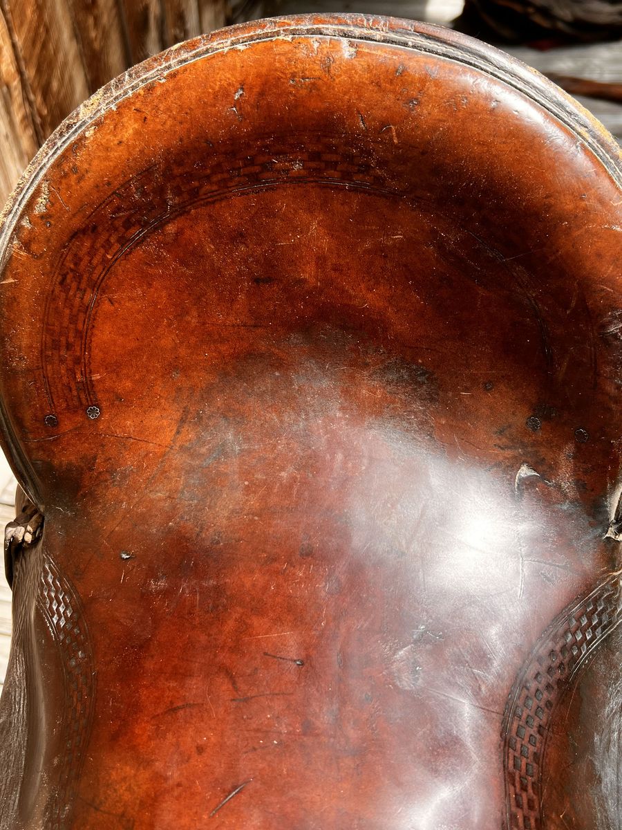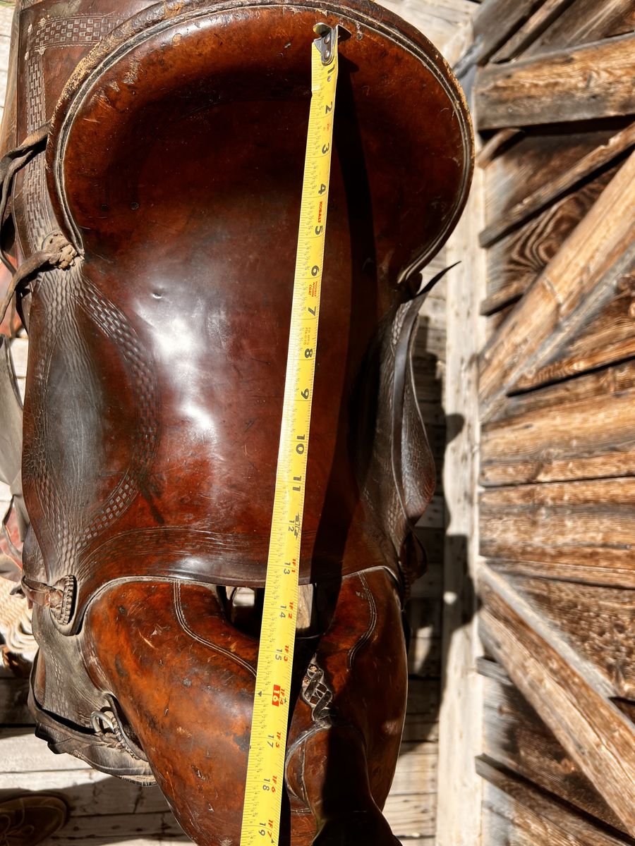 What a nice piece of history! This saddle shows original, roller boarder stamping on major parts. The saddle seat measurements are 16" seat / Fenders 17” long and wooden Western doghouse stirrups 5" wide x 5" high. This saddle is ready to ride, but could use new fleece or good pad I will include. The beautiful condition of this saddle does not show its true age. Has marks some wear from daily use. A classic Old West and Military Saddle that would add an air of authenticity to any western decor. The leather tie strings all good straps too. The tree is solid and true. You can count on this saddle to provide another century of service. Most of these were produced by Kansas City Saddlery back in the day. To have a saddle like this made new today would cost you $3000.00 plus. These 1917 model US Army "Packer's Saddles” are hard-to-find, in good using condition and features double rigging and the standard horseshoe nail pouch behind the cantle. All original. This saddle was used by packers who used mules to haul equipment for US troops into rough or remote locations like Gen. " Black Jack " Pershing's Pancho Villa Expedition into the mountains of Mexico. These saddles were made from 1917-1942 and saw service during WWII in as far away war zones as Burma. This is an early saddle as the later ones had rounded corners on the skirts. The leather is in good shape will clean up good with saddle dressing. Hate to sell it. See my other items for sale. I have original 1917 saddle bags, U.S. Bit. Saddle bags not included see other ad.