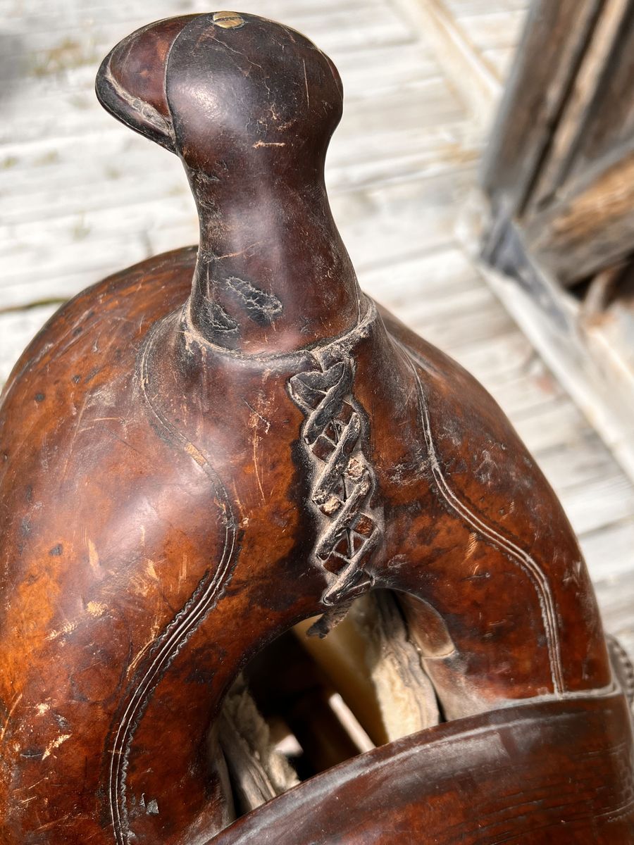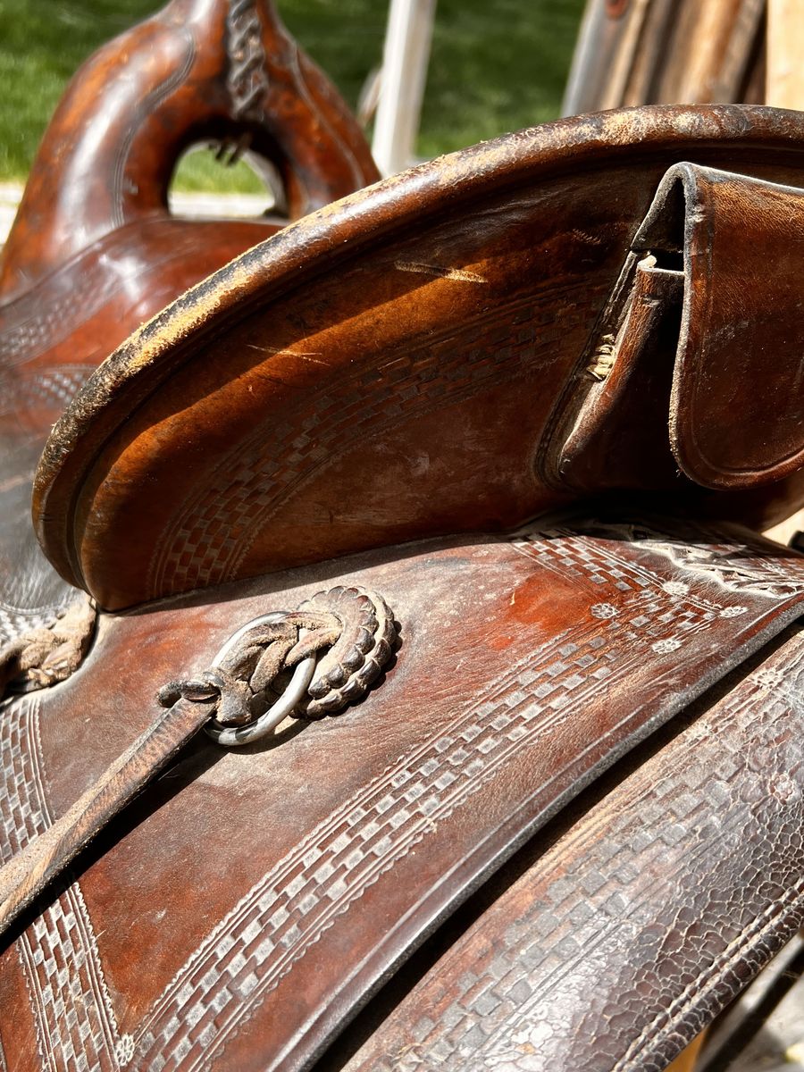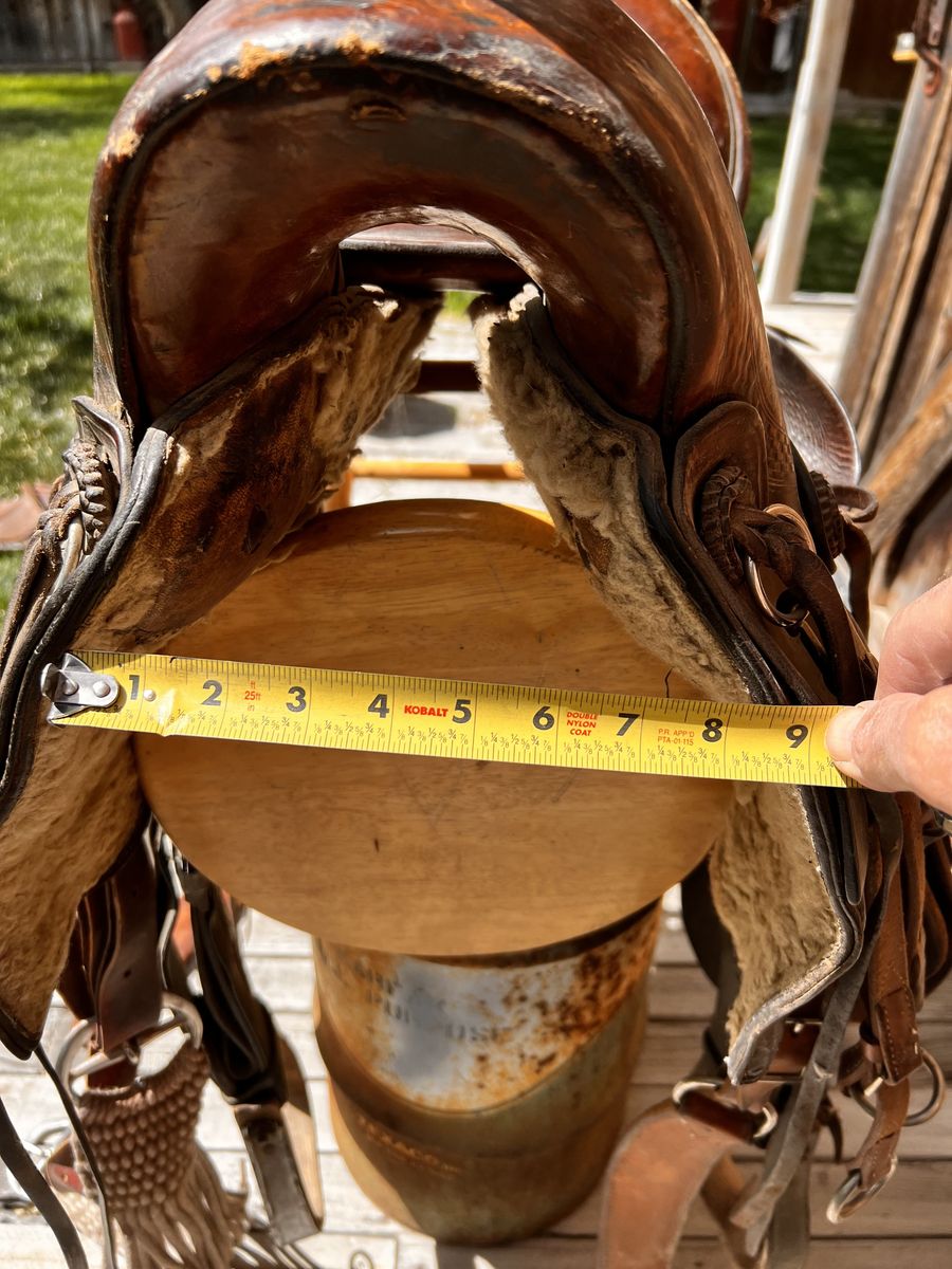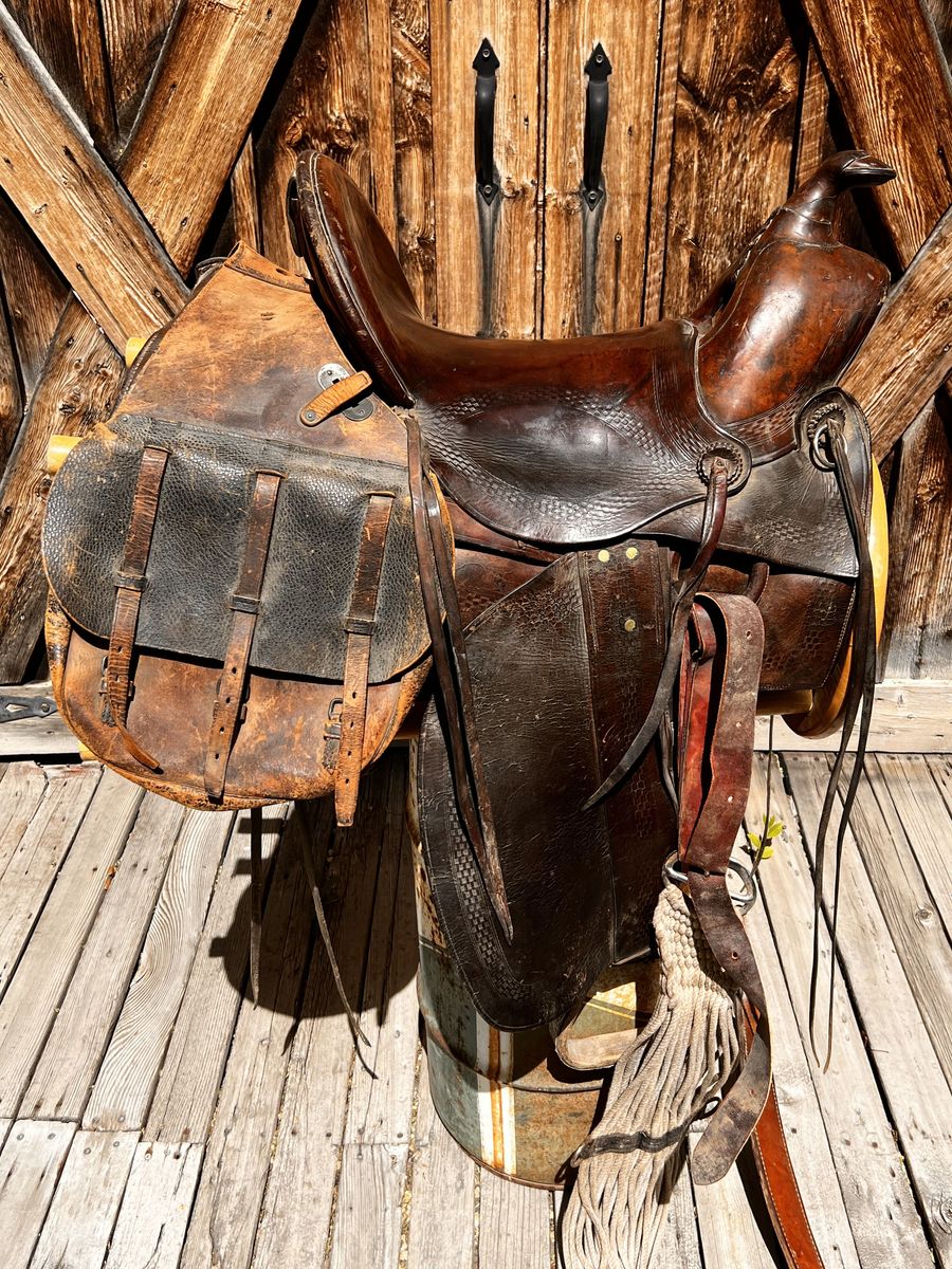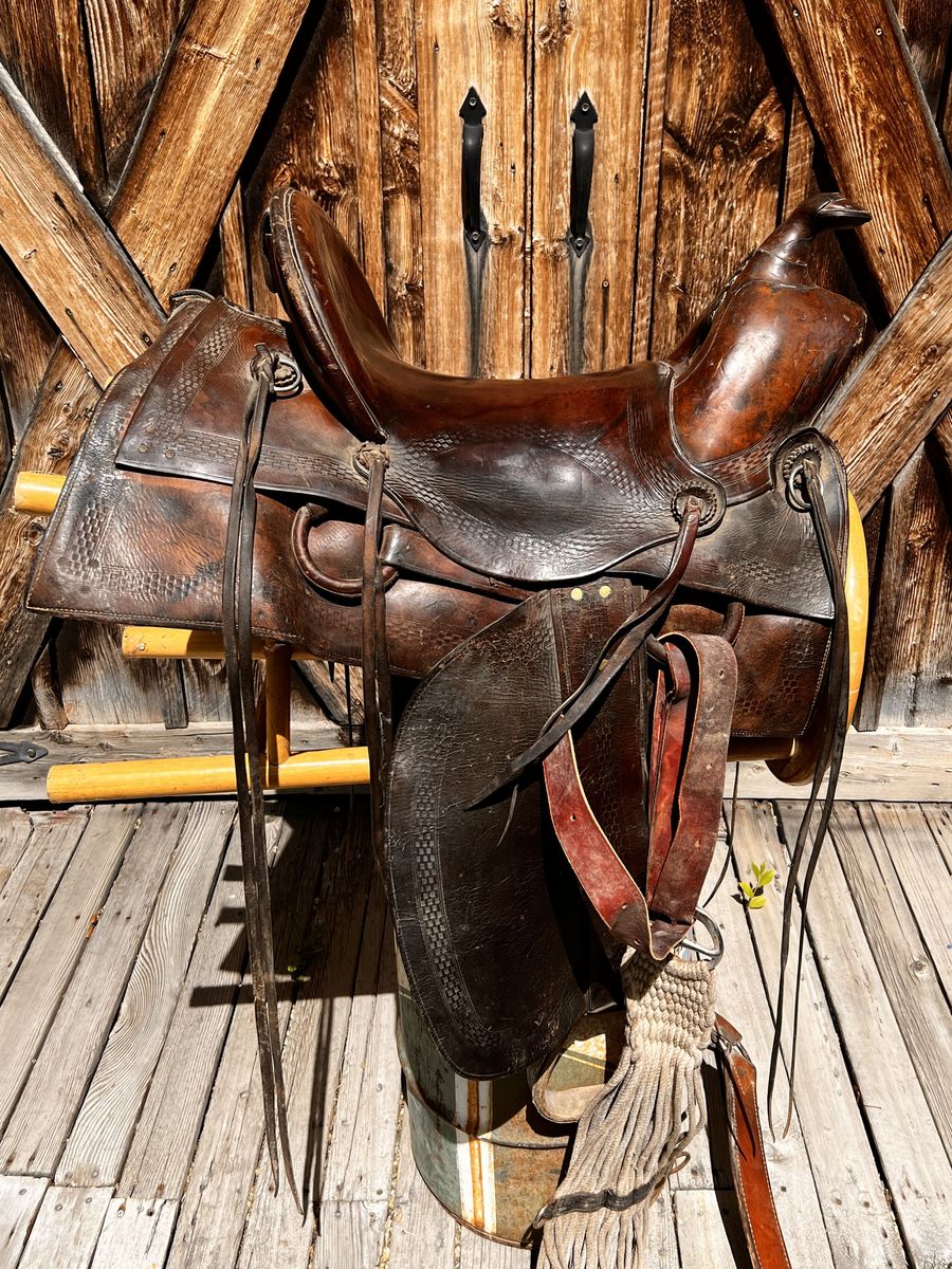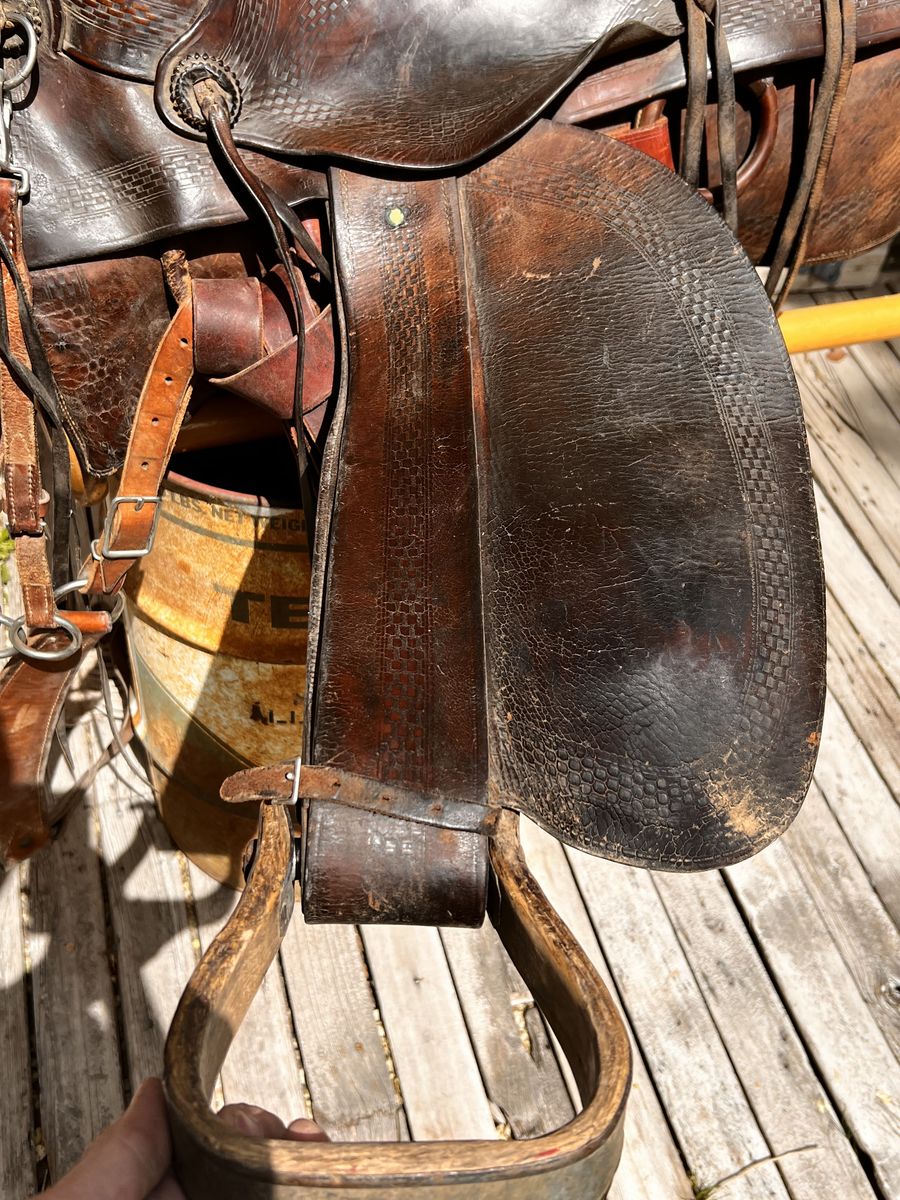 What a nice piece of history! This saddle shows original, roller boarder stamping on major parts. The saddle seat measurements are 16" seat / Fenders 17” long and wooden Western doghouse stirrups 5" wide x 5" high. This saddle is ready to ride, but could use new fleece or good pad I will include. The beautiful condition of this saddle does not show its true age. Has marks some wear from daily use. A classic Old West and Military Saddle that would add an air of authenticity to any western decor. The leather tie strings all good straps too. The tree is solid and true. You can count on this saddle to provide another century of service. Most of these were produced by Kansas City Saddlery back in the day. To have a saddle like this made new today would cost you $3000.00 plus. These 1917 model US Army "Packer's Saddles” are hard-to-find, in good using condition and features double rigging and the standard horseshoe nail pouch behind the cantle. All original. This saddle was used by packers who used mules to haul equipment for US troops into rough or remote locations like Gen. " Black Jack " Pershing's Pancho Villa Expedition into the mountains of Mexico. These saddles were made from 1917-1942 and saw service during WWII in as far away war zones as Burma. This is an early saddle as the later ones had rounded corners on the skirts. The leather is in good shape will clean up good with saddle dressing. Hate to sell it. See my other items for sale. I have original 1917 saddle bags, U.S. Bit. Saddle bags not included see other ad.