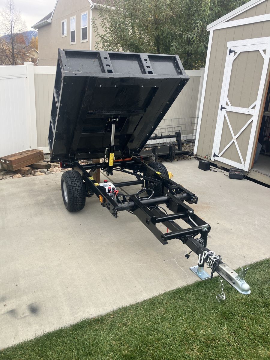 One of a kind mini dump trailer 4’8” overall width, so this will go through a 5’ gate. 2” coupler, tongue fold up jack, tongue tool box, new rims/tires and spare , GVW 3500lb, LED lights, all new wiring and hydraulics, tilt out and down tailgate, 12” side extensions. This is a solid, beefy little trailer. Has remote for hydraulics. Clean title in hand. Not sure you could even find something quite like this, it was made from the back end of a Jacobsen truckster(golf course utility truck) would be perfect behind a side by side.