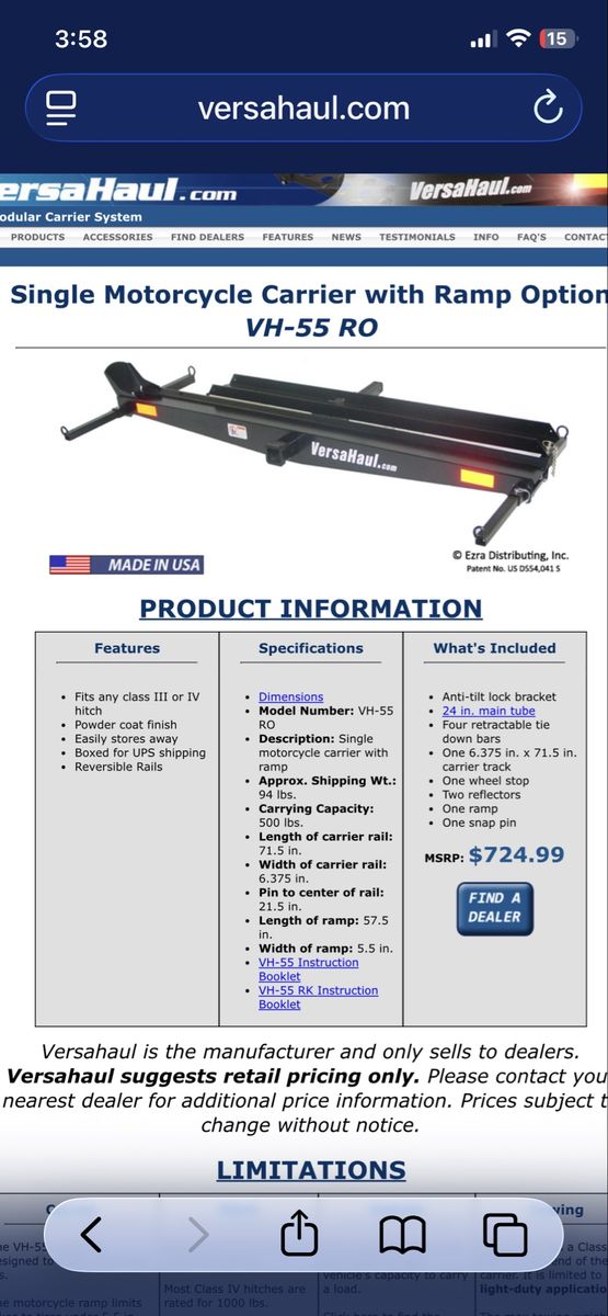 Selling a Versa Haul brand motorcycle hitch carrier. Its in good shape and hasn’t been used much. A little dirty from sitting in a shed. Rated for road bikes. $300 obo
