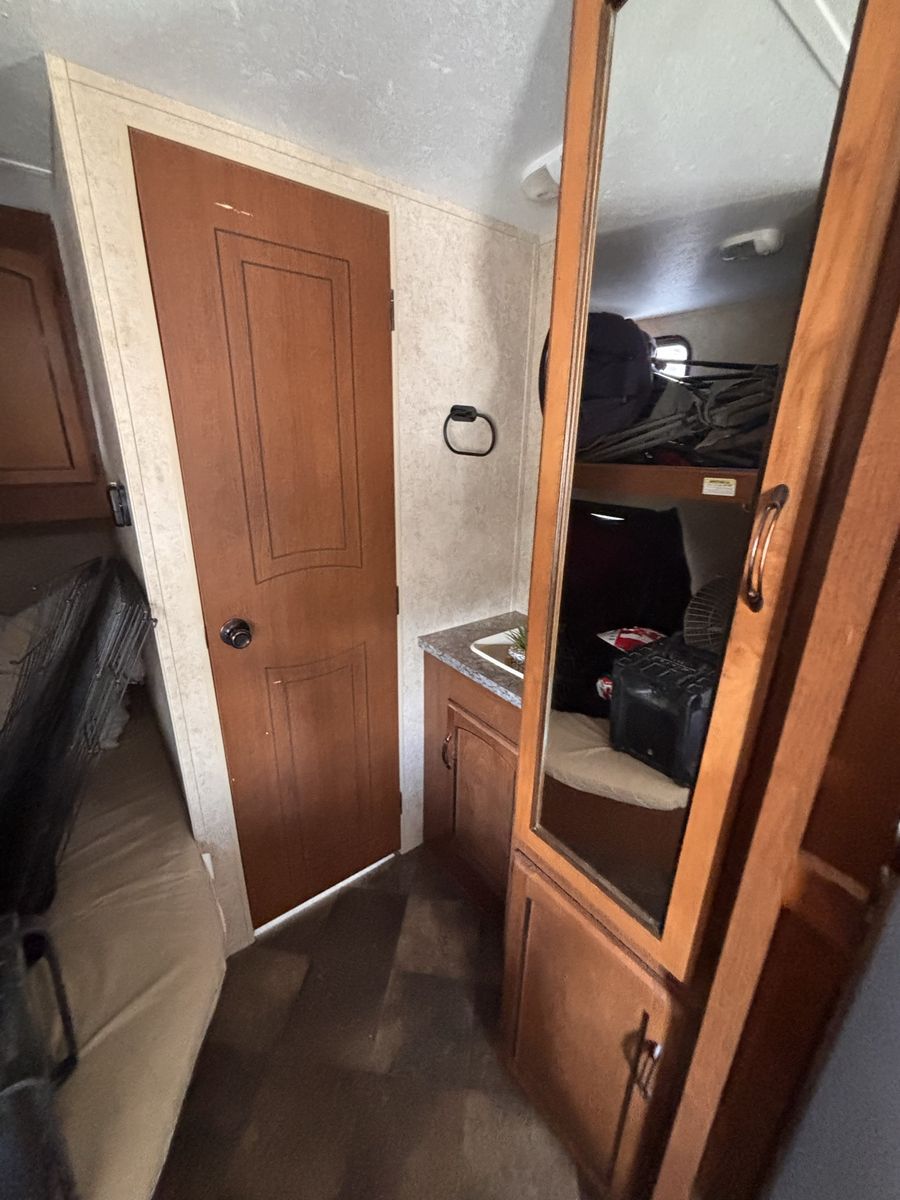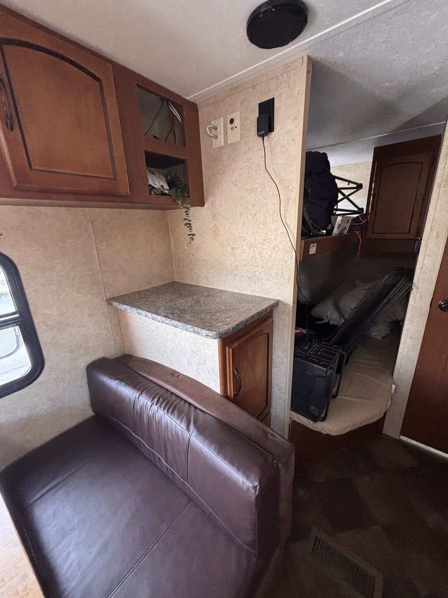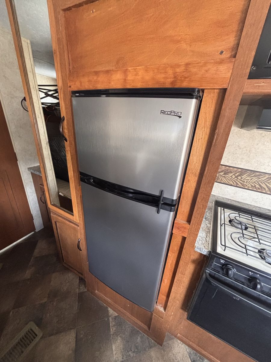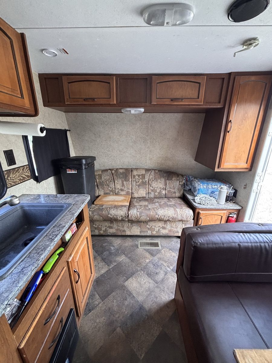 19 foot bumper pole. Everything works great. Previous owner had AC unit removed so does not have AC but all wiring should still be there to put one in. We’ve really loved this trailer just looking for something bigger. No slide out. Half ton towable. New aftermarket fridge and microwave. Tires are about one camping season old. No water damage. Text with any other questions.
