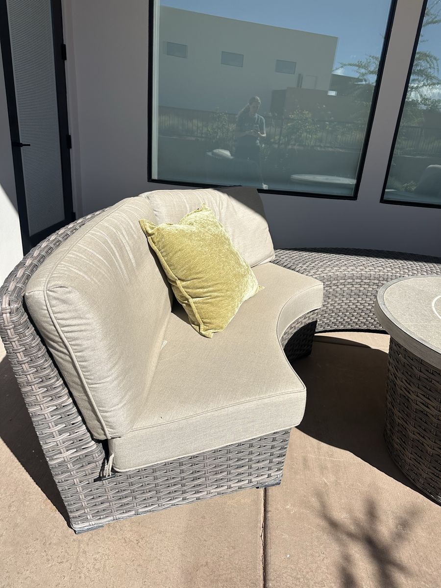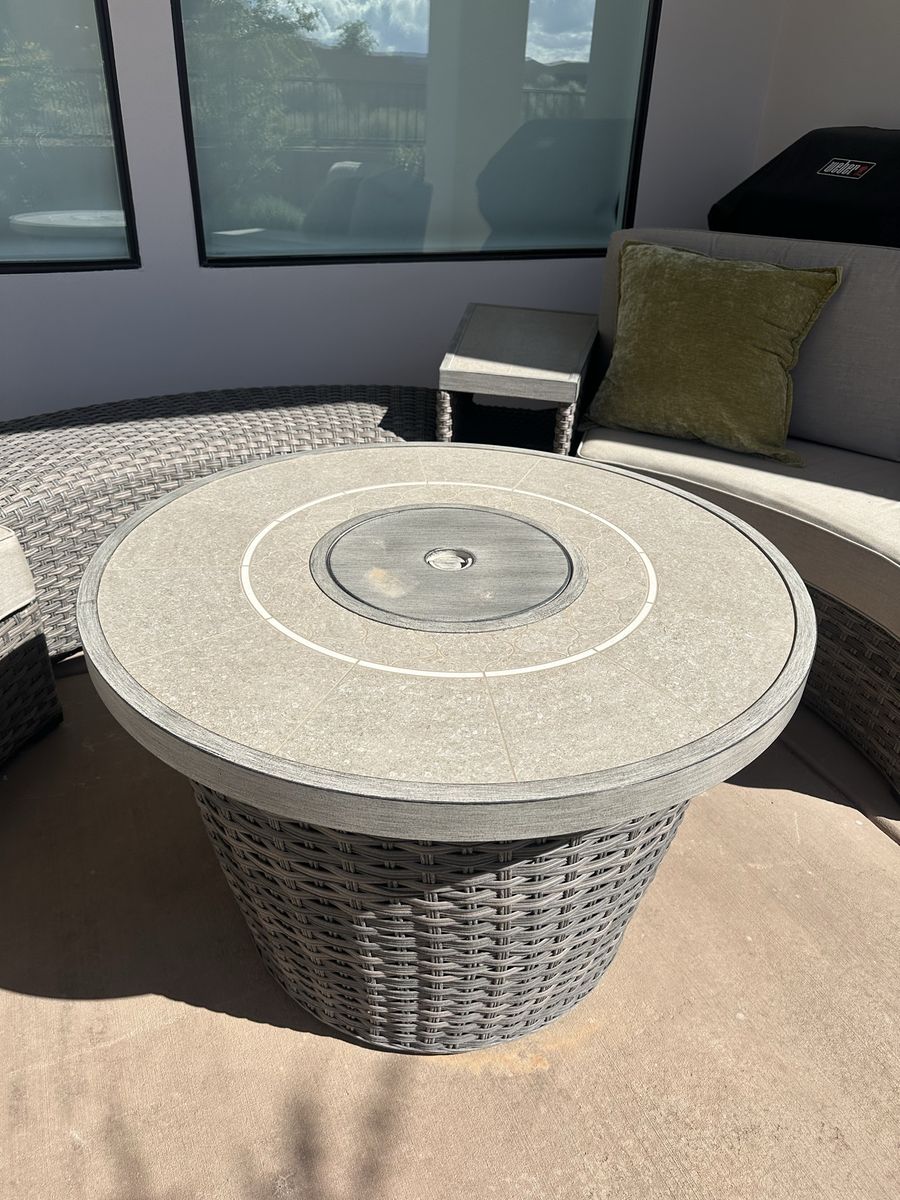 Beautiful outdoor seating set with matching fire pit table. This setup is in excellent condition and perfect for entertaining or relaxing.