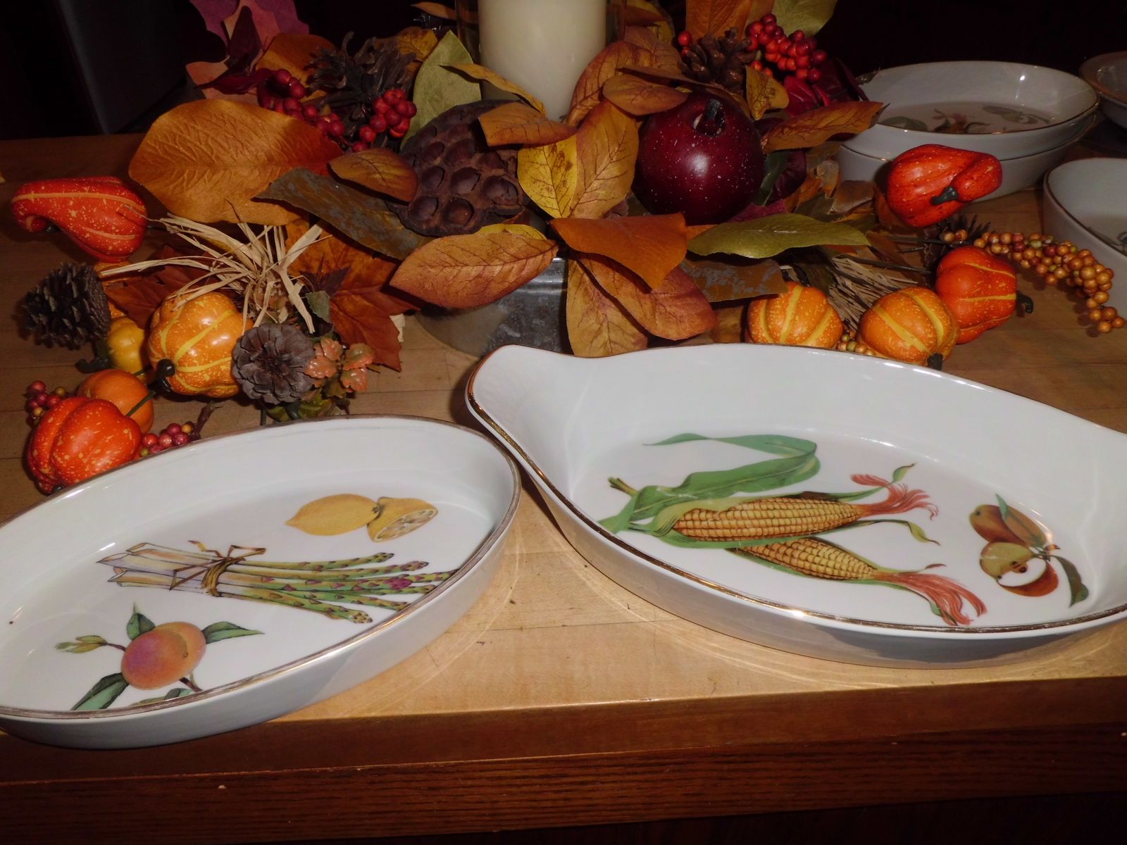 Evanshan Gold Round Pudding Bowls, Approx. 6 1/2 " X 4"deep, Fruit on the sides with a peach at the bottom of the bowls at $20 each. One is in like new condition and the other has a slight scratch on the peach. Evansham Gold Round serving bow., 8"X 3" deep with fruit on slides, gold rim at $20. Evansham Gold Oval Serving Dishes, Oval one with asparagus is 10"x 6" x 1 1/2" deep approx., priced at $25. Other is an Augratin Serving dish with corn and semi handles, approx. 7" x 10 1/2" x2" deep, priced at $25. Any wear is minimal. China made in England.