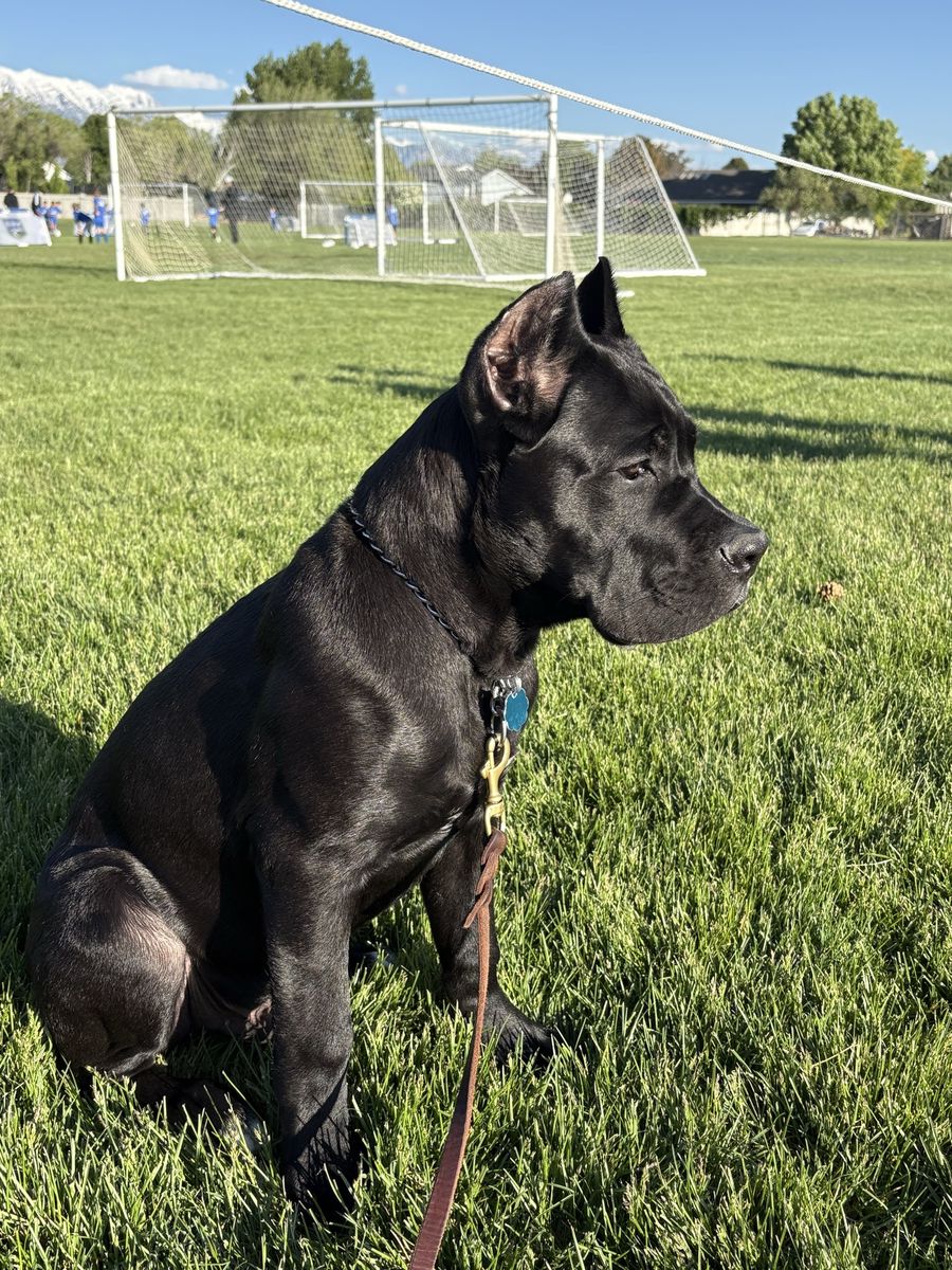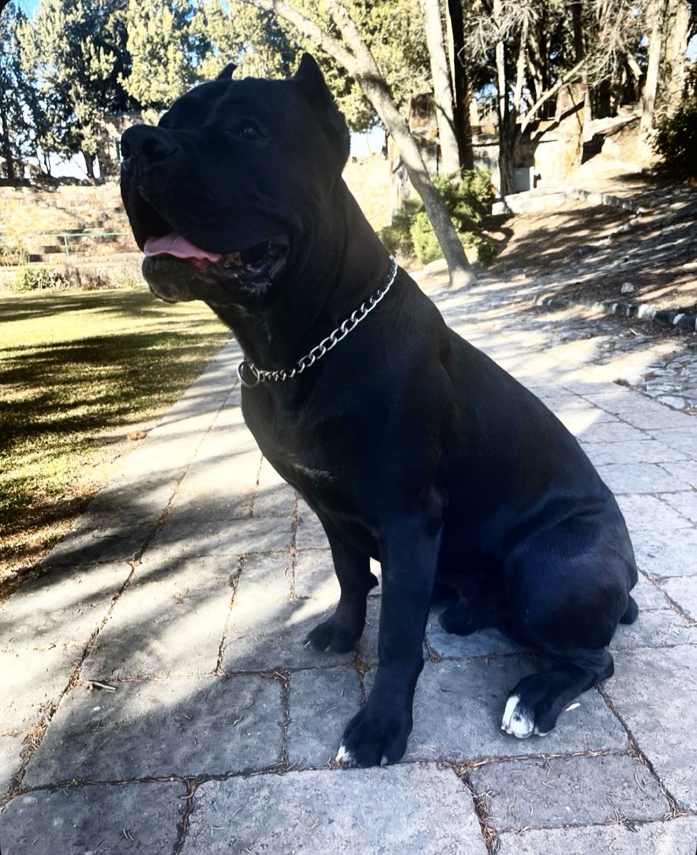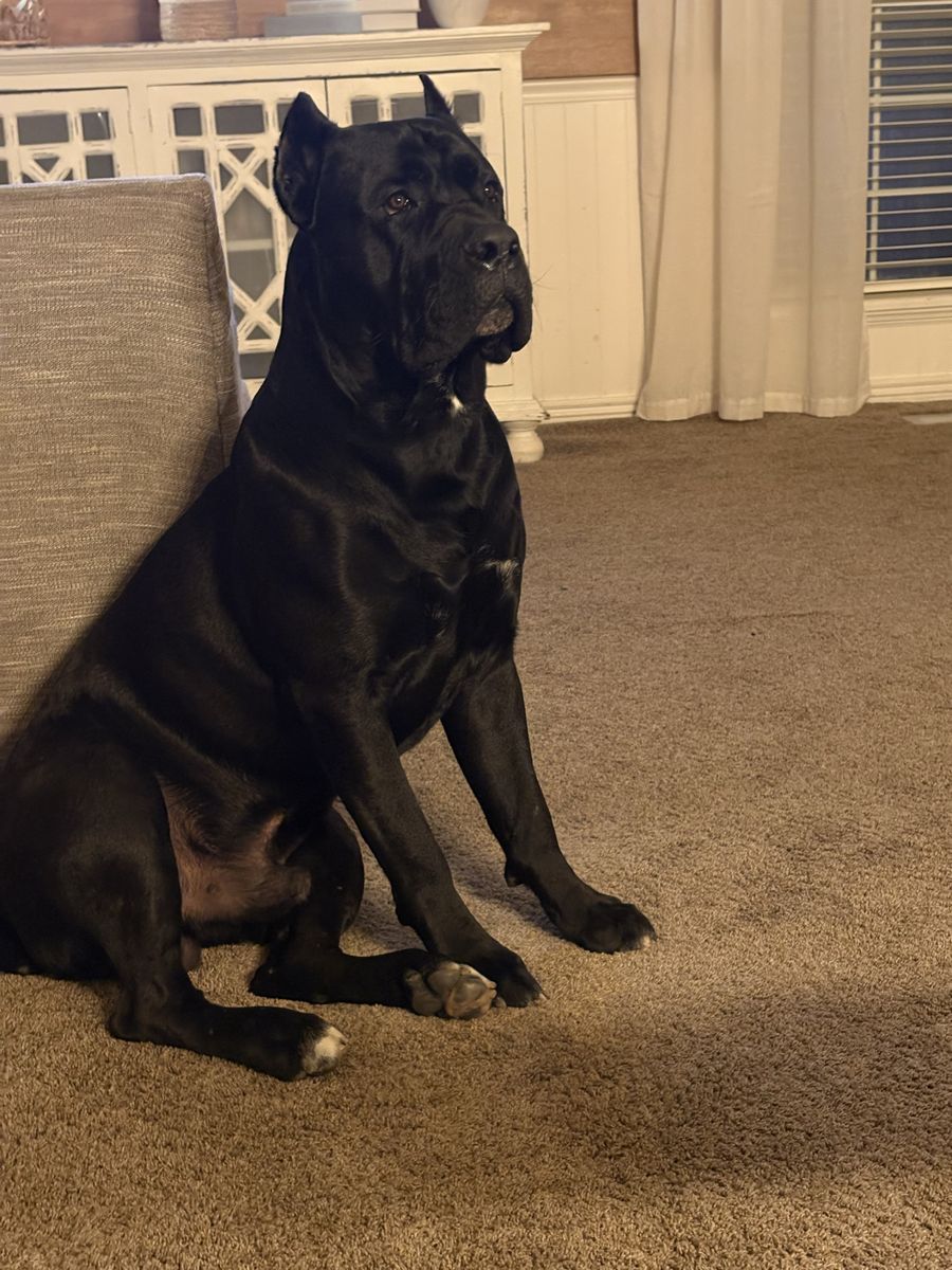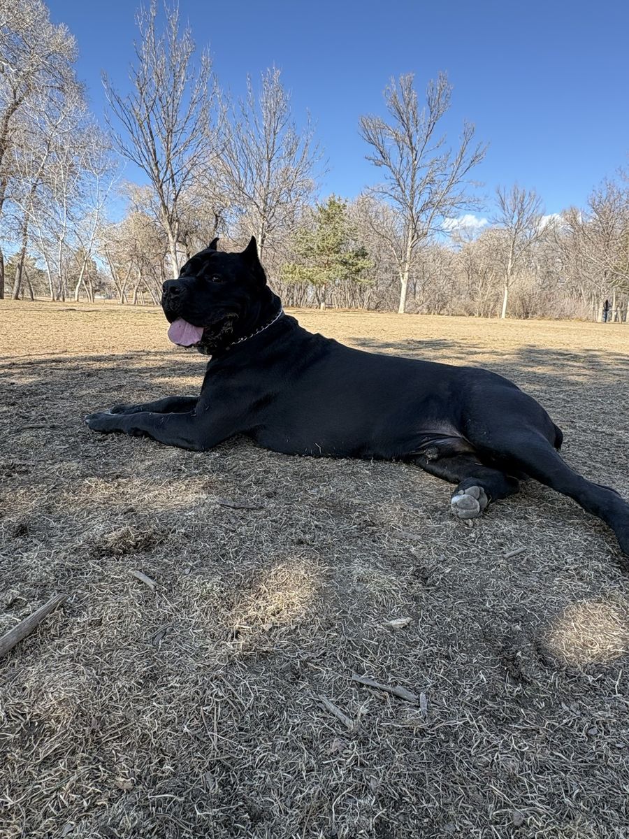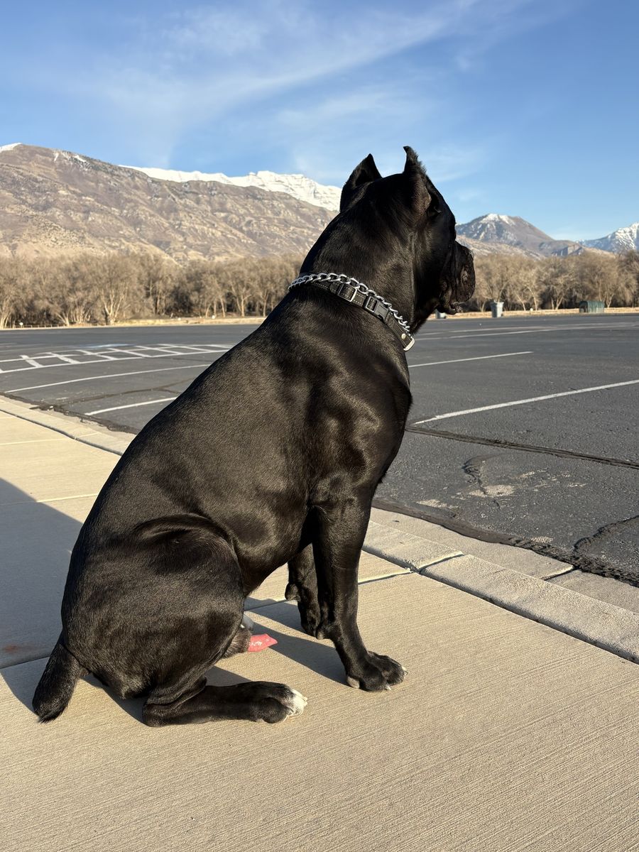 Powerful, well-built black Cane Corso male available for stud. 15 months old and already weighing in at 140 lbs with a strong, athletic frame and excellent presence.