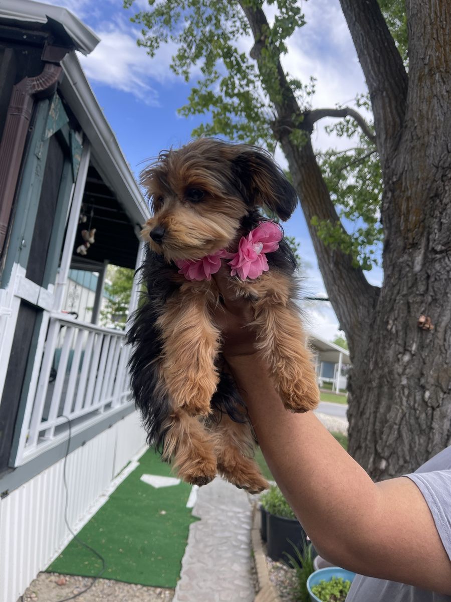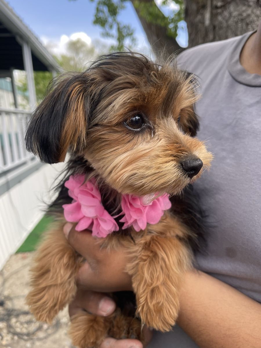 ZelleLily is a 4-month-old Yorkie mix. She's 4pounds 9oz. She has her shots. She has an upcoming shot on May 2nd that has already been paid for. She's also potty-trained.