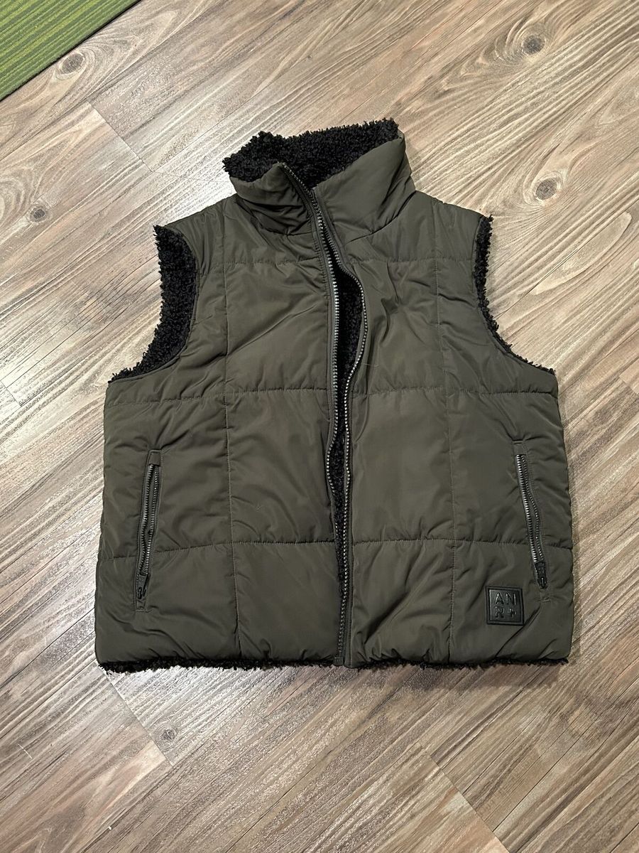 PayPalARMANI EXCHANGE SHERPA FAUX BLACK/ OLIVE GREEN reversible puffy vest. In new condition. This is a men's small or a woman's large. Unisex reversible. Black Sherpa or olive green exterior. Zips straight down the middle all the way up to the collar with side pockets also that zip. No signs of ware. Smoke and pet free. Machine washable. $70