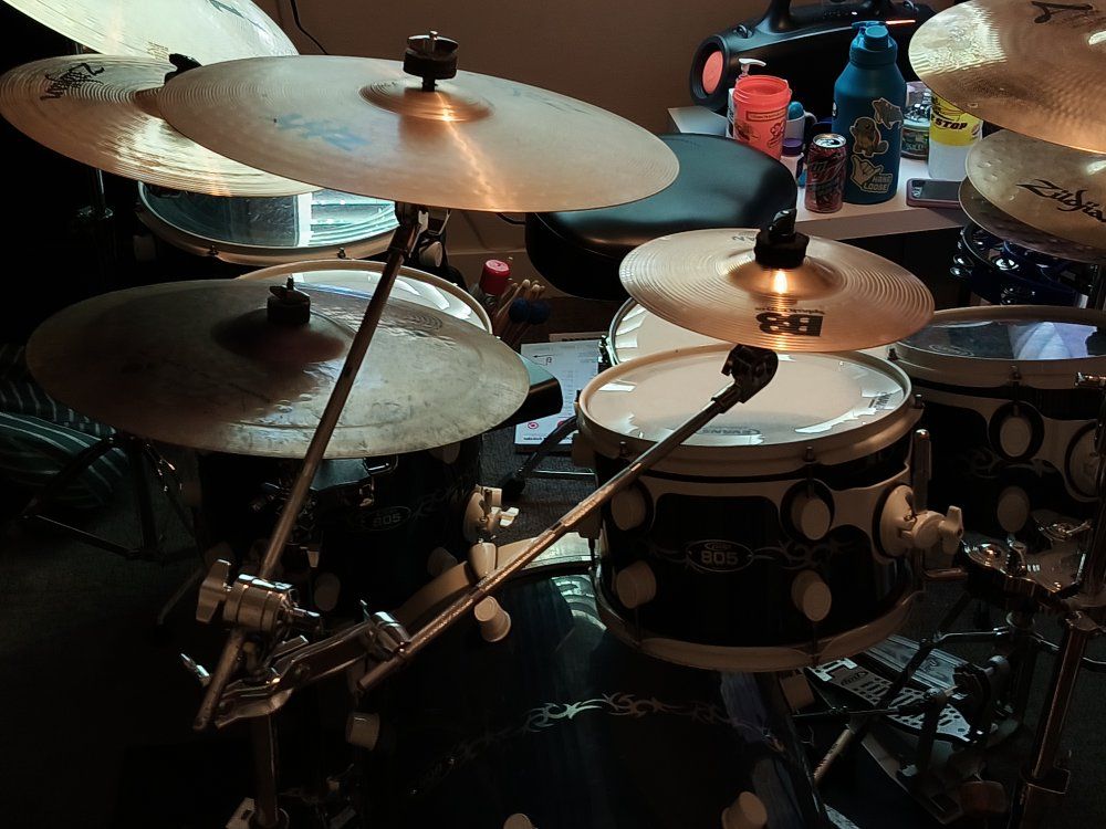 It is a great set with a great Sound. PDP Six piece Drum set with: Virgin Bass Drum Chad Smith Snare Rack toms 10" and 12" with their own stand PDP Double Chain Bass Drum Pedal Pearl High hat stand with Zildjian Hats Zildjian A Crash Zildjian AXT Crash Zildjian I Crash Zildjian I Ride Sabian. Splash Cowbell with Arm Tambourine and block set with arm. Extra Cymbal stands. Stand Alone 16" and 18" Floor Toms