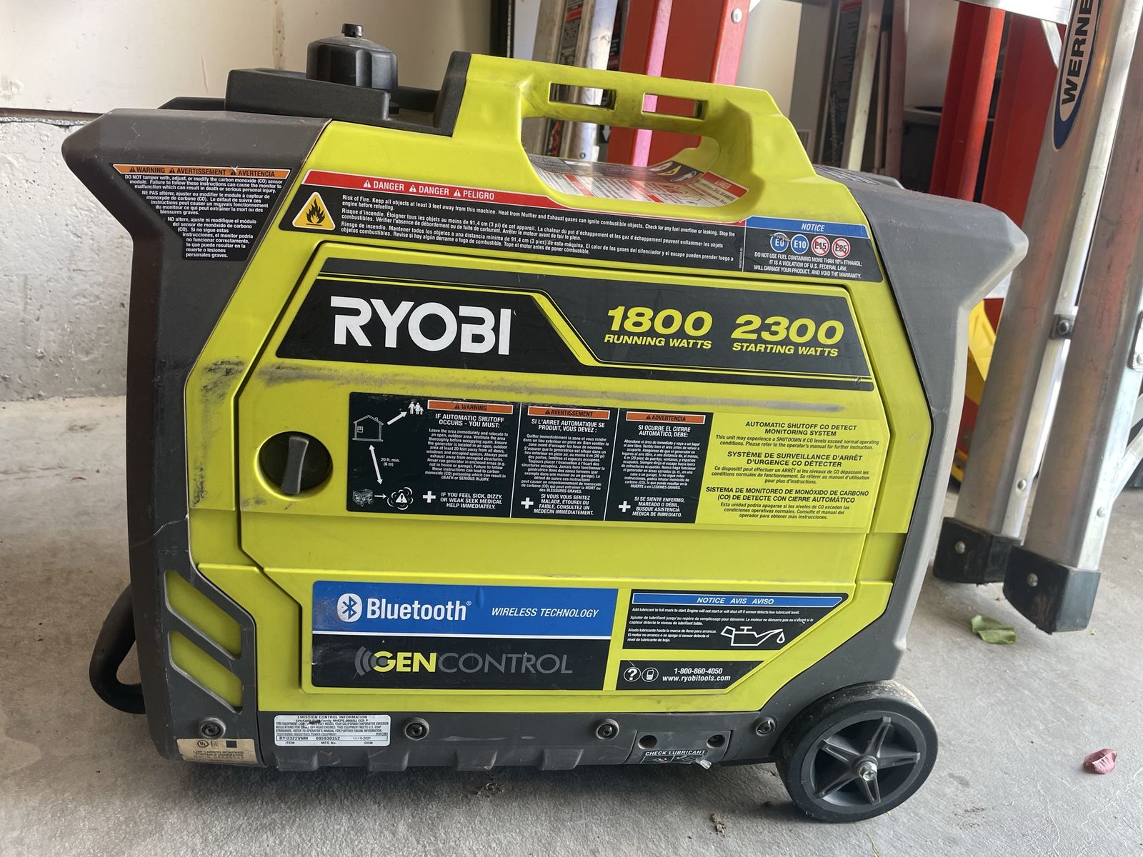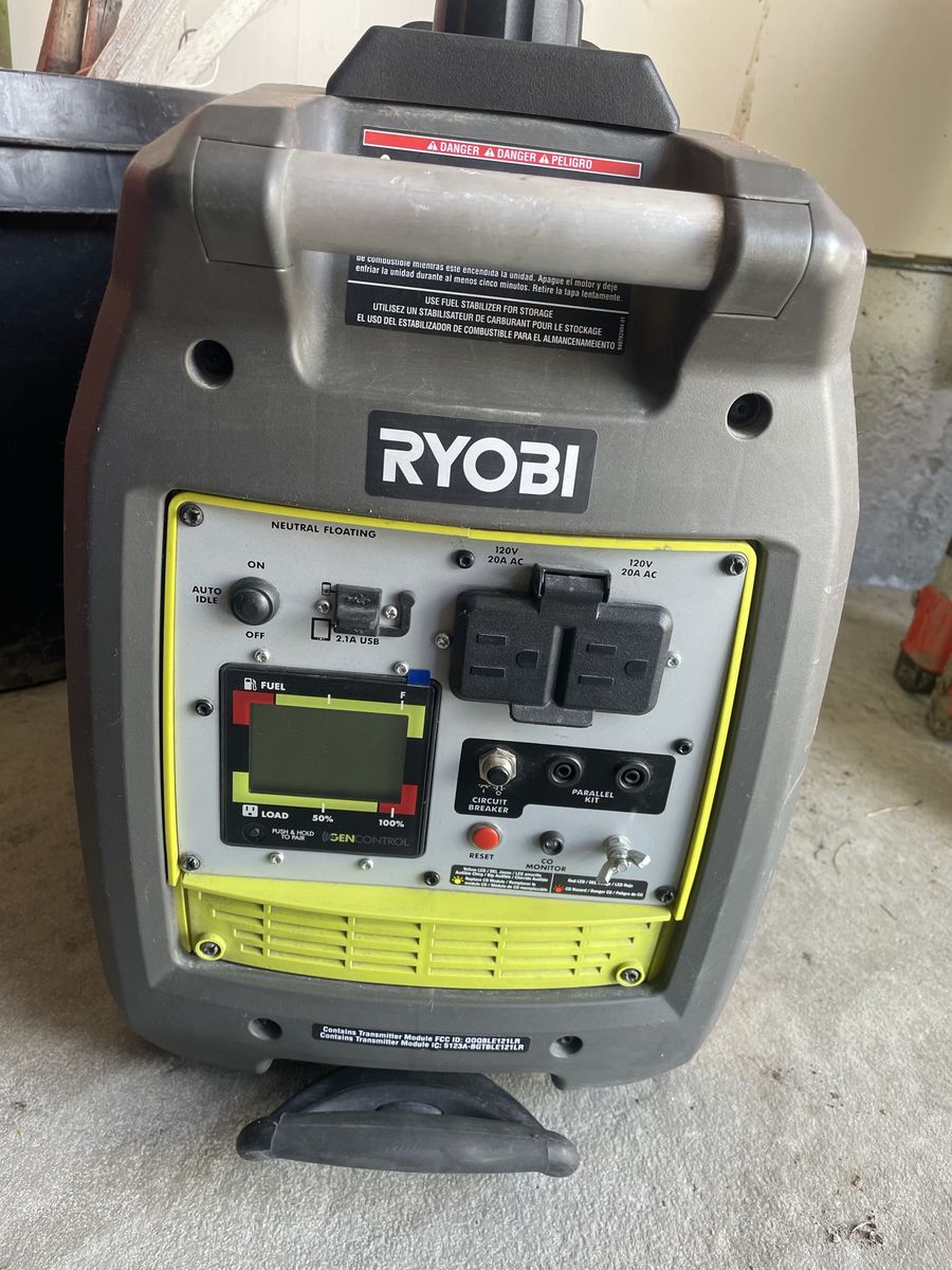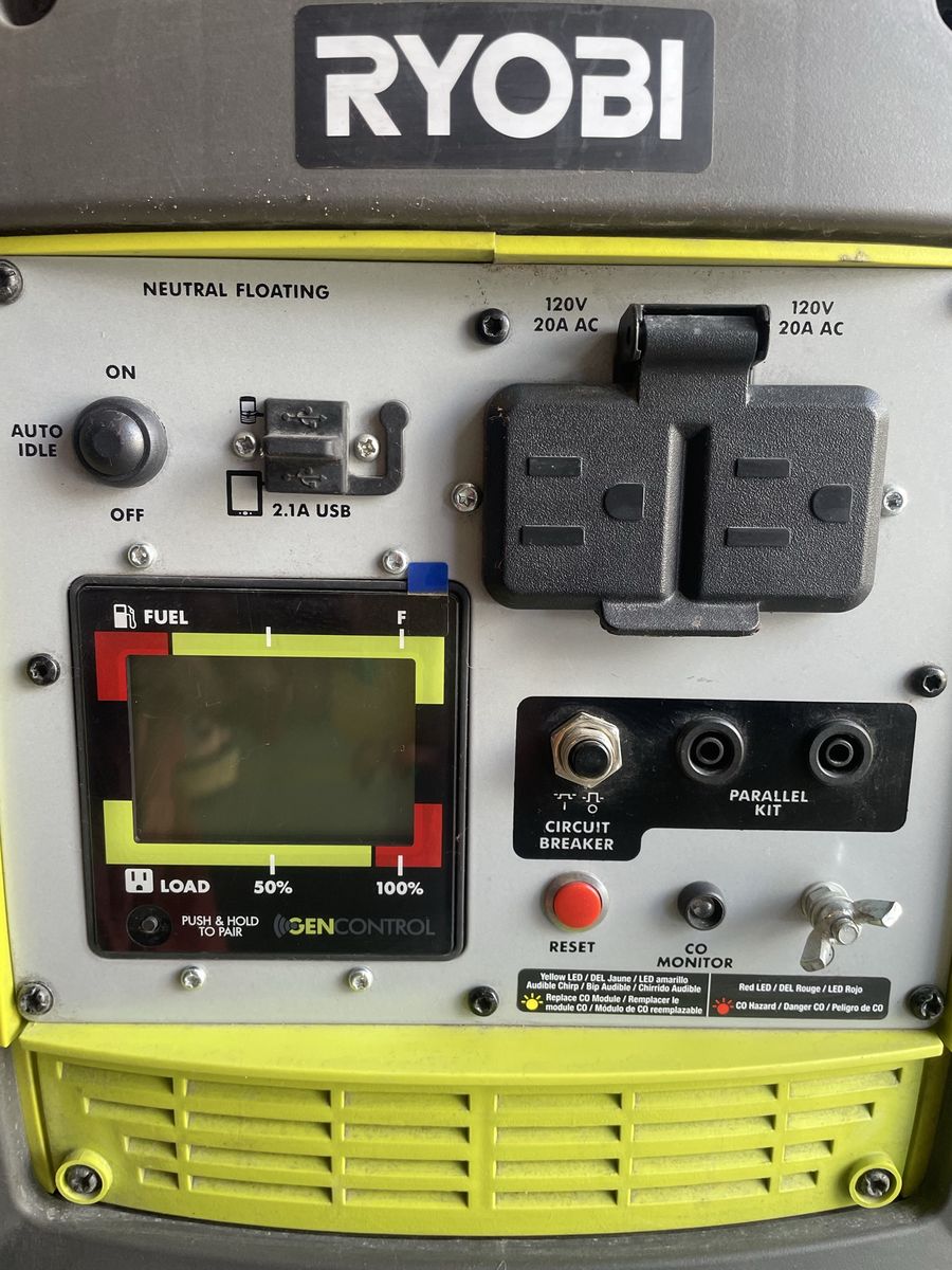 2,300 starting watt, 1,800 running watt Automatic CO shutoff with CO sensor for increased safety Very quiet operation RYOBI GenControl app: monitors power consumption, fuel level and runtime remaining on your apple or android smartphone Board LCD displays fuel level, runtime remaining and load level On-board overload reset button and remote reset capable using free GenControl app Remote shutdown capable Ultra-portable: telescoping handle, dual rear wheels, suitcase carrying handle, front and rear handle assembly Parallel kit capable: connect 2 generators together with the available parallel kit for twice the power output Two 120-Volt outlets and 2 USB ports Fuel efficient: auto-idle fuel-saving technology