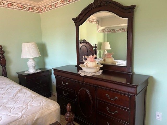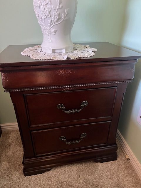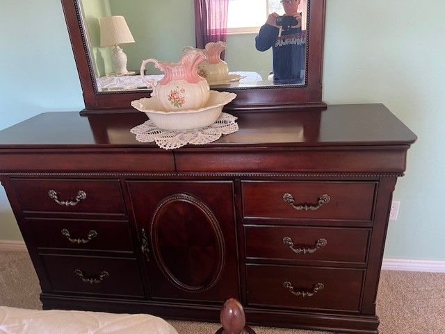 PayPalQueen size bed with mattress and box spring, two end tables, two lamps, and dresser with mirror. Great Cherry color.
