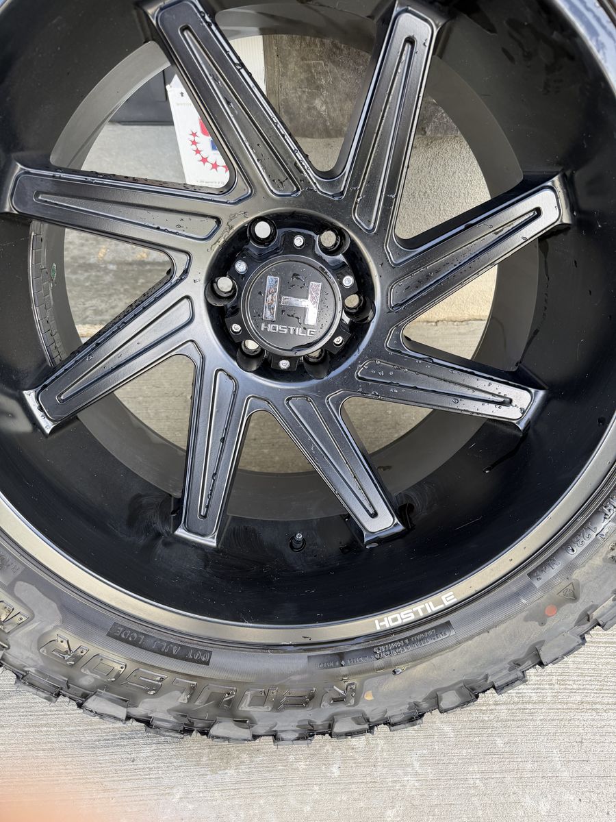 Selling a clean set of Hostile H119 Dagr wheels with Radar Renegade-X mud-terrain tires, taken off a 2020 Ram 1500.