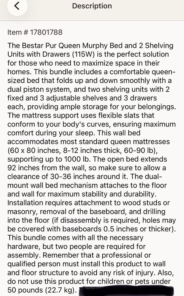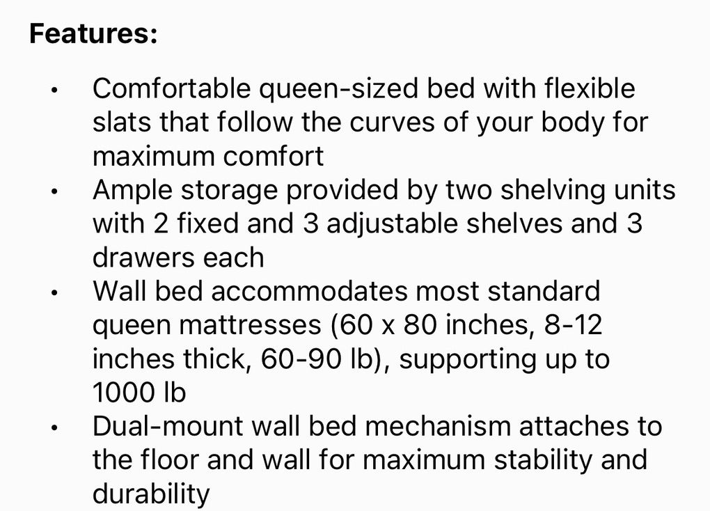 Features: • Queen-size wall bed with smooth fold-down dual piston system • Fits standard queen mattress (60” x 80”, 8–12” thick) • Supports up to 1000 lbs • Flexible slat system for comfort • Includes 2 shelving units, each with: • 2 fixed shelves • 3 adjustable shelves • 3 drawers • Extremely stable design that mounts to wall and floor • Bed extends approx. 92 inches when open