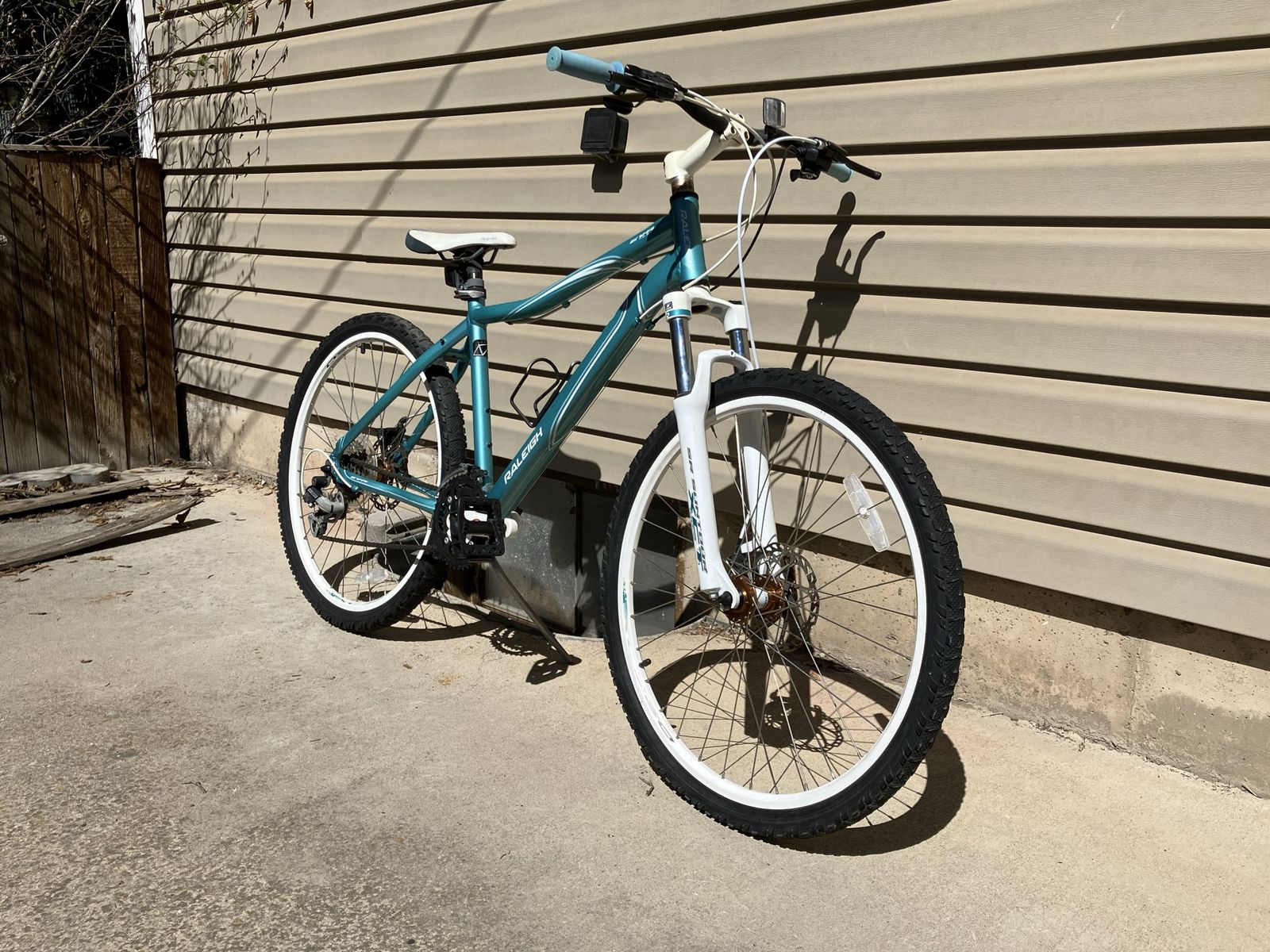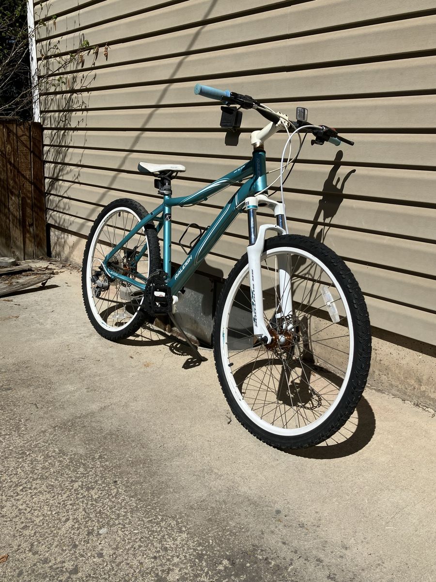 PayPalBeautiful Raleigh Eva 4.0. Shimano Acera 3x8 drivetrain. Suntour cranks. Frame is 43 cm aluminum. Avenir seat. Dual bottle cage mounts, with one cage installed. Adjustable front suspension. Recently tuned, no flats, ready to ride. Proceeds benefit local charity.