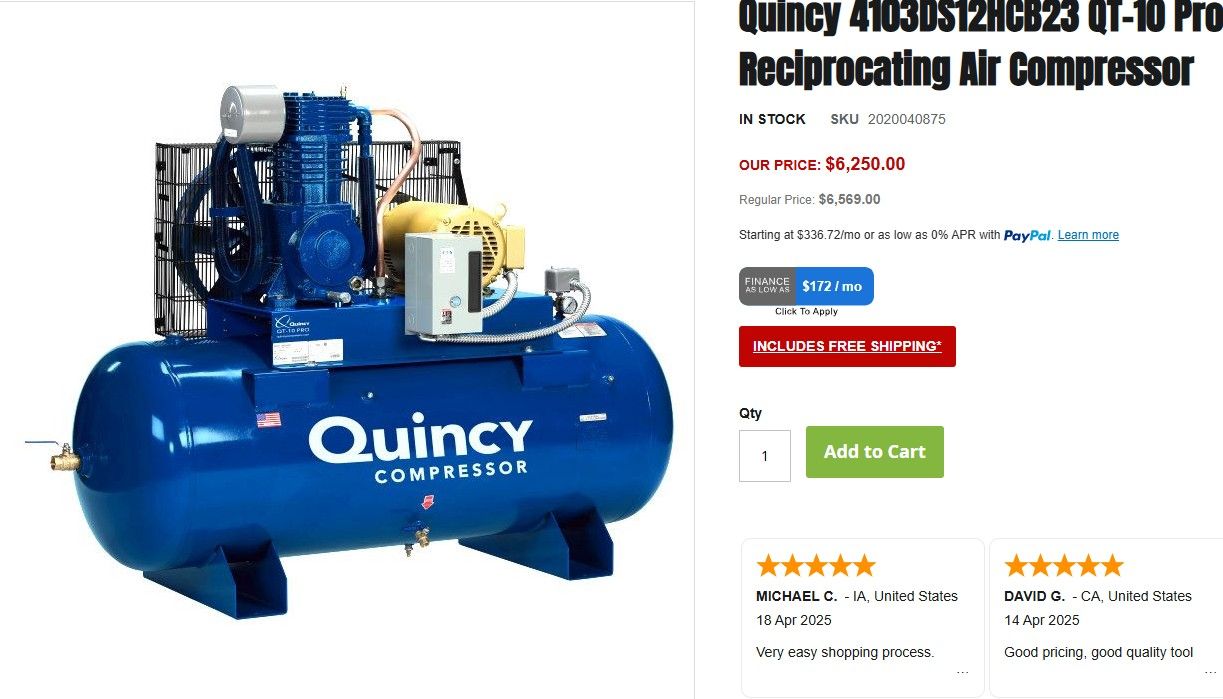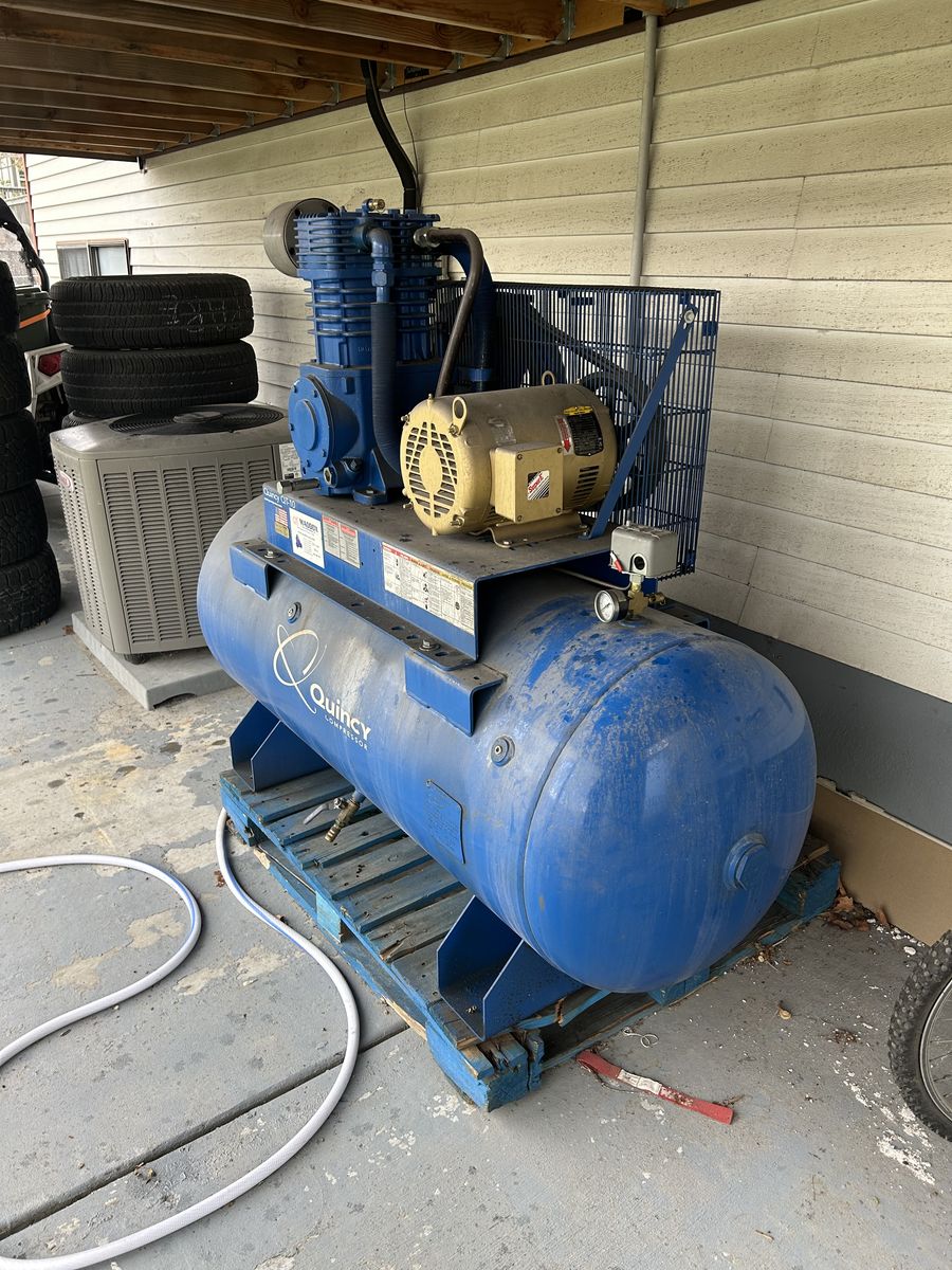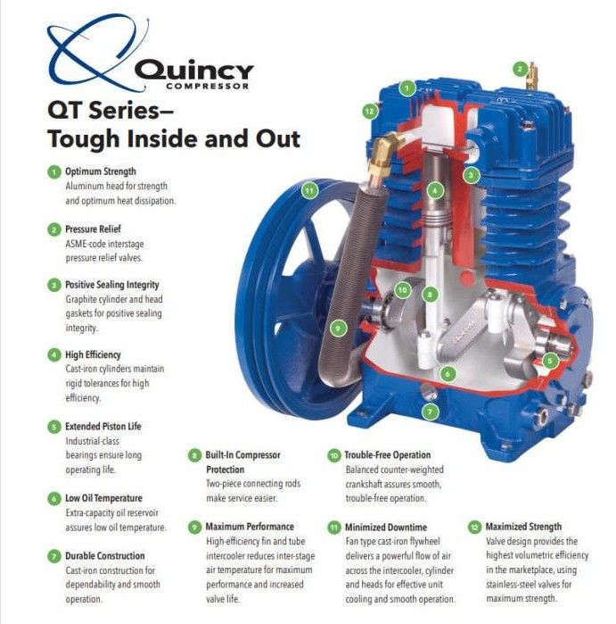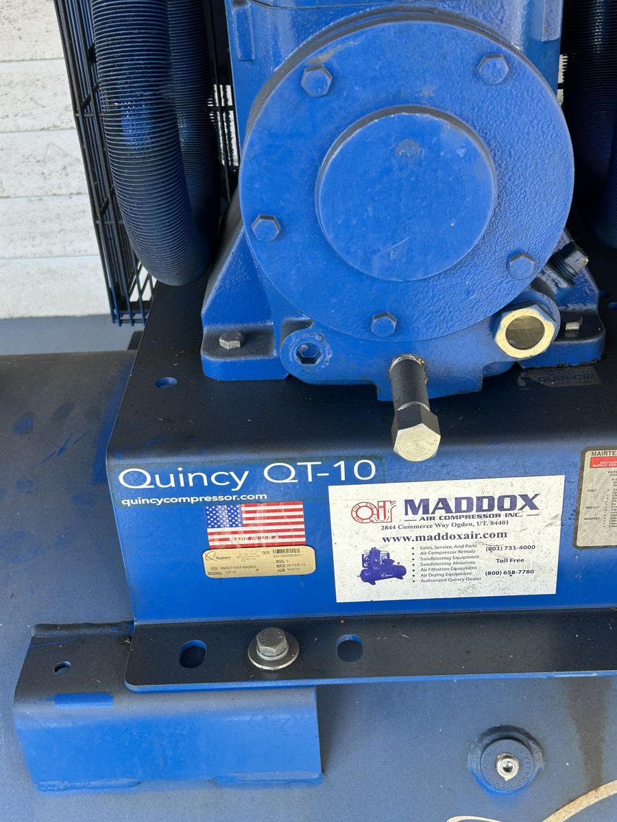The Quincy QT-10 is a heavy-duty, 10-horsepower, two-stage splash-lubricated air compressor designed for industrial applications. It typically provides 35-36 CFM at 175 PSI, features a 120-gallon ASME tank, and is 3-phase voltages (230/460V), designed for a 100% duty cycle. The QT-10 is often used in industrial settings requiring high air volume and 175 PSI, with low operating temperatures. This compressor is perfect for most shops and is ready to drop in and Start supplying compressed air.