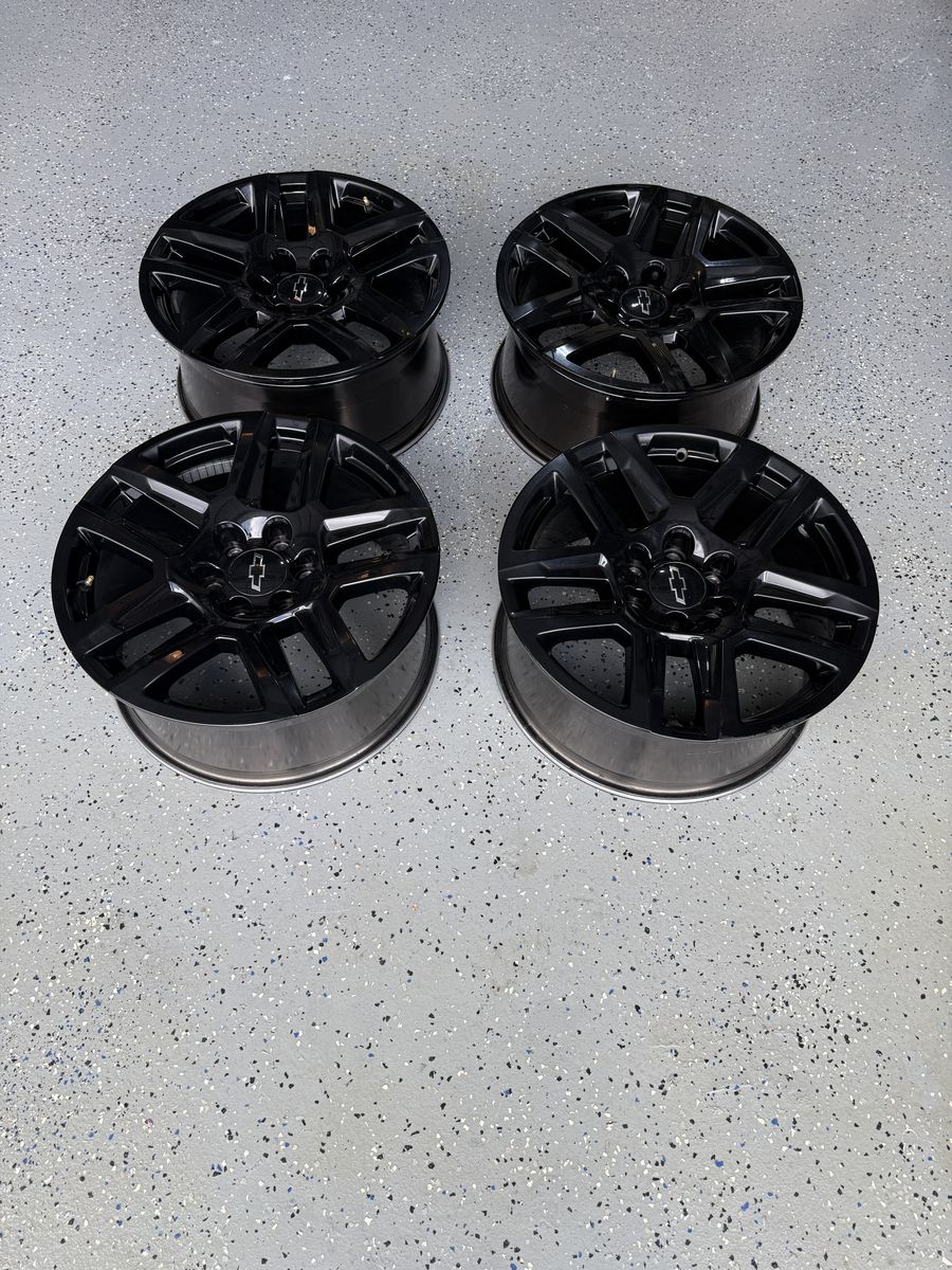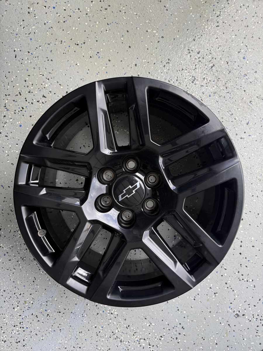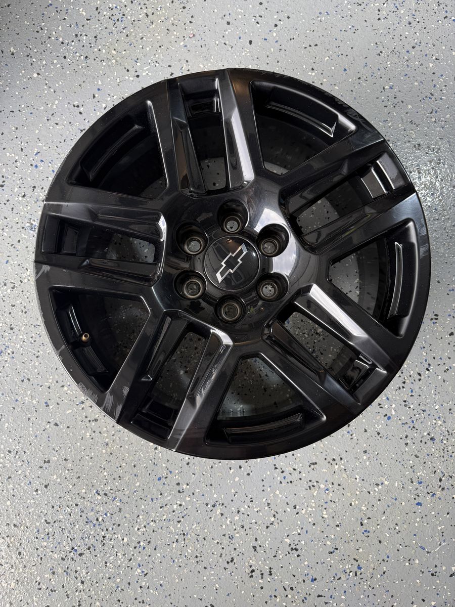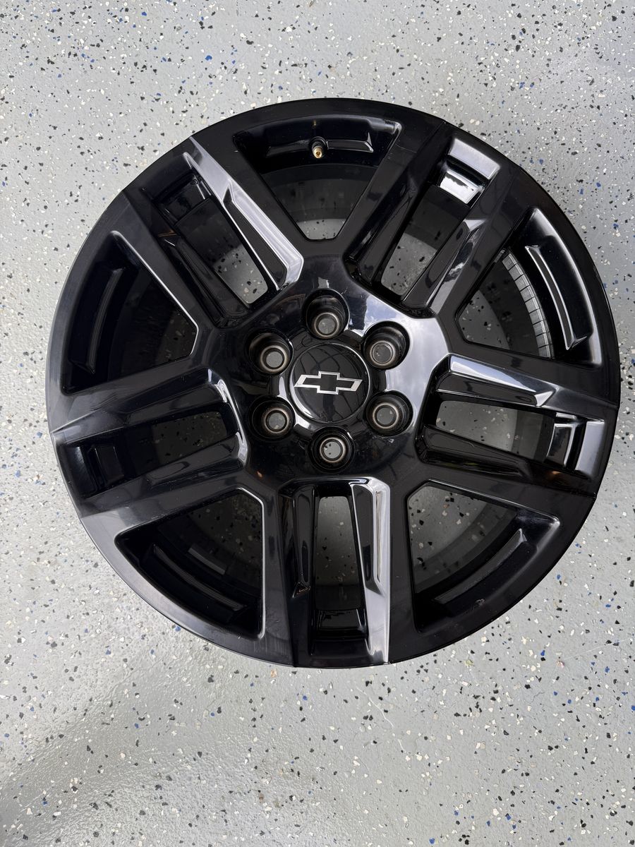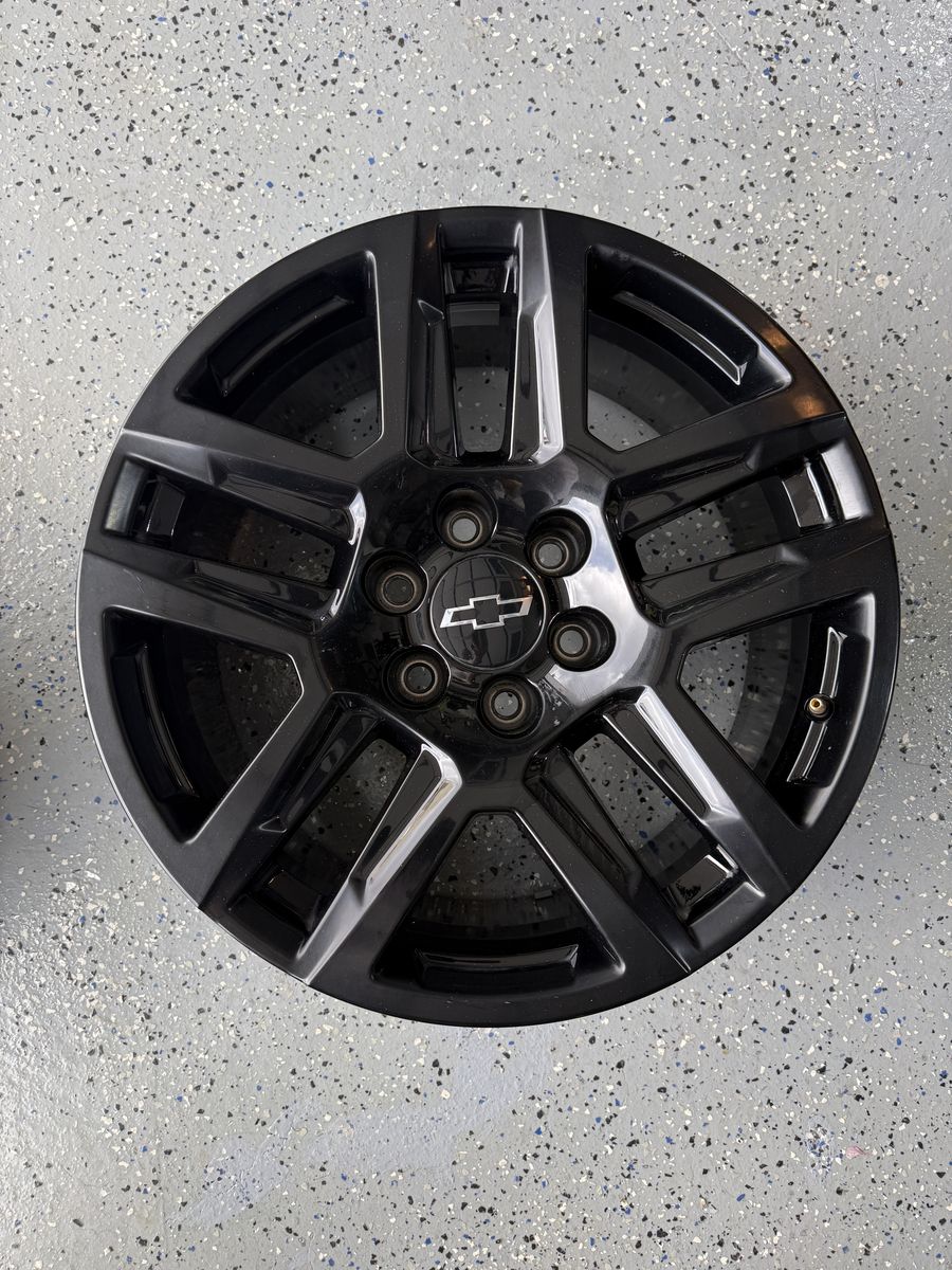 Factory gloss black 20” wheels pulled from a Chevy Silverado Trail Boss. These are OEM — not replicas, not painted aftermarket. Clean, sharp, and ready to bolt on.