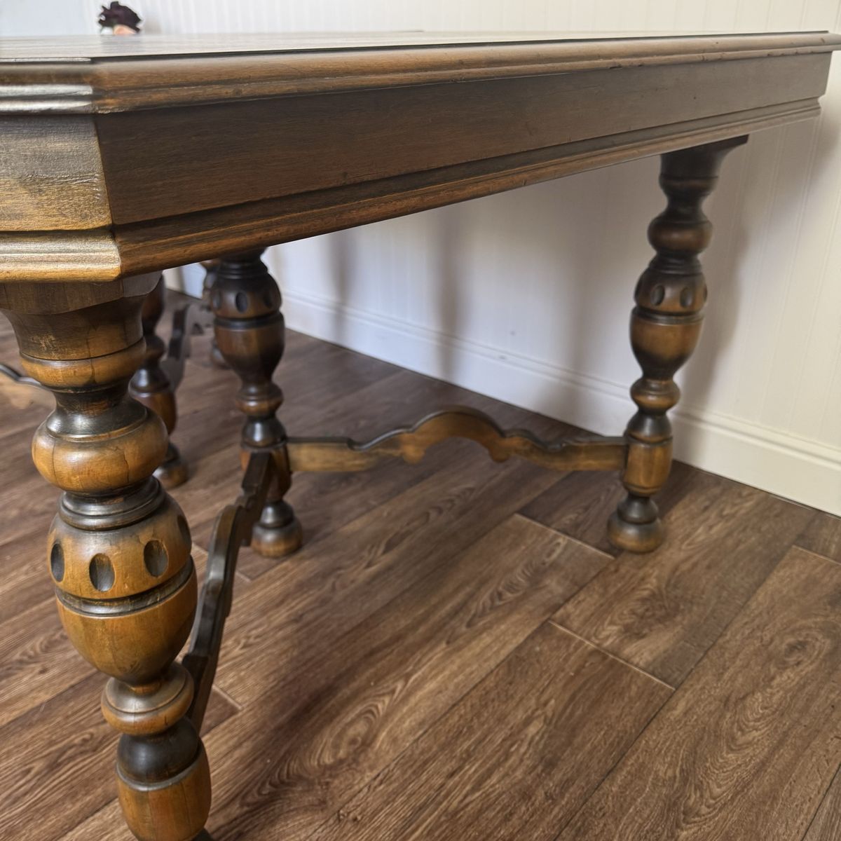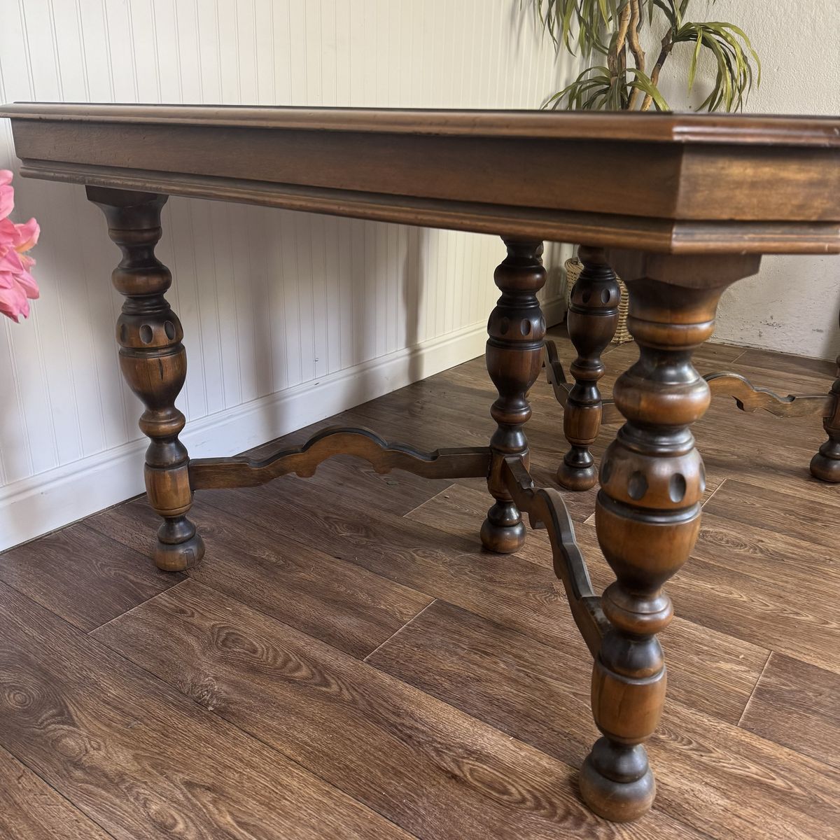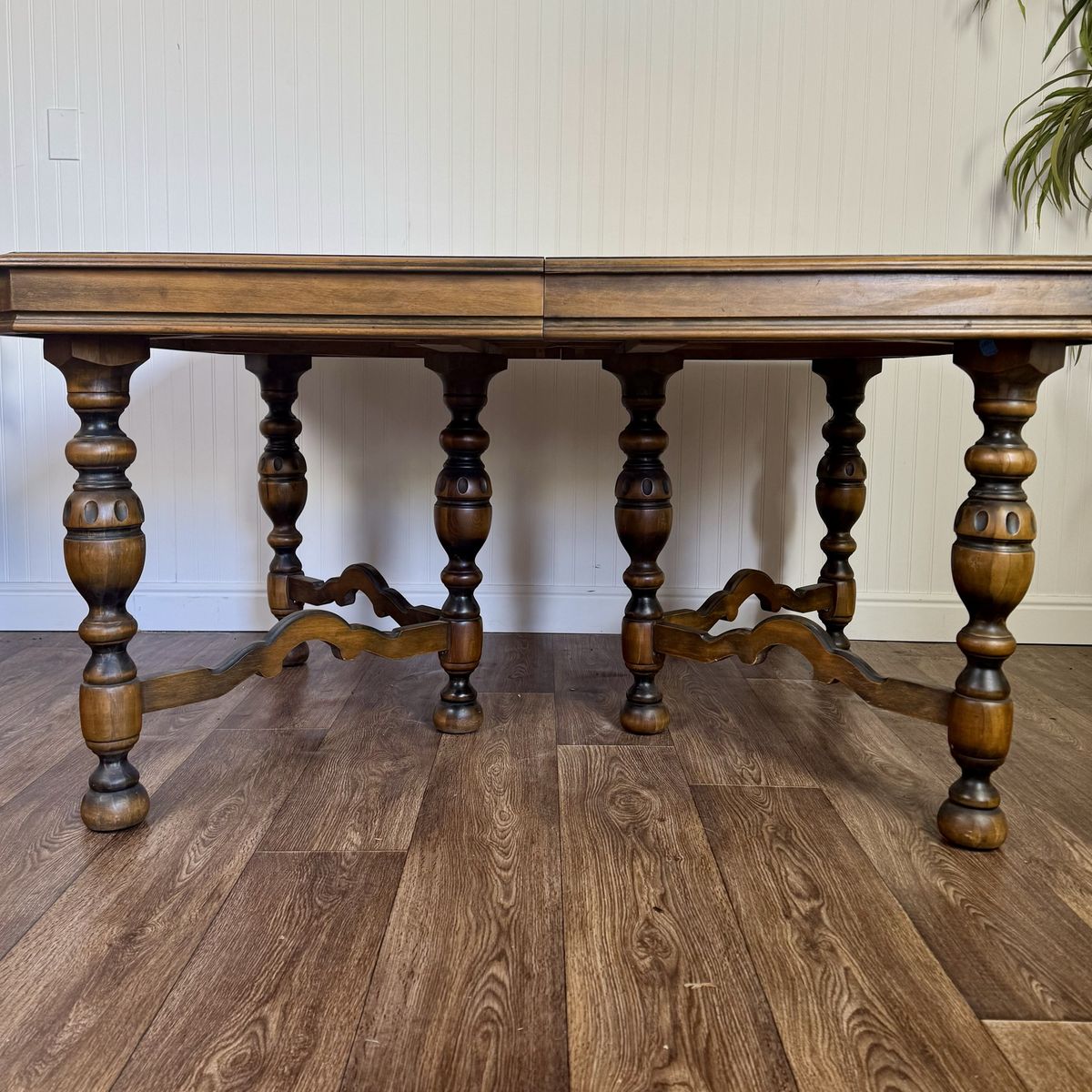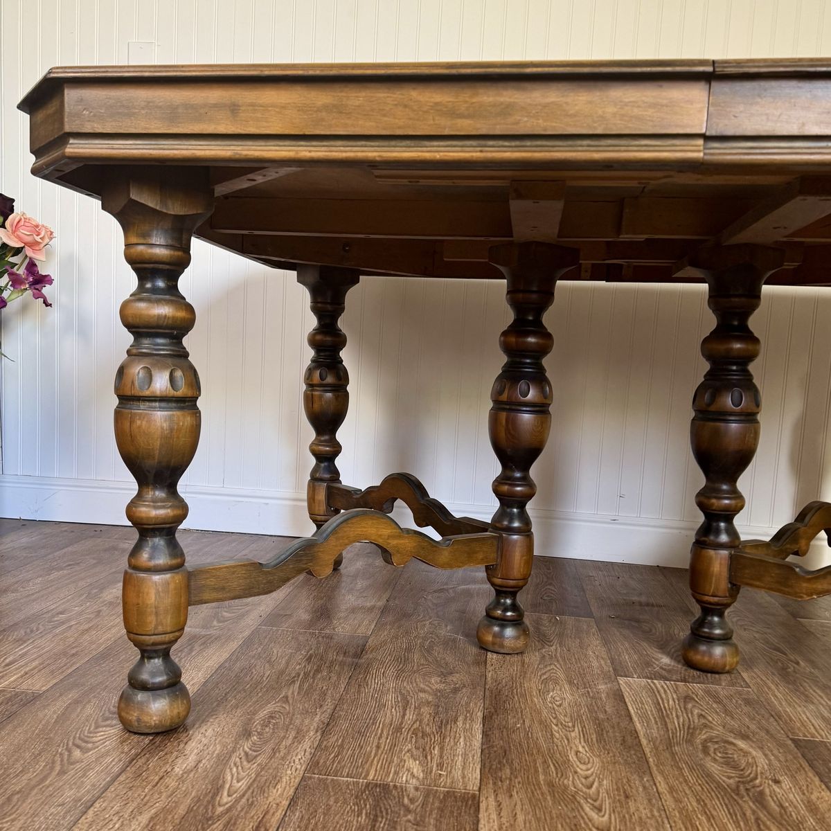 VenmoStunning vintage Jacobean / Spanish revival dining table featuring heavy bulbous turned legs with carved thumbprint details, an elegant clipped-corner rectangular top, and a sturdy H-stretcher base with decorative scrolling. The wood showcases a rich, multi-tonal grain with a warm honey finish and classic dark waxed accents in the carvings.