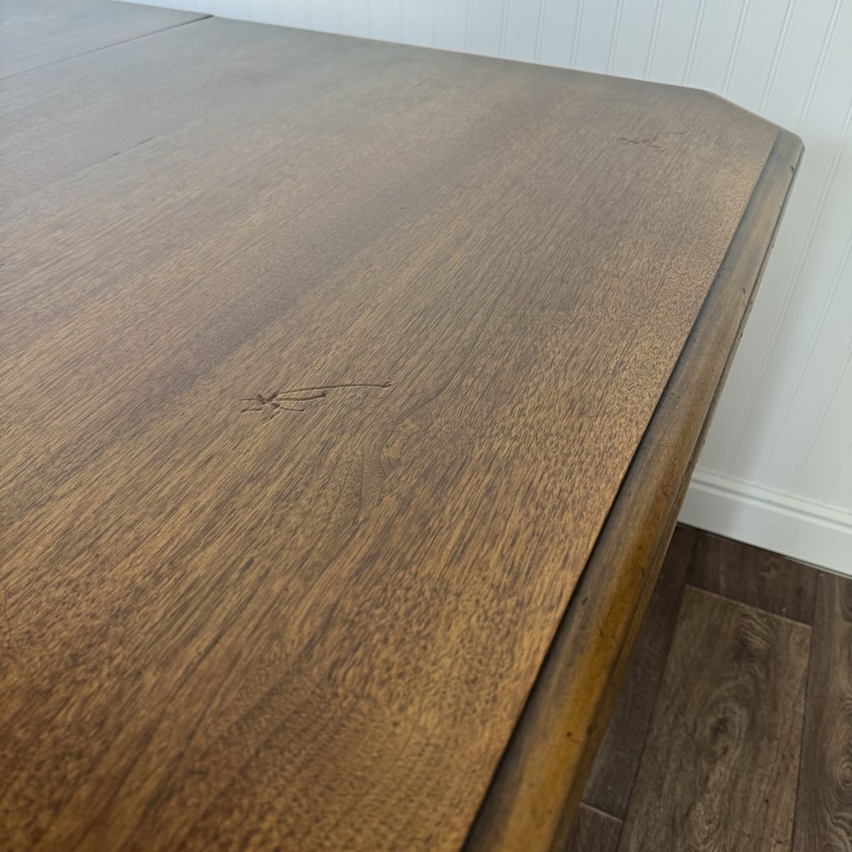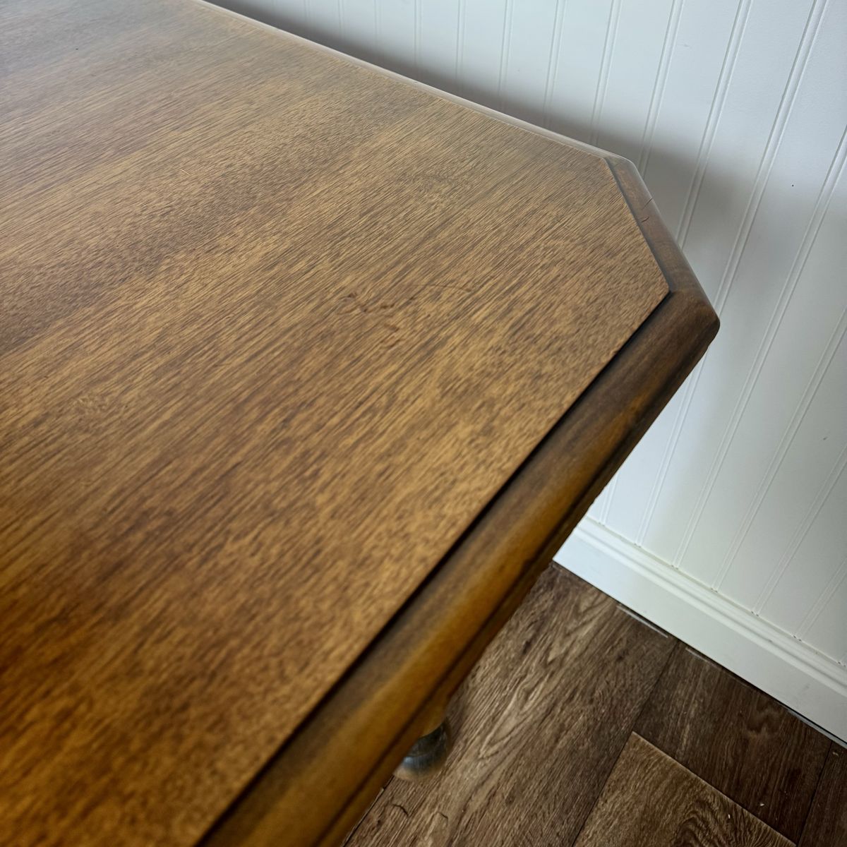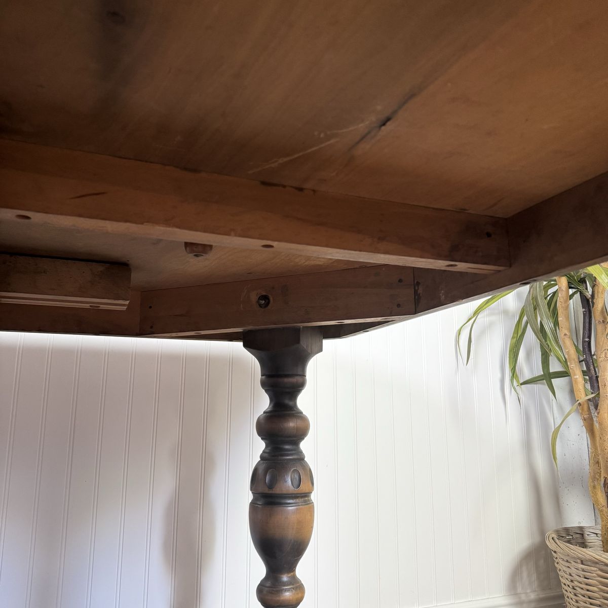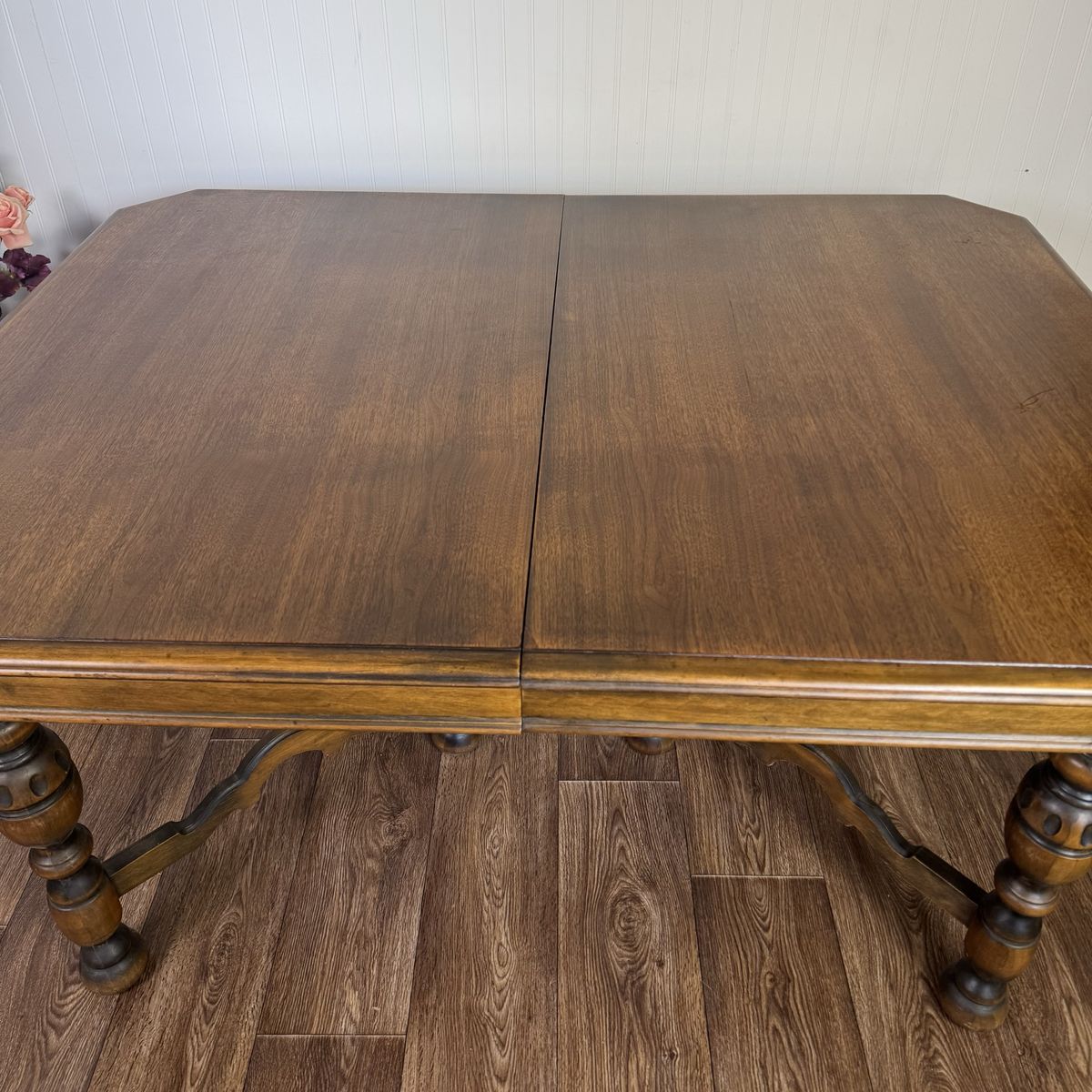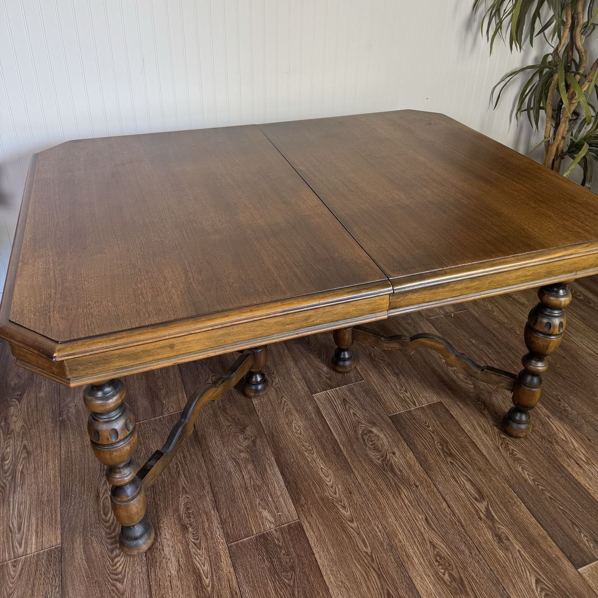 VenmoStunning vintage Jacobean / Spanish revival dining table featuring heavy bulbous turned legs with carved thumbprint details, an elegant clipped-corner rectangular top, and a sturdy H-stretcher base with decorative scrolling. The wood showcases a rich, multi-tonal grain with a warm honey finish and classic dark waxed accents in the carvings.
