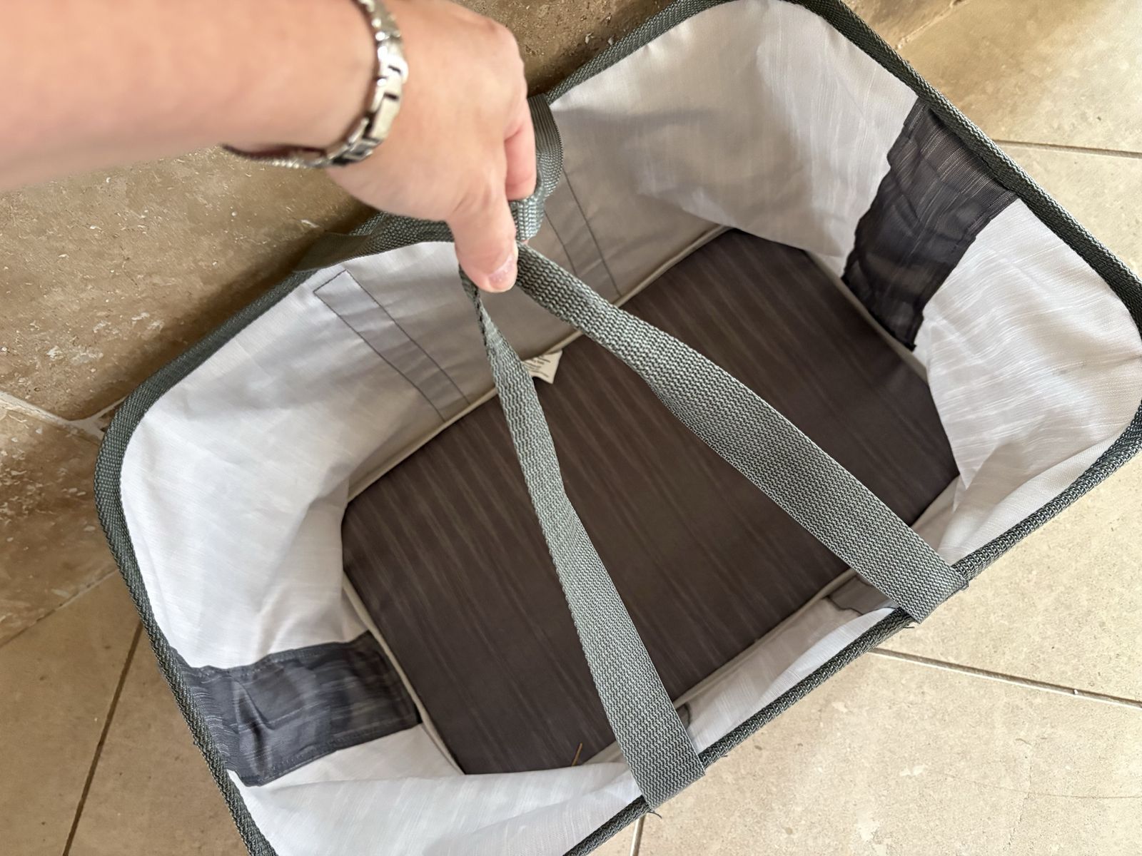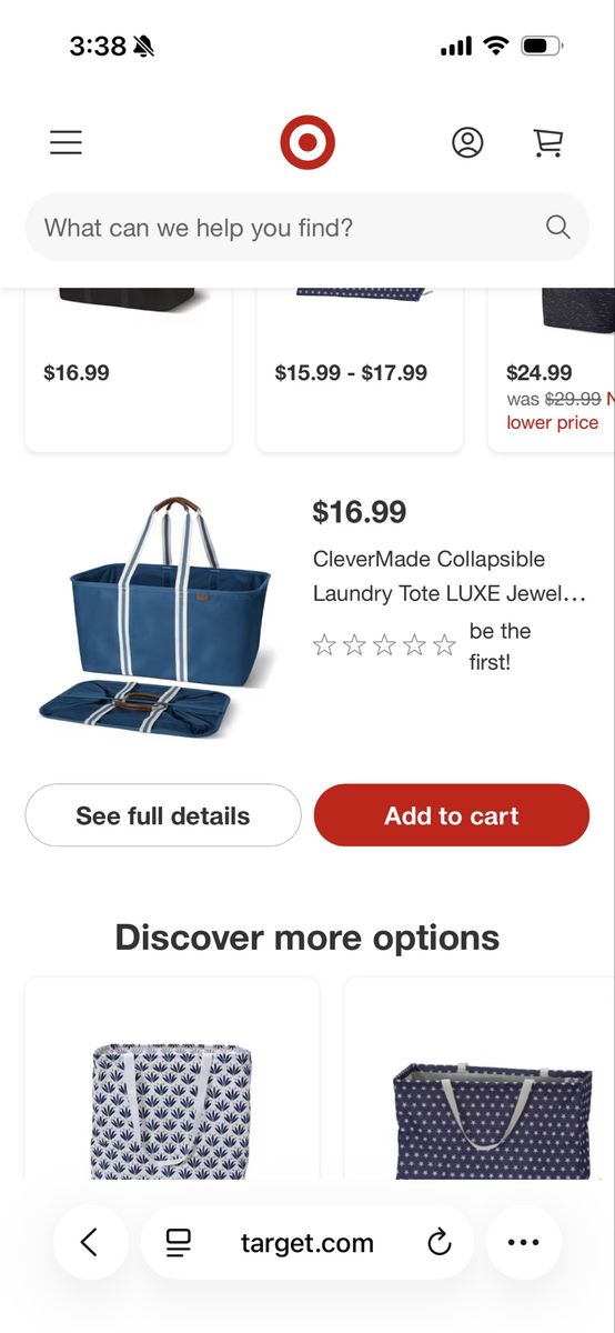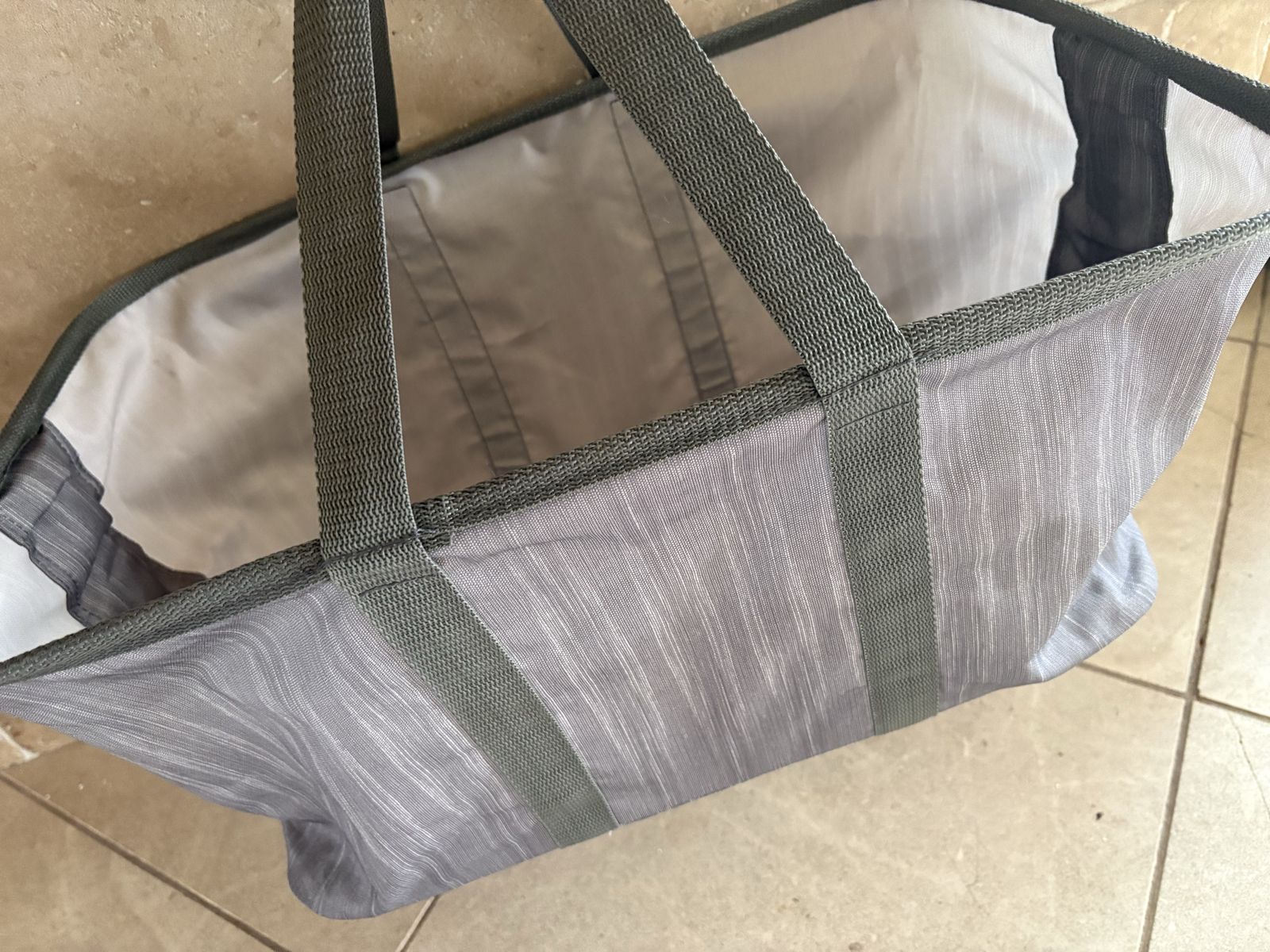 I have a collapsible laundry tote by CleverMade. It could also be used as a shopping bag. It folds down flat. It is 22 inches long and 15 inches wide. It is 11 inches tall without the handles. The last picture shows that they sell at Target for $16.99 plus tax. See my other ads for jewelry, artwork, home decor and more.