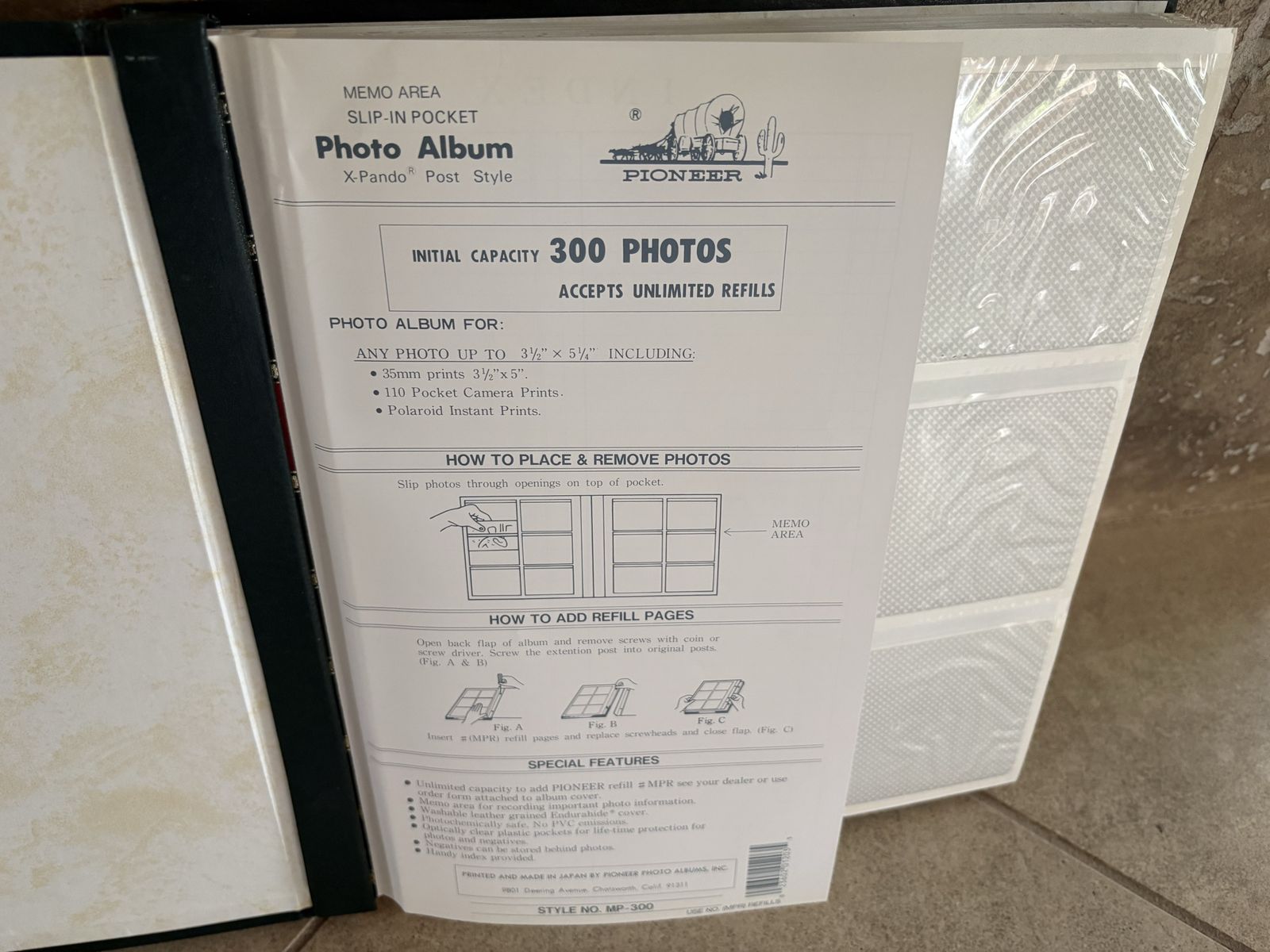 I have a dark green Pioneer photo album with slip in pockets for 300 pictures. You can add more pages. The binder is 13 1/4 inches tall and 12 3/4 inches. It’s in great condition except for a mark on the front cover (see the last picture for a close up). See my other ads for jewelry, artwork, home decor and more.