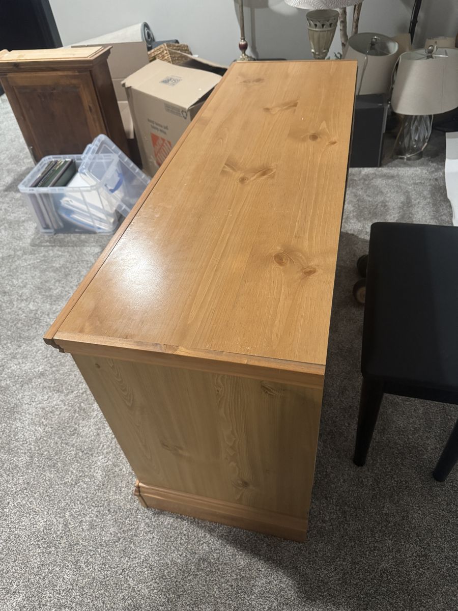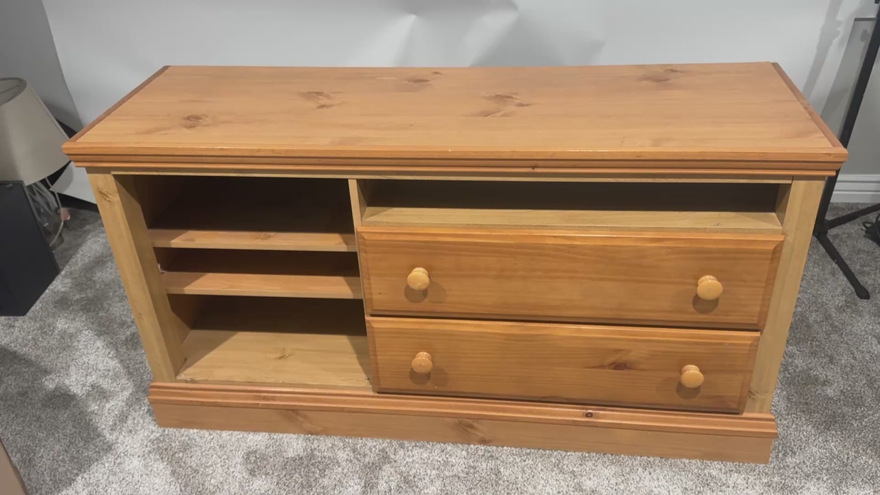 Pine Media Center. Durable. Has 2 great drawers for storage, and shelves for devices. Has a few blemishes but very fuctional. Free to someone who needs it.