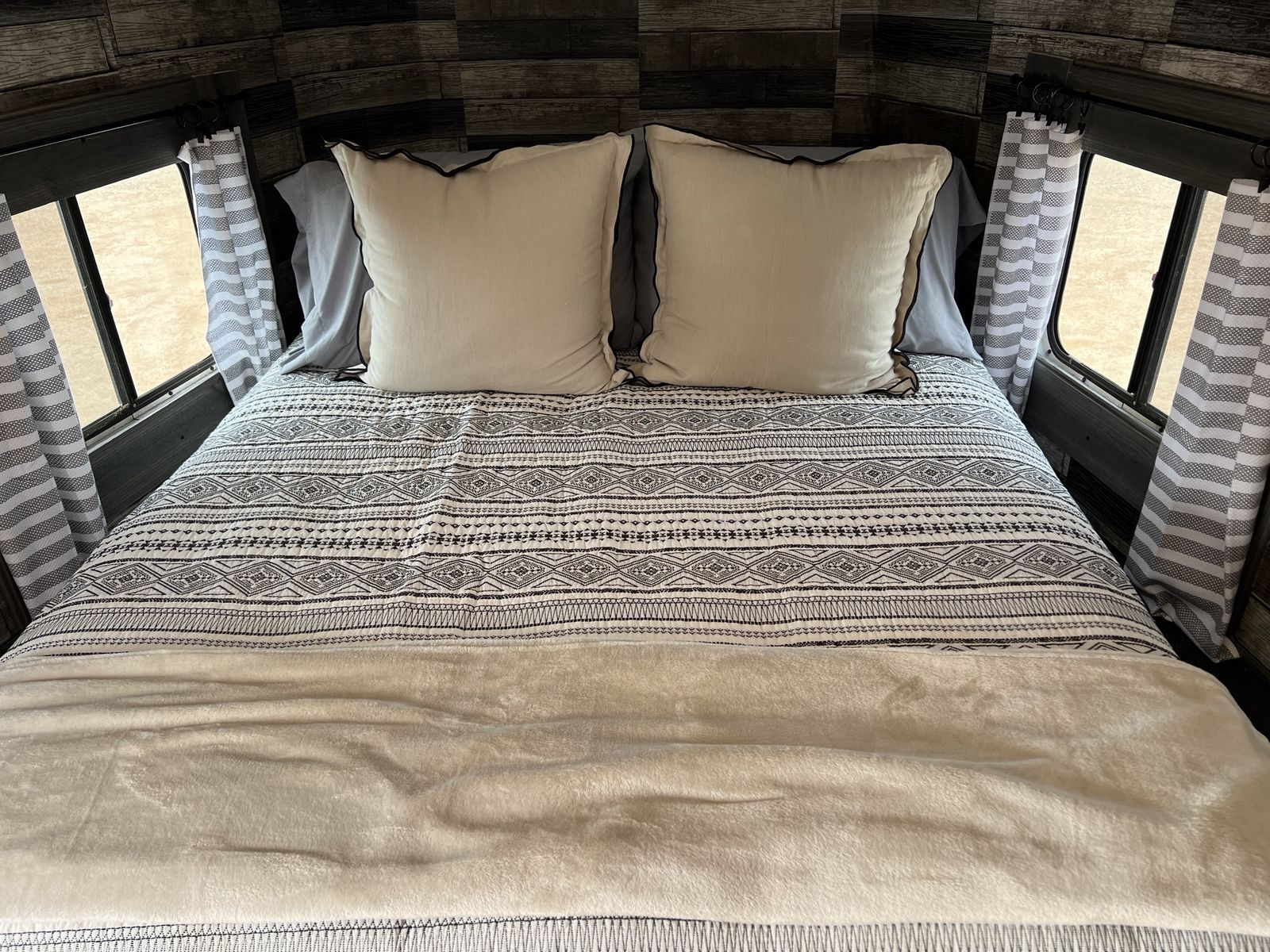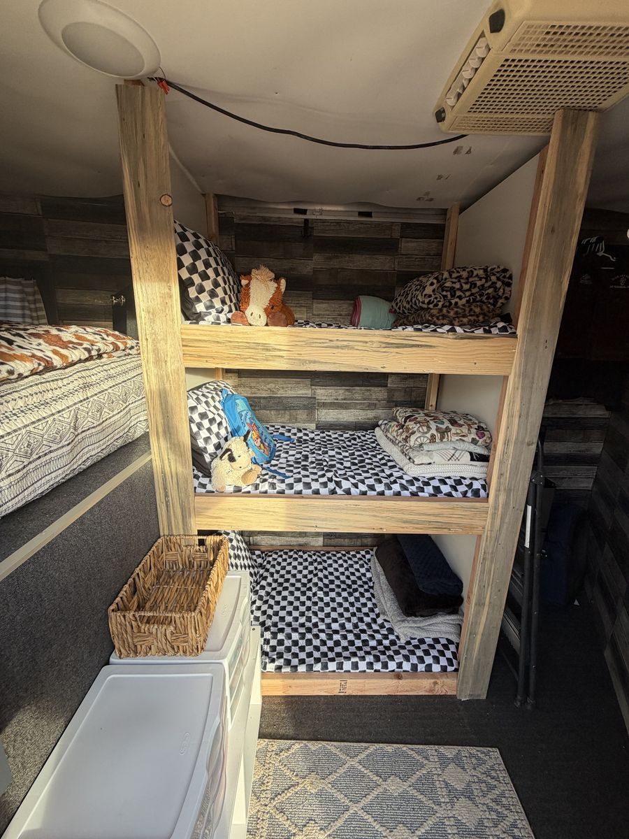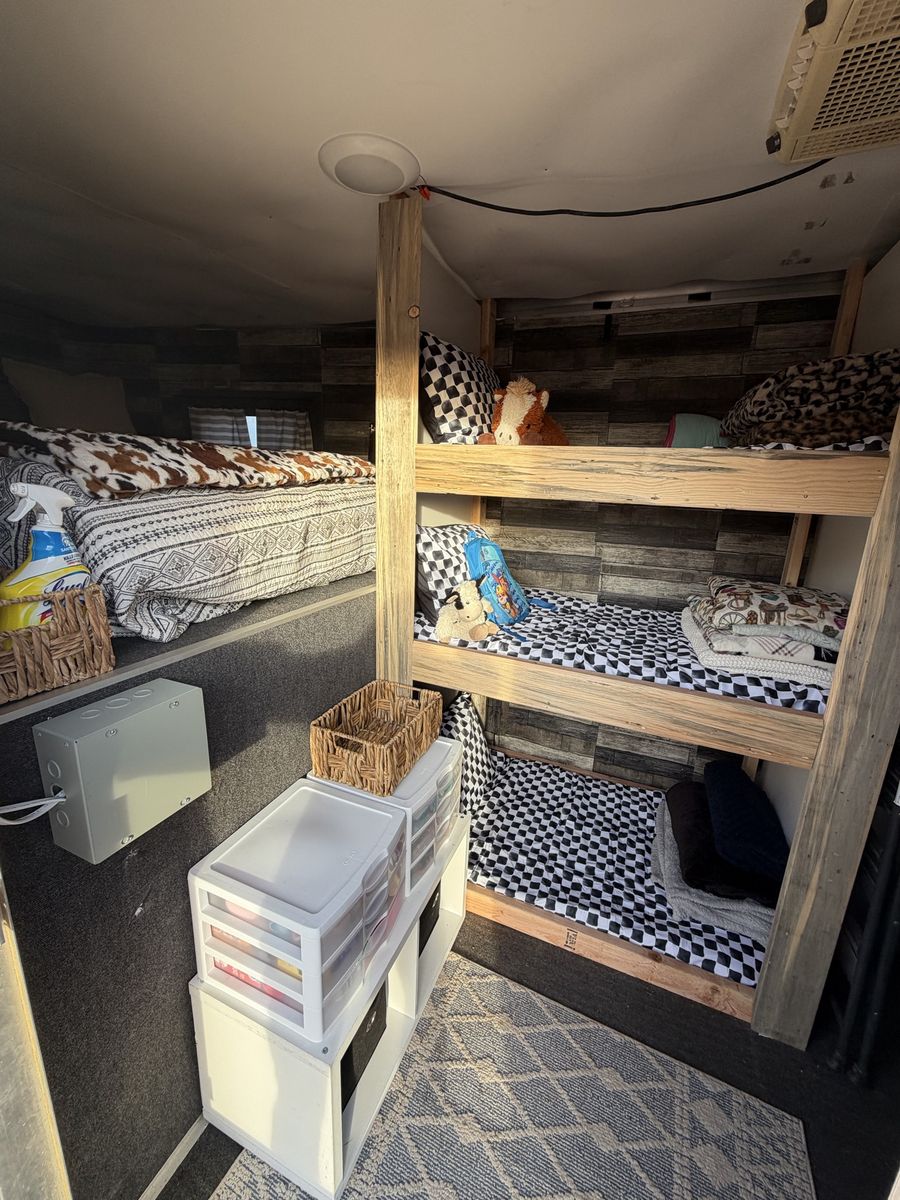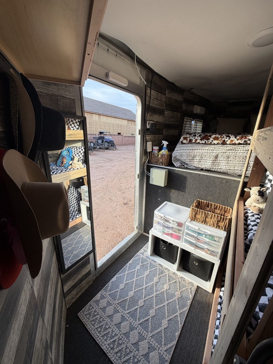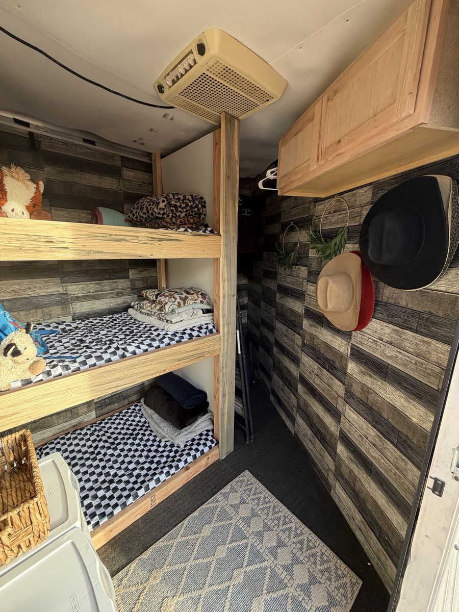 AC works amazing. Light with switch has been installed. As well as cabinets & hooks to hang things such as hats clothing ect. Queen sized bed & 3 bunk beds. Bedding will come on all the beds. You can take the bunks out and use for storage, tack ect or move the kitchen area to one of the bunks.