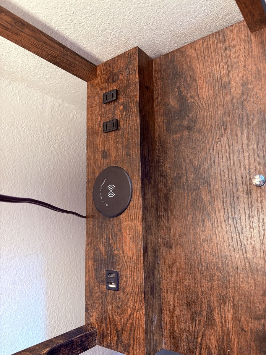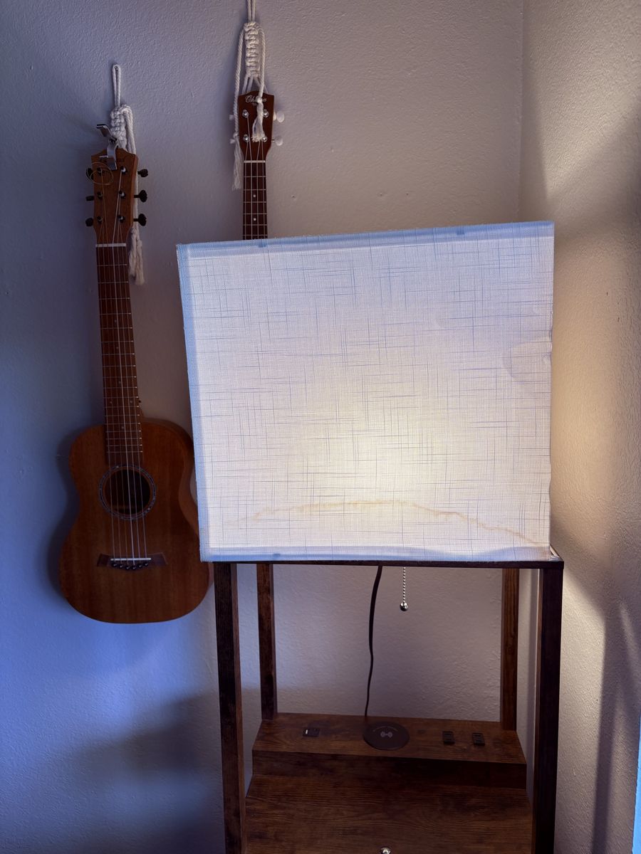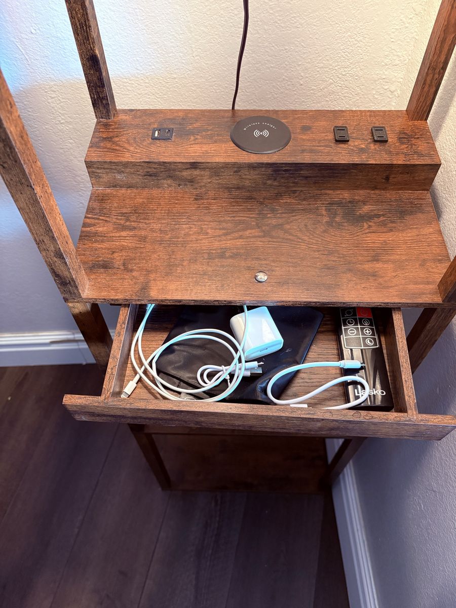 ZelleLamp and shelf with chargers and a small drawer. Some staining on the lamp shade I haven’t tried to get it out. Great condition.